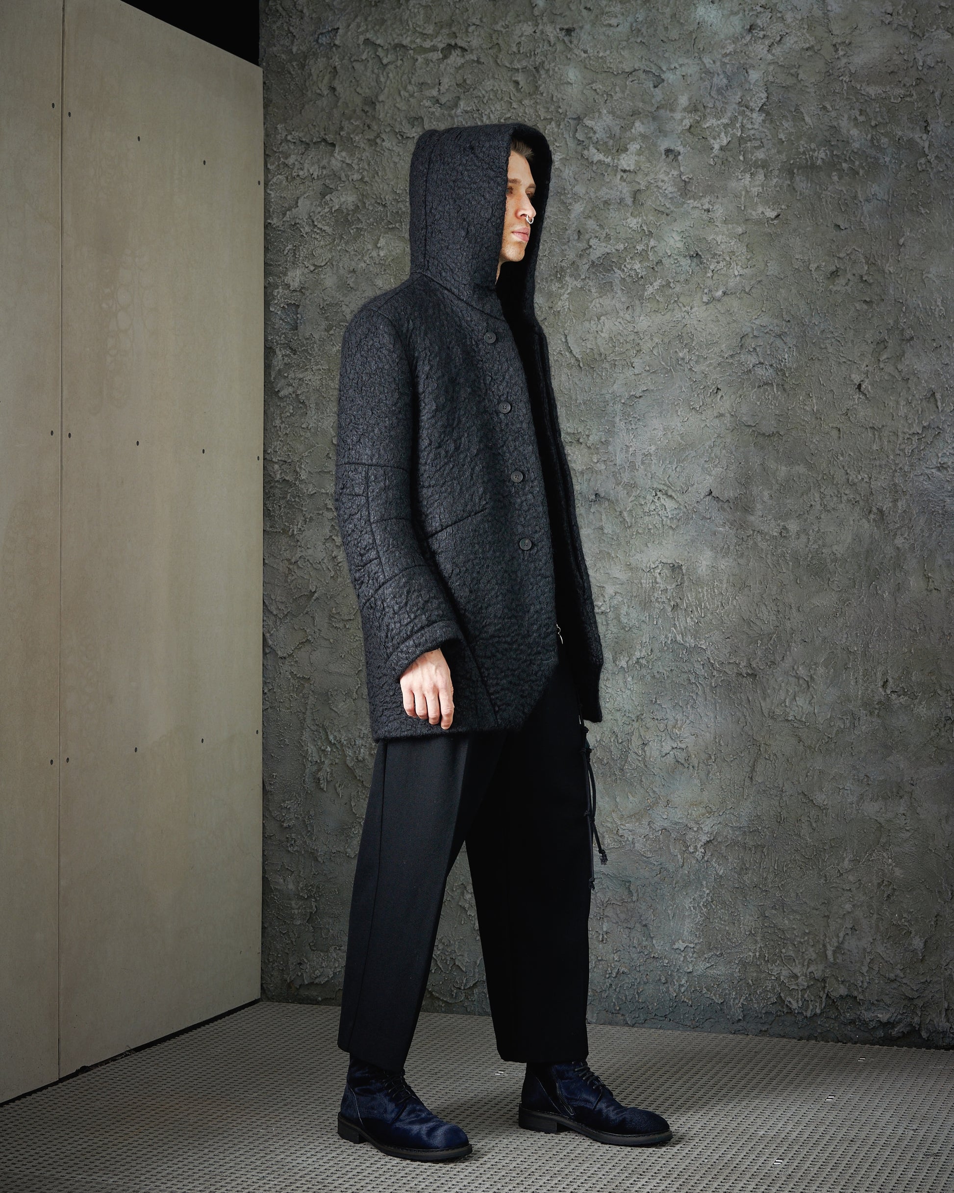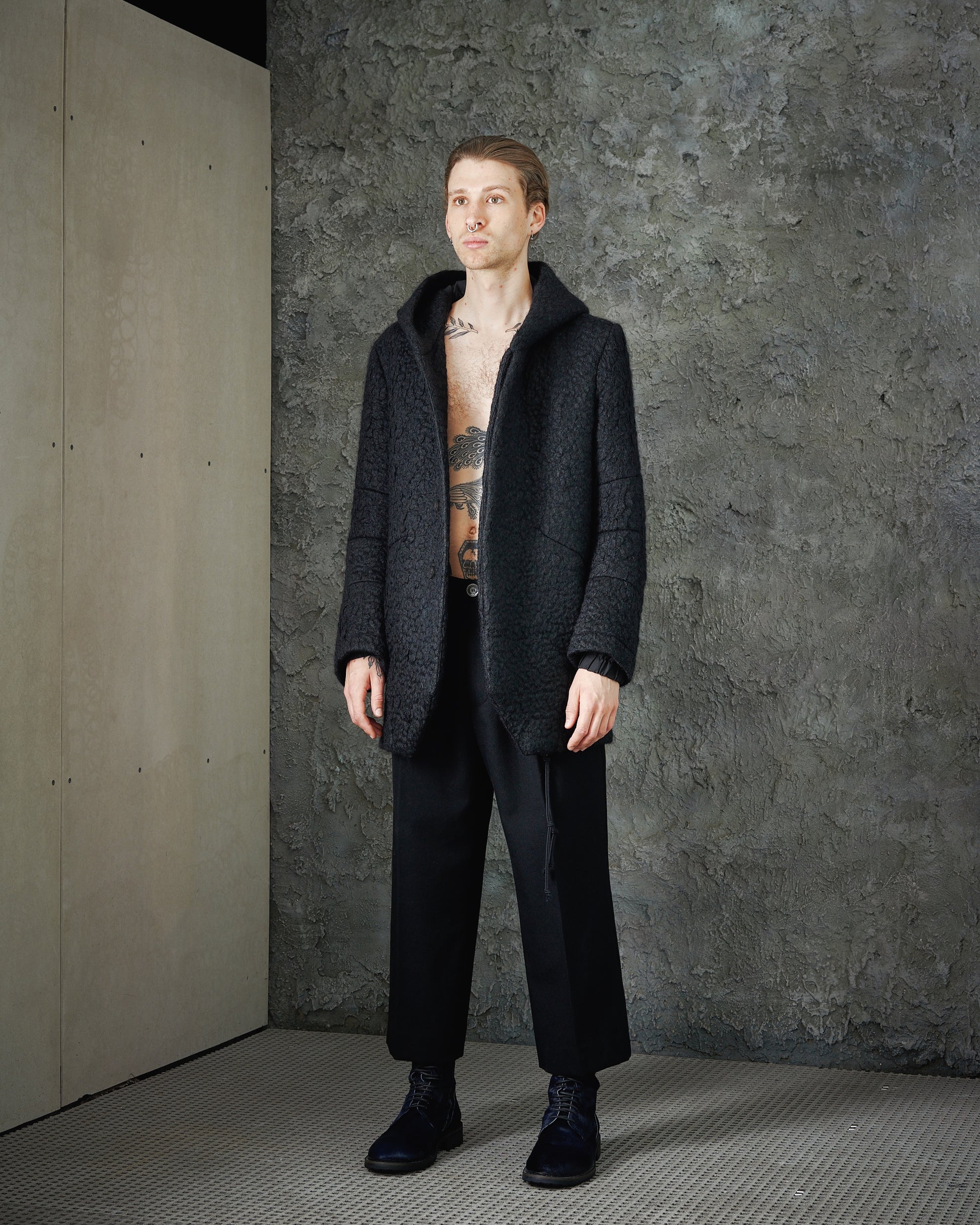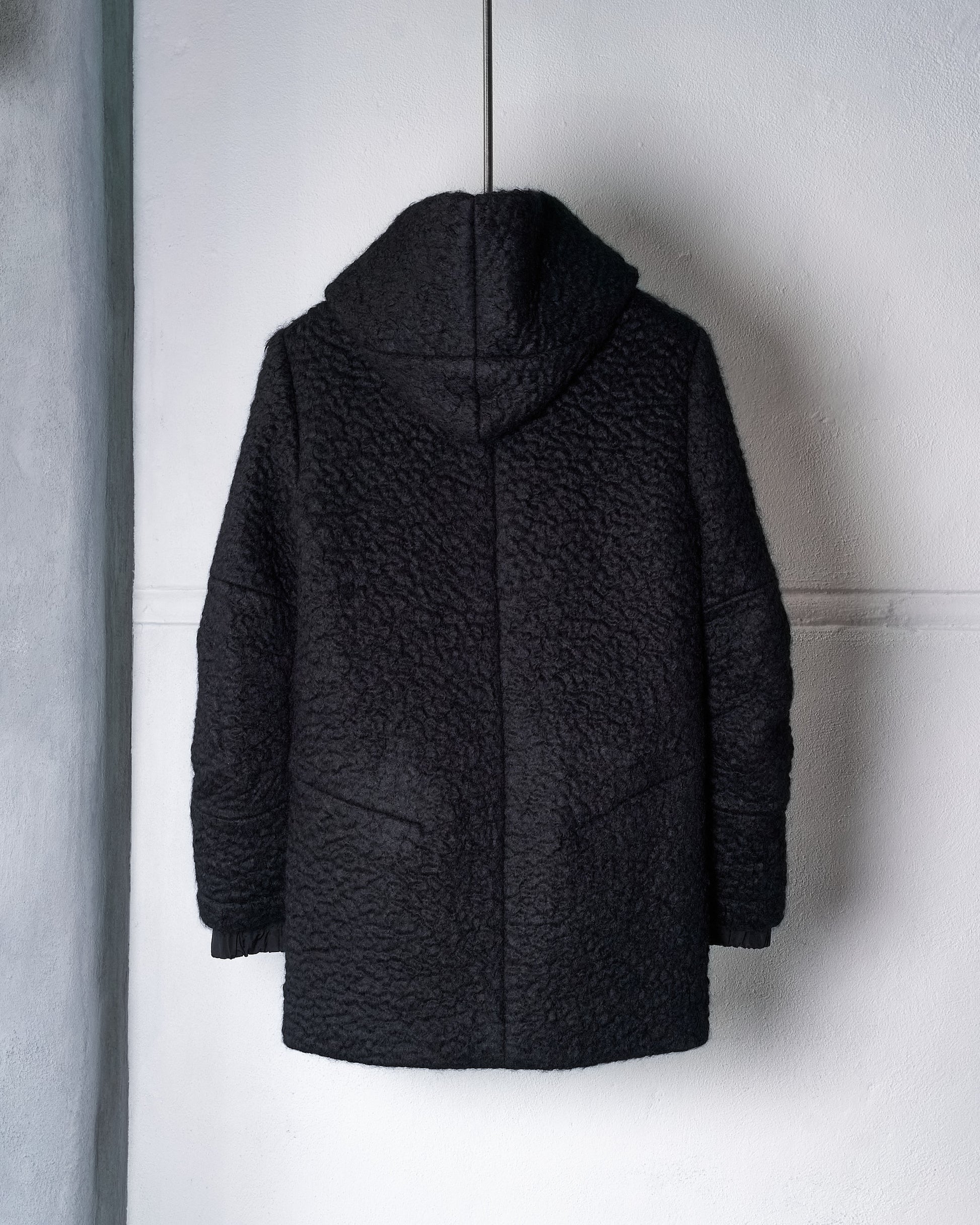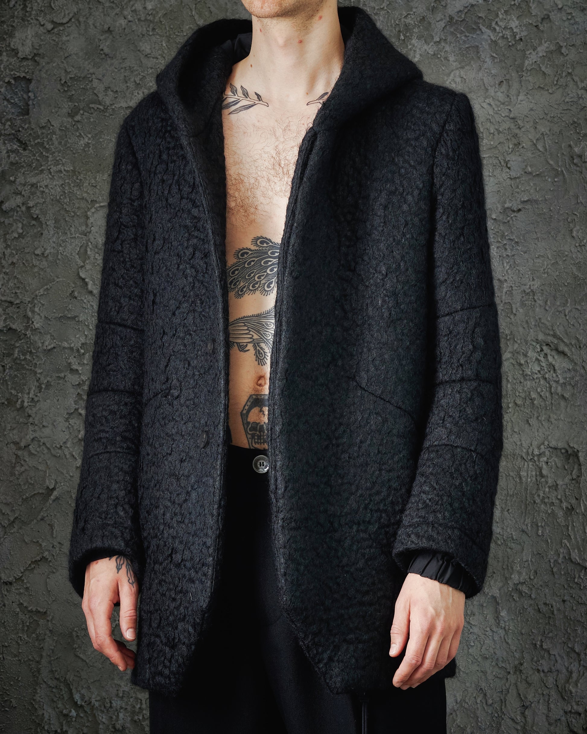 Hooded coat with hidden button closure constructed from a textural mohair blend. Features sculptural darting, elasticised cuffs, two hip pockets. Fully lined. Dry clean only
