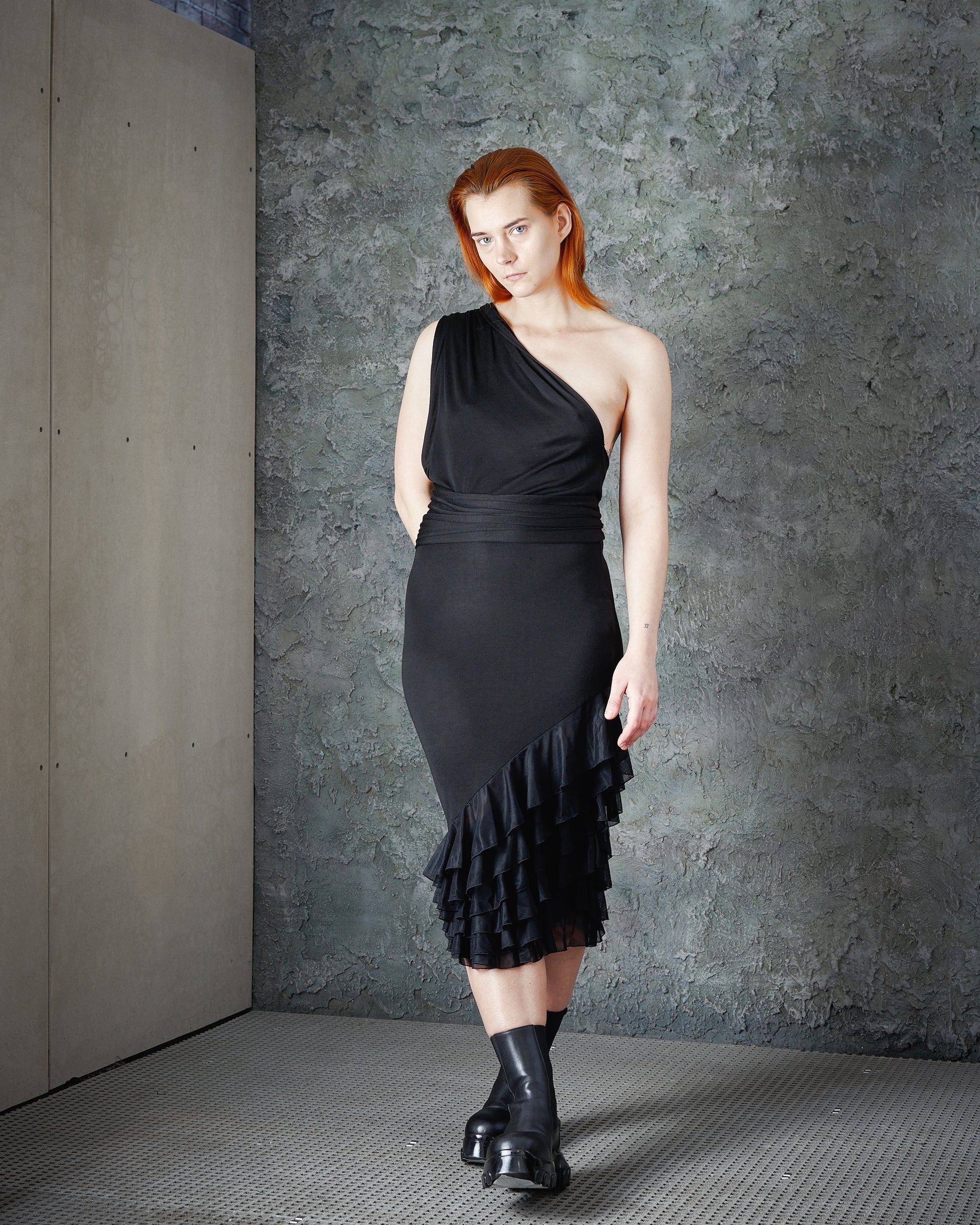 Form-fitting one-shoulder dress cut in a luxuriously soft silk blend fabric. Bias cut, allowing flexibility in fit. Detailed with six symmetric ruffle layers which fall past the knee. The generous shoulder sash can be styled in multiple ways; its trailing fabric can trail or wrap around the waist. Specialist dry clean only