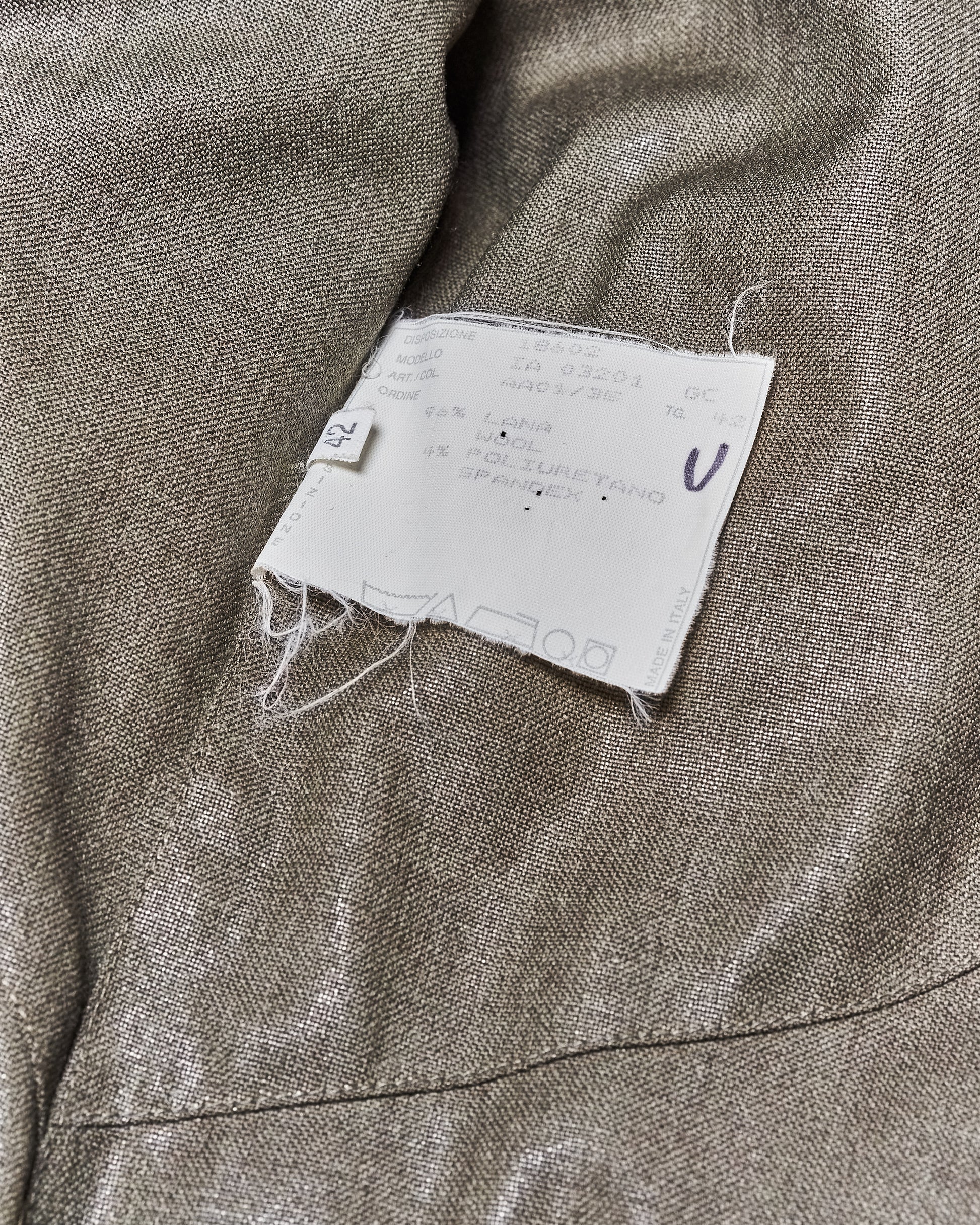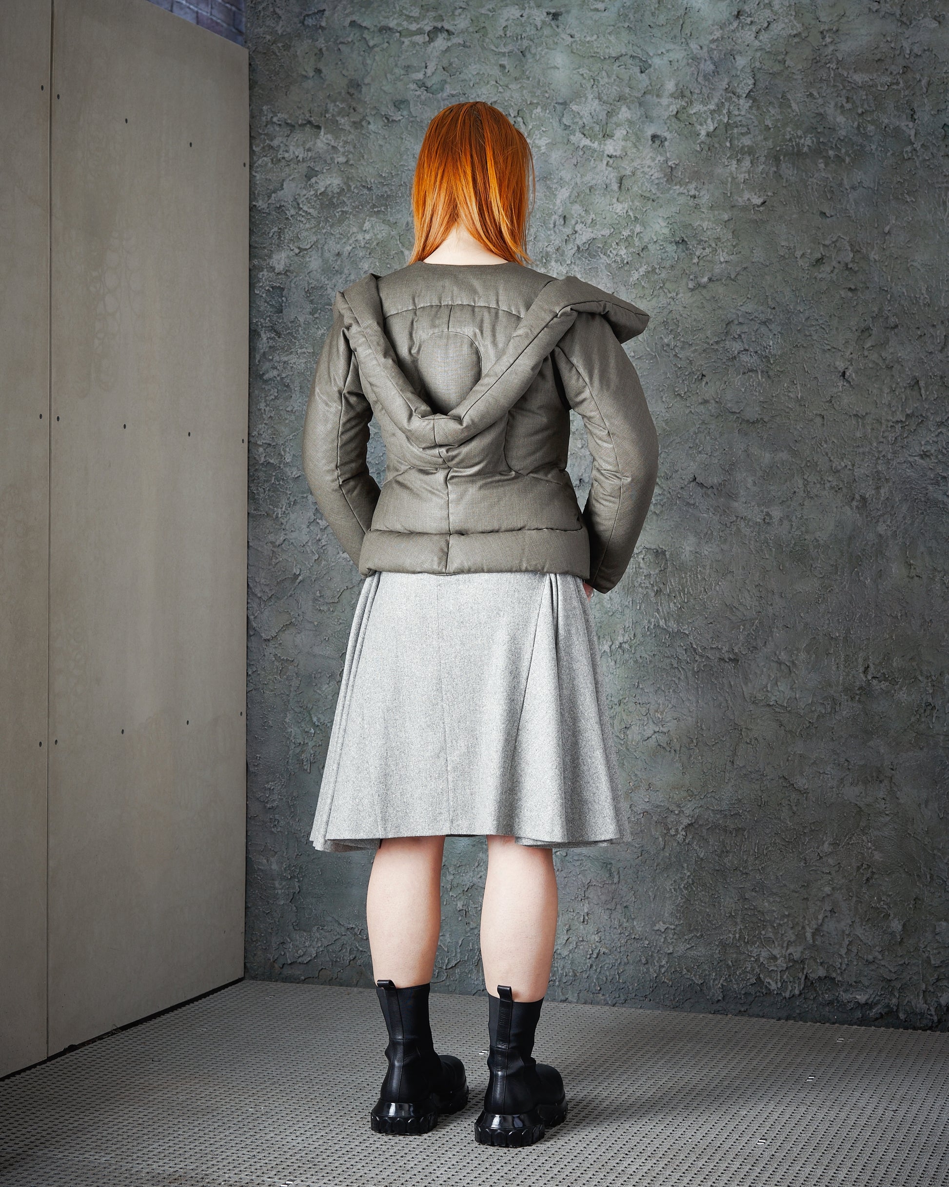 This item is a museum piece presented in exceptional condition. Constructed from a padded wool blend, the curved forms and rounded panels of the piece are reminiscent of a hooded jacket frozen in place. Slim fit with a mid rise and single latch closure on front. PR sample as marked on care tag. Specialist dry clean only