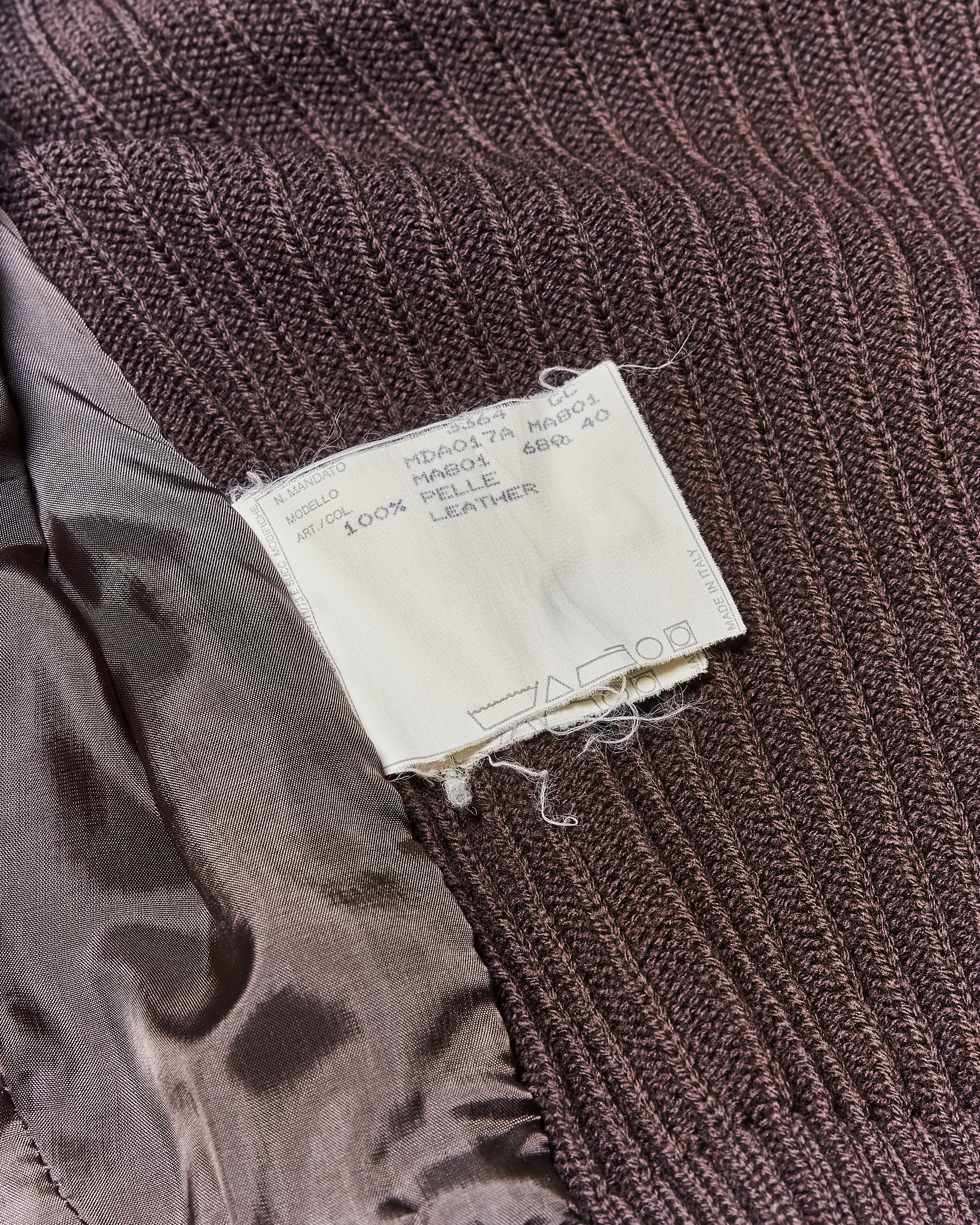 Fitted jacket constructed from leather, suede, and rib knit. Mixed materials bely an effortless elegance and unspoken style. Button front with hidden closure. Ribbed knit collar, sleeves and waist featuring detachable leather belts on the hips and wrists. Belt loops on neck, missing neck belt. Specialist clean only