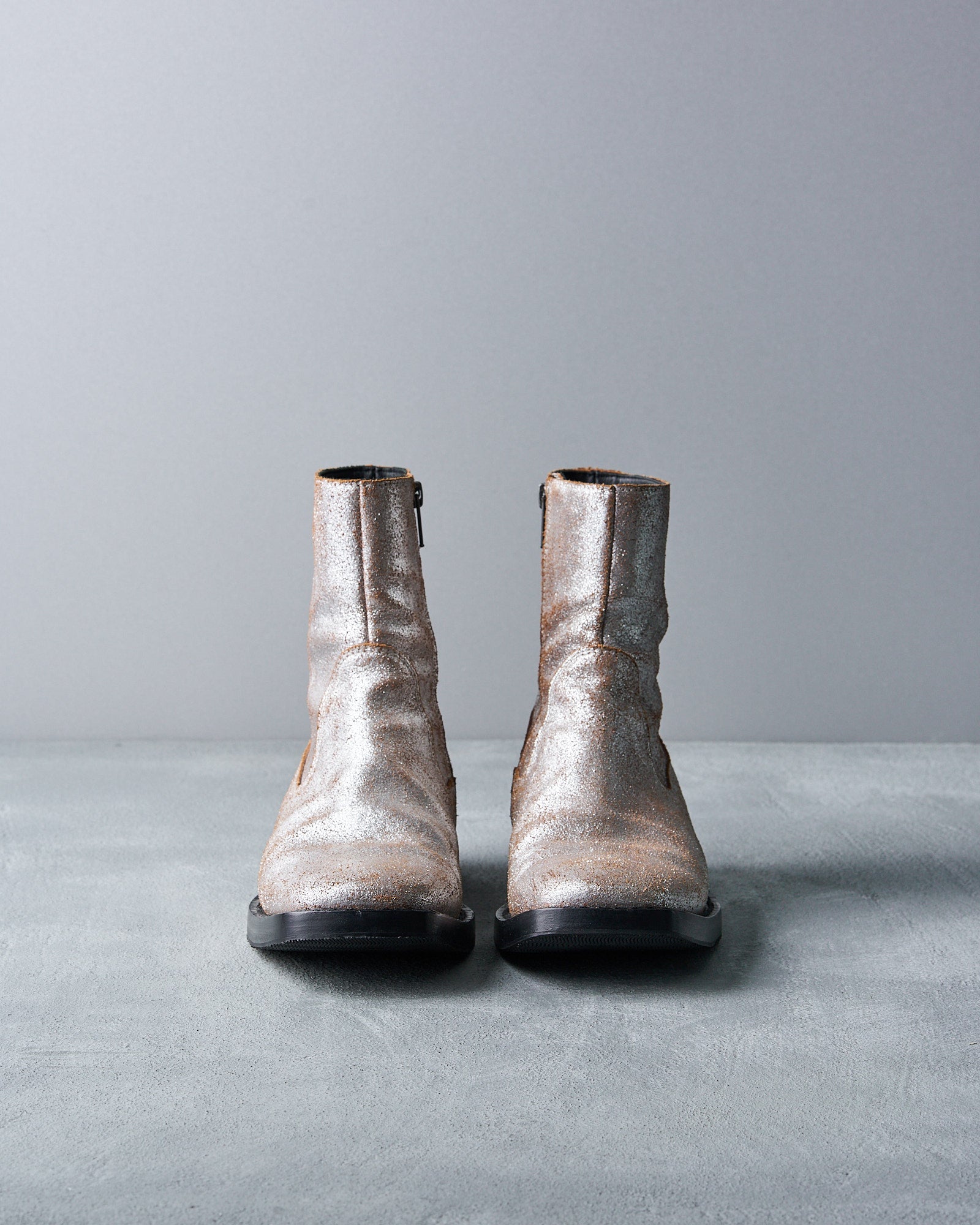 Side-zip ankle boot in silver-leafed tan leather suede. Features a smooth leather interior, black rubber sole with subtle toe spring.