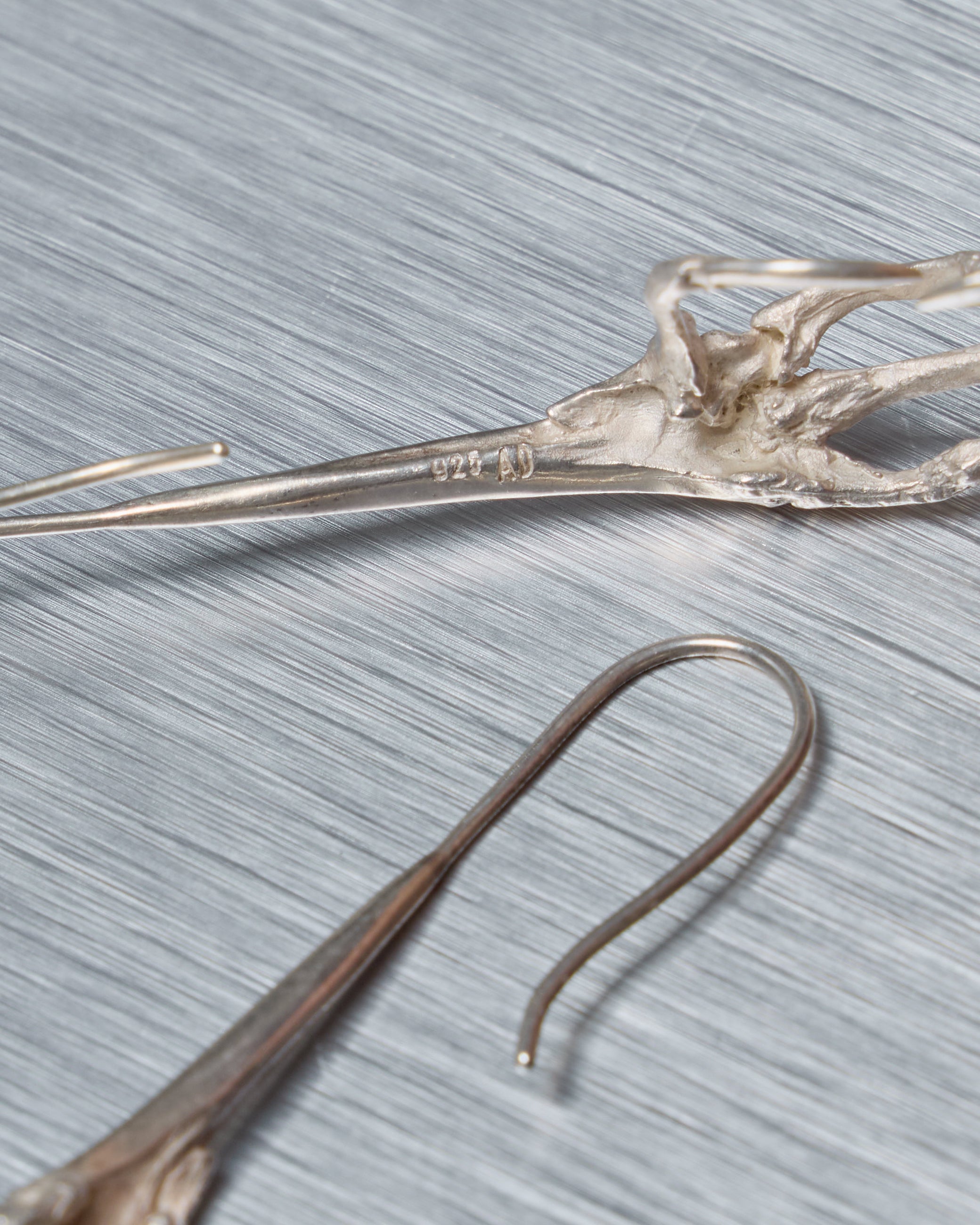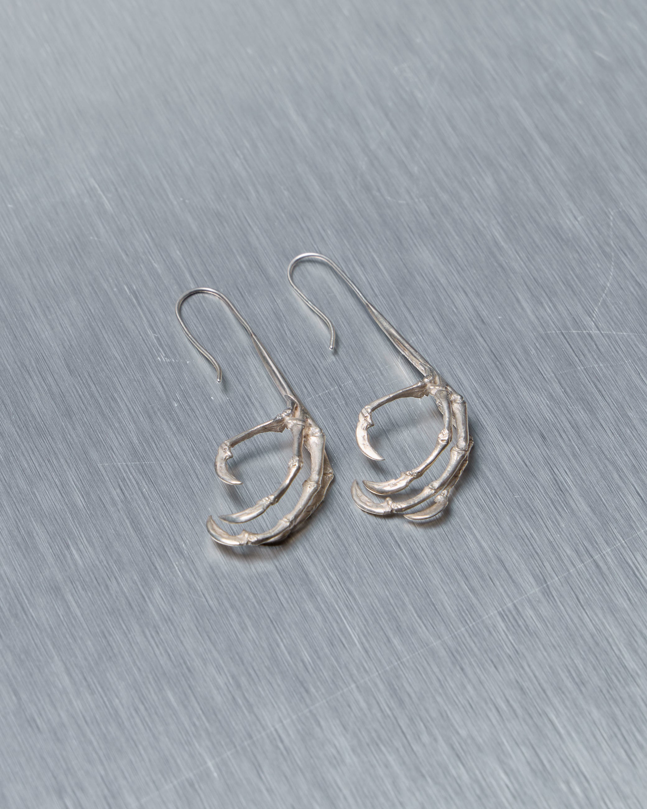 Ann Demeulemeester sterling silver claw earrings, sculpted in a strikingly lifelike bird’s claw form. Designed as long, dangling statement earrings with an organic, gothic edge that reflects the brand’s signature dark romanticism.