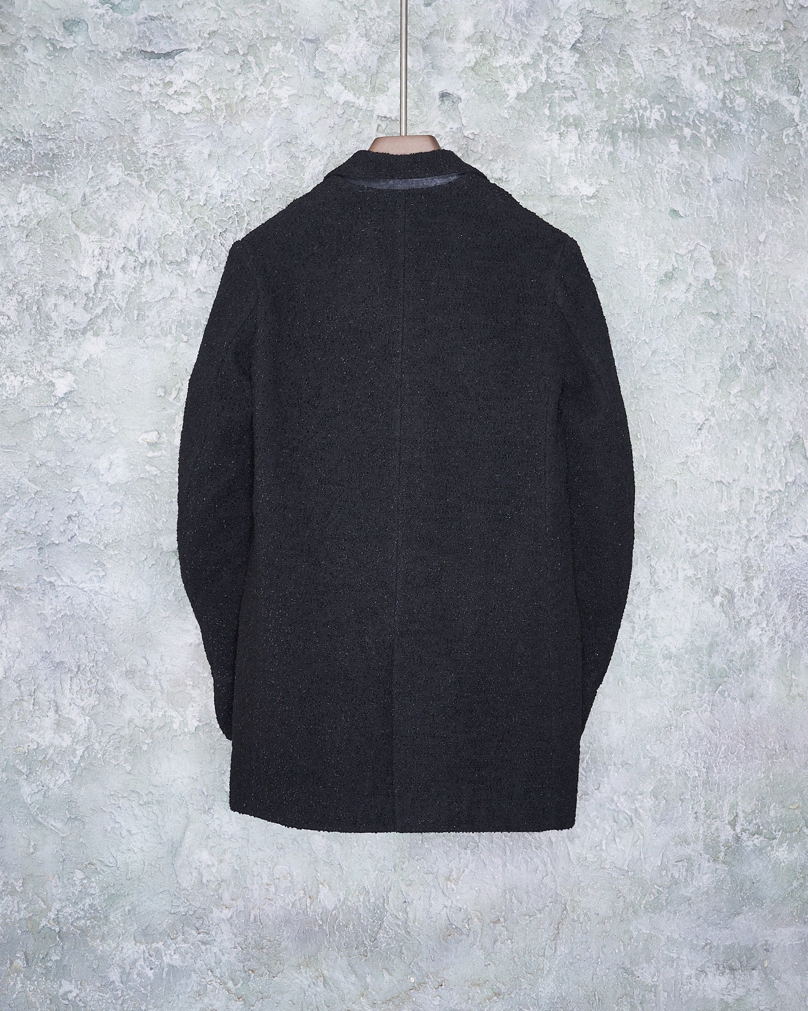 Double breasted heavyweight peacoat with notch lapel. Constructed from a textured durable fleece with satin lining, this piece has two external pockets and a single back vent. Dry clean only.