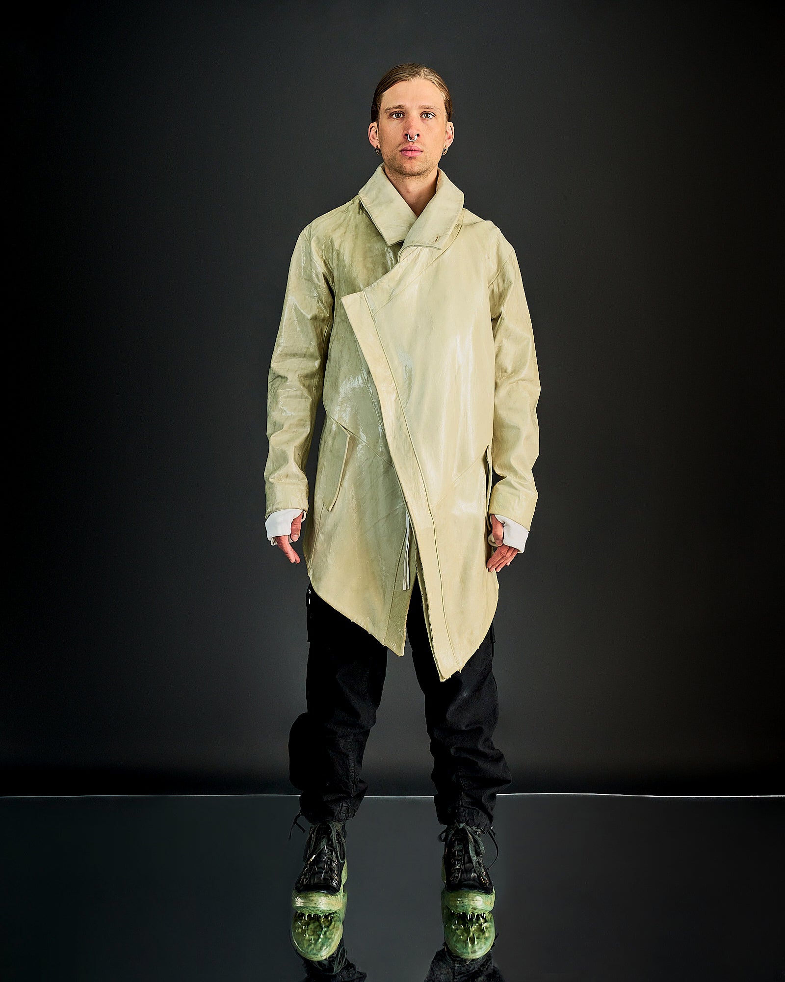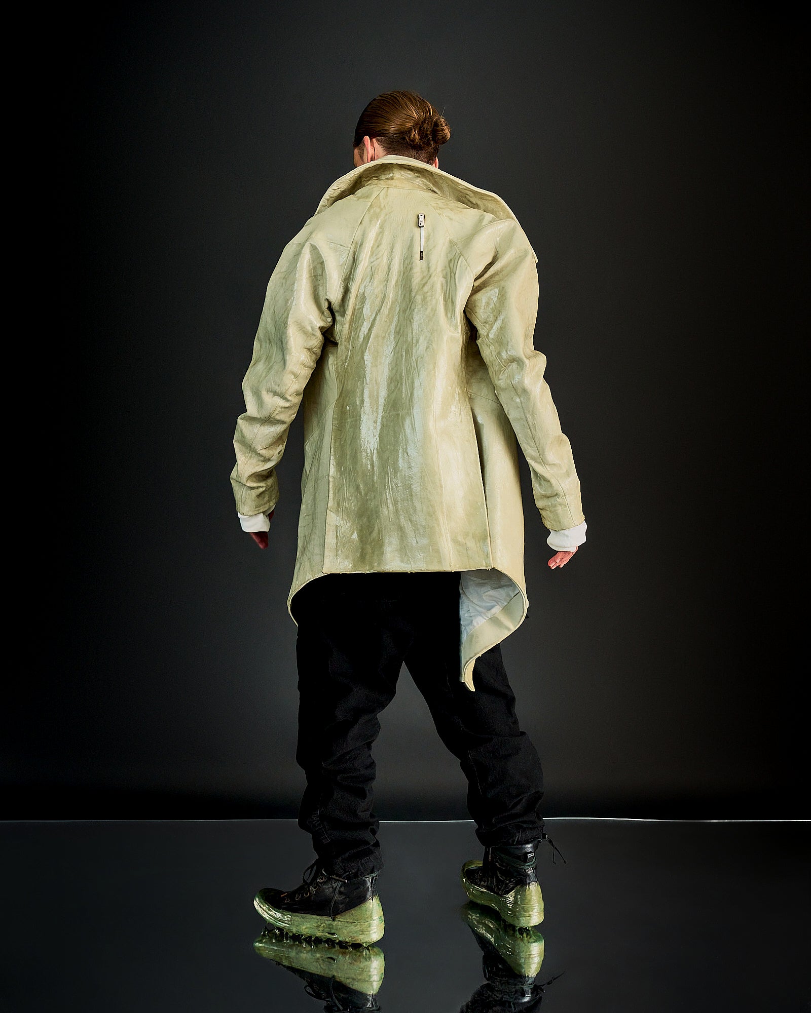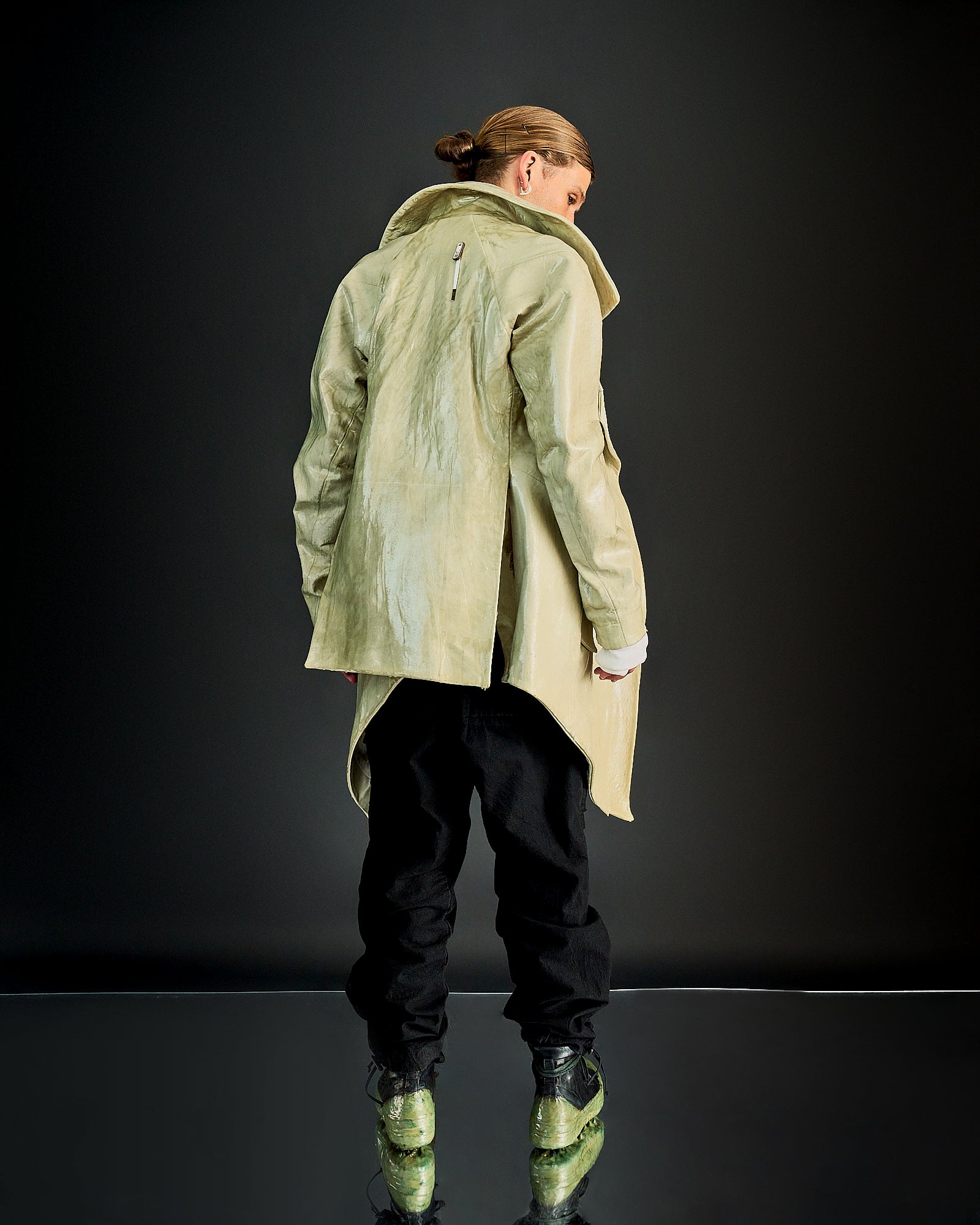 Avant-garde double-breasted jacket in slick heavy lamb leather. Silicone rubber drips sprayed onto the garment adorn the surface. The oversized, raglan-panelled construction and exaggerated lapels give the piece a dramatic and futuristic silhouette. Features a hidden asymmetric four-button front, integrated ribbed gloves, and Saberi's signature silver-aglet lace on the back. Specialist clean only.