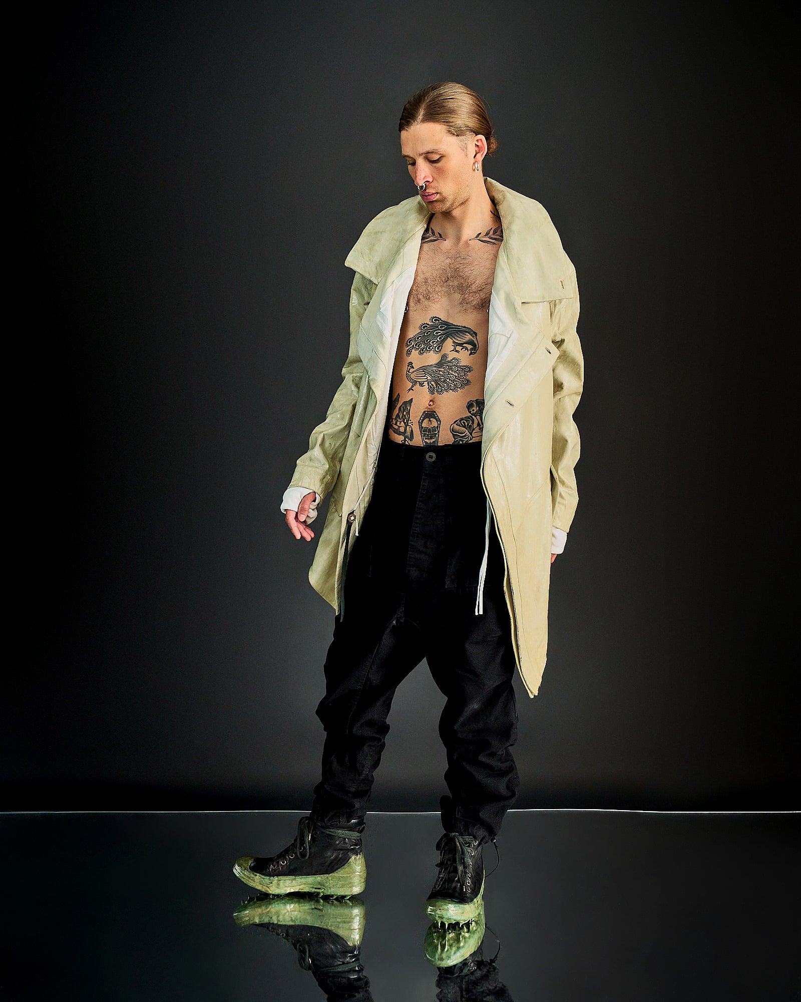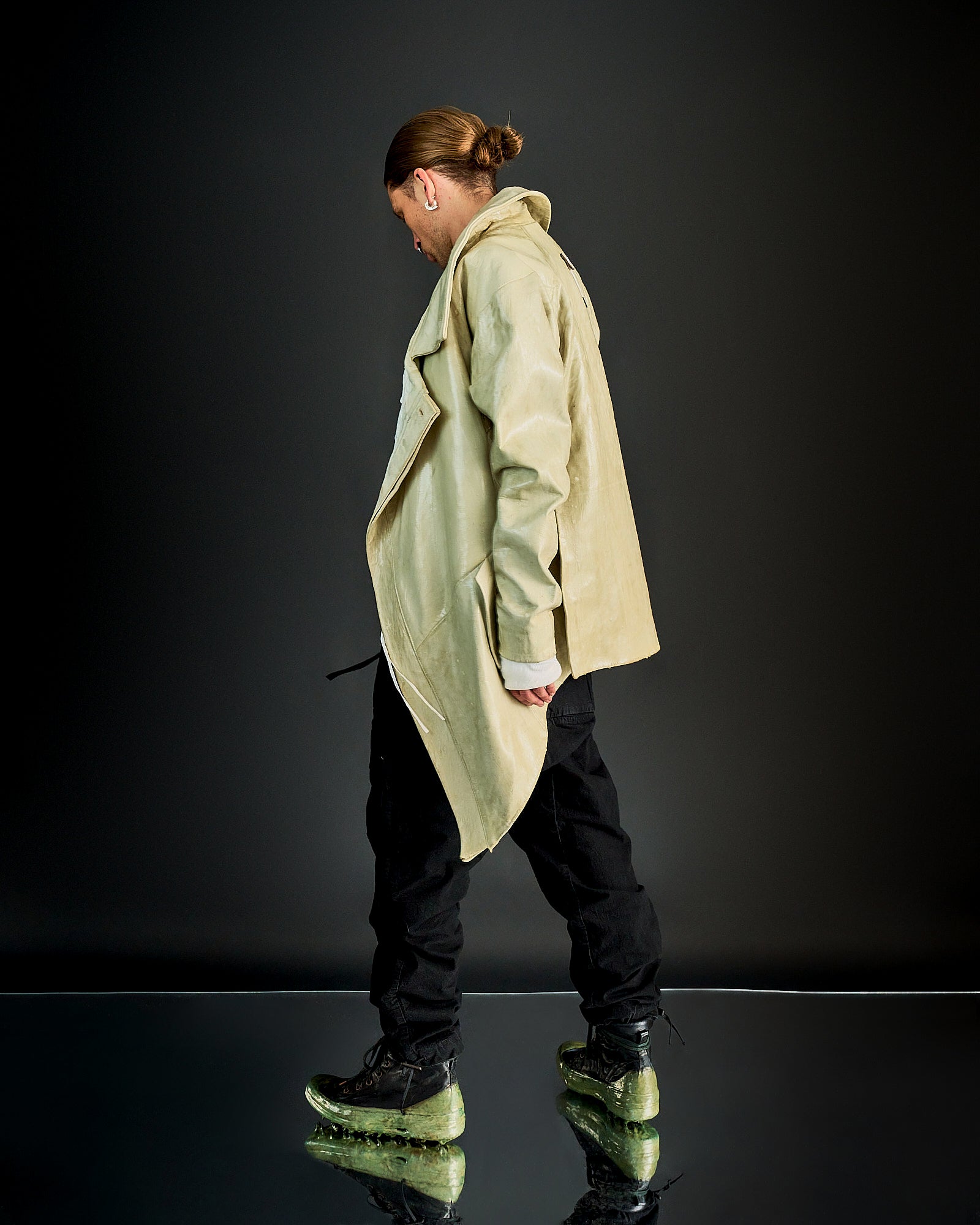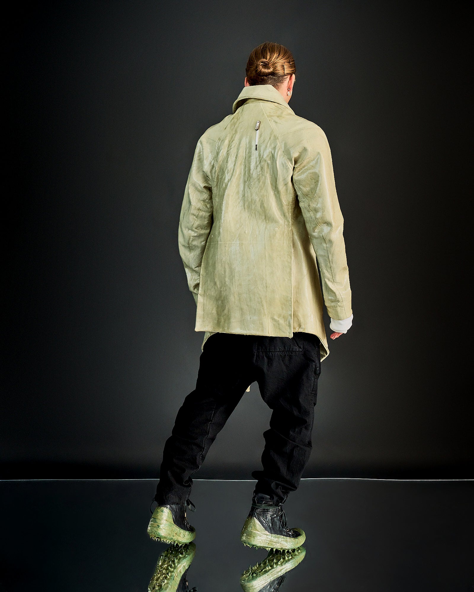 Avant-garde double-breasted jacket in slick heavy lamb leather. Silicone rubber drips sprayed onto the garment adorn the surface. The oversized, raglan-panelled construction and exaggerated lapels give the piece a dramatic and futuristic silhouette. Features a hidden asymmetric four-button front, integrated ribbed gloves, and Saberi's signature silver-aglet lace on the back. Specialist clean only.