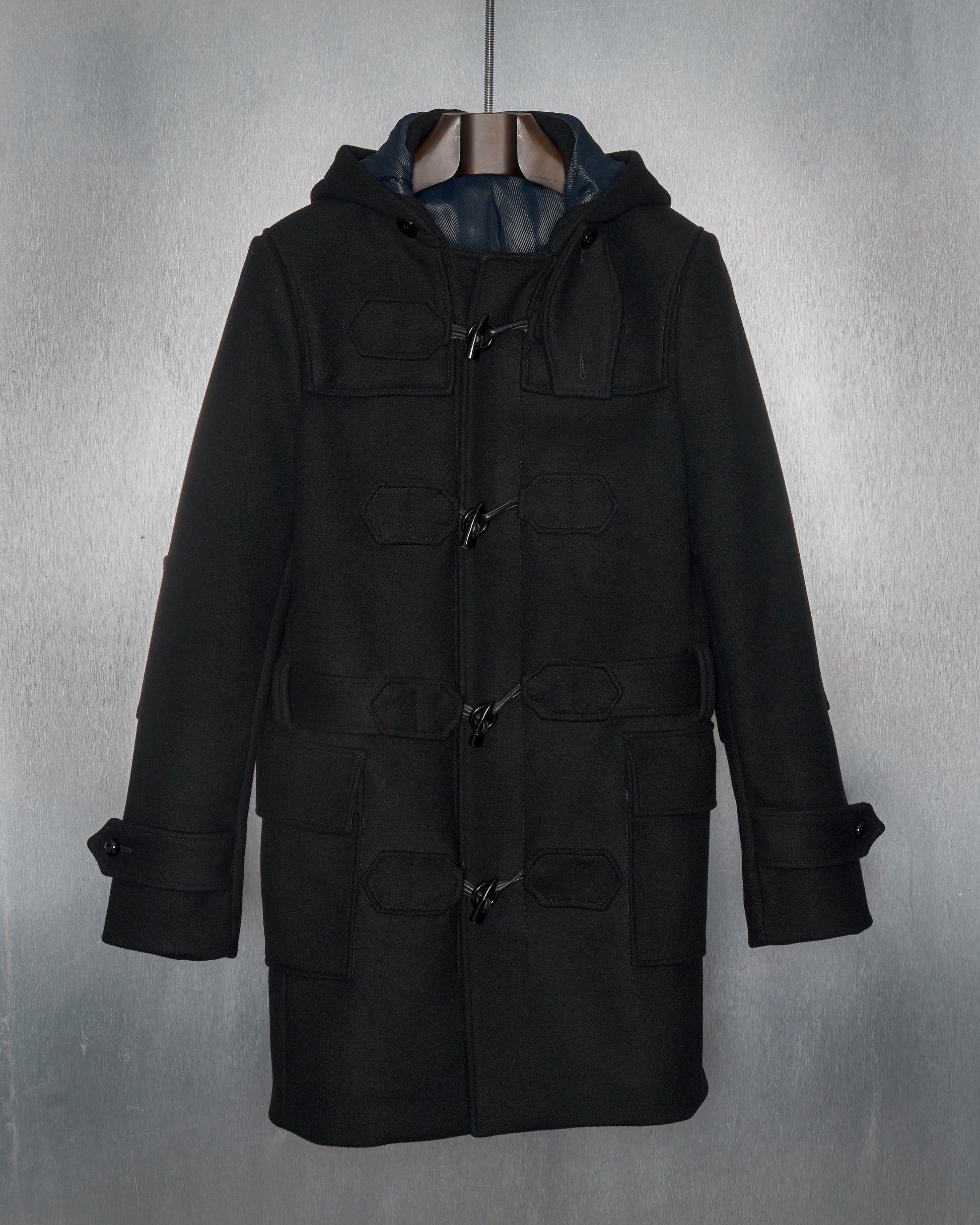 Heavyweight hooded duffle coat in wool felt. The slim shoulder and straight drop provides a flattering silhouette with room for light layers beneath. Features four enamelled metal toggle closures with leather loops, large hood with button collar, two external pockets, one internal pocket. Soft lining throughout. Dry clean only