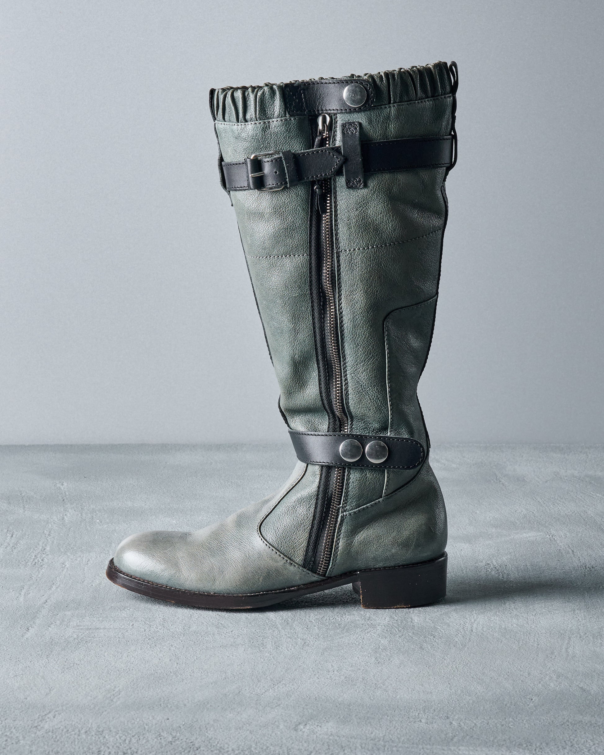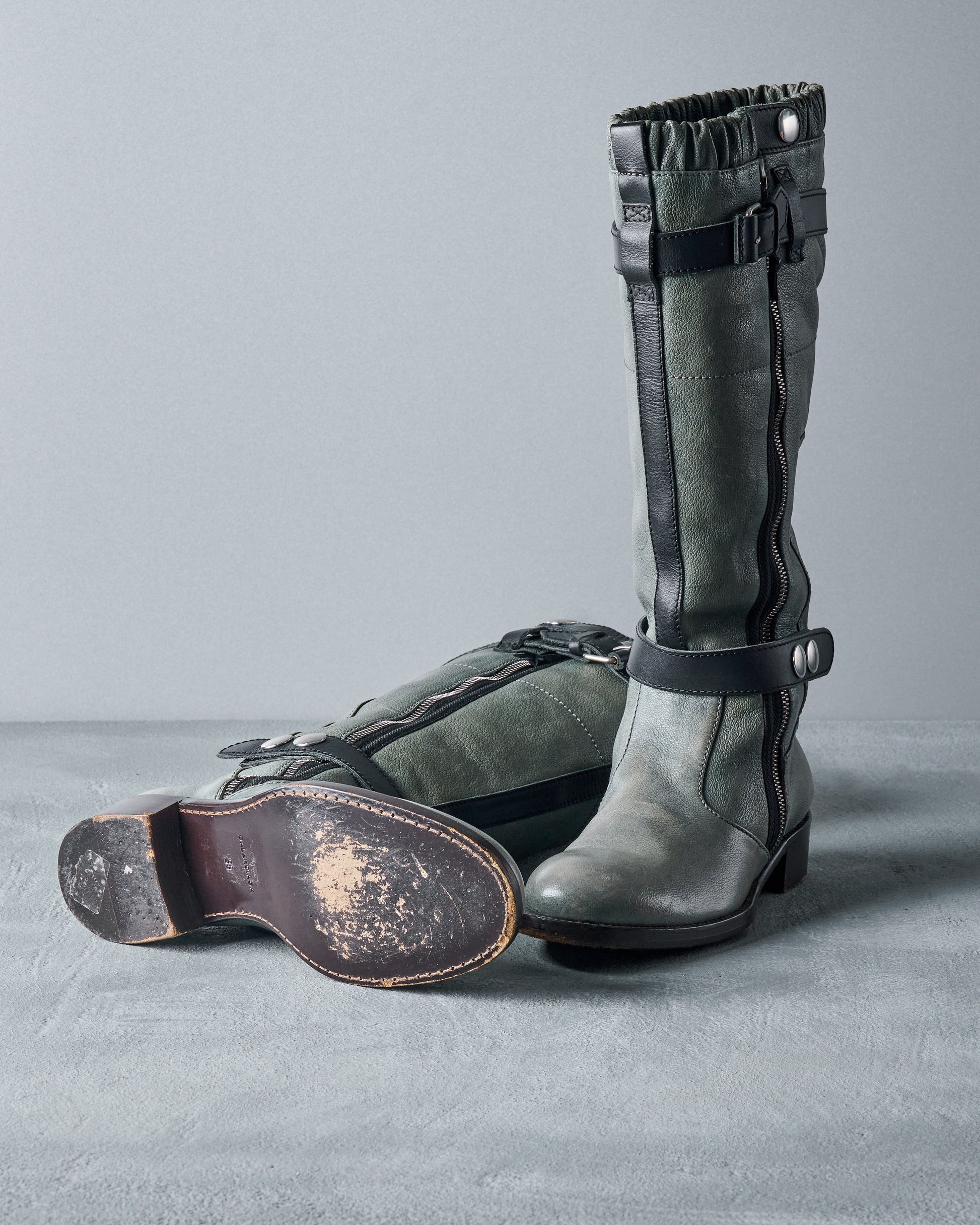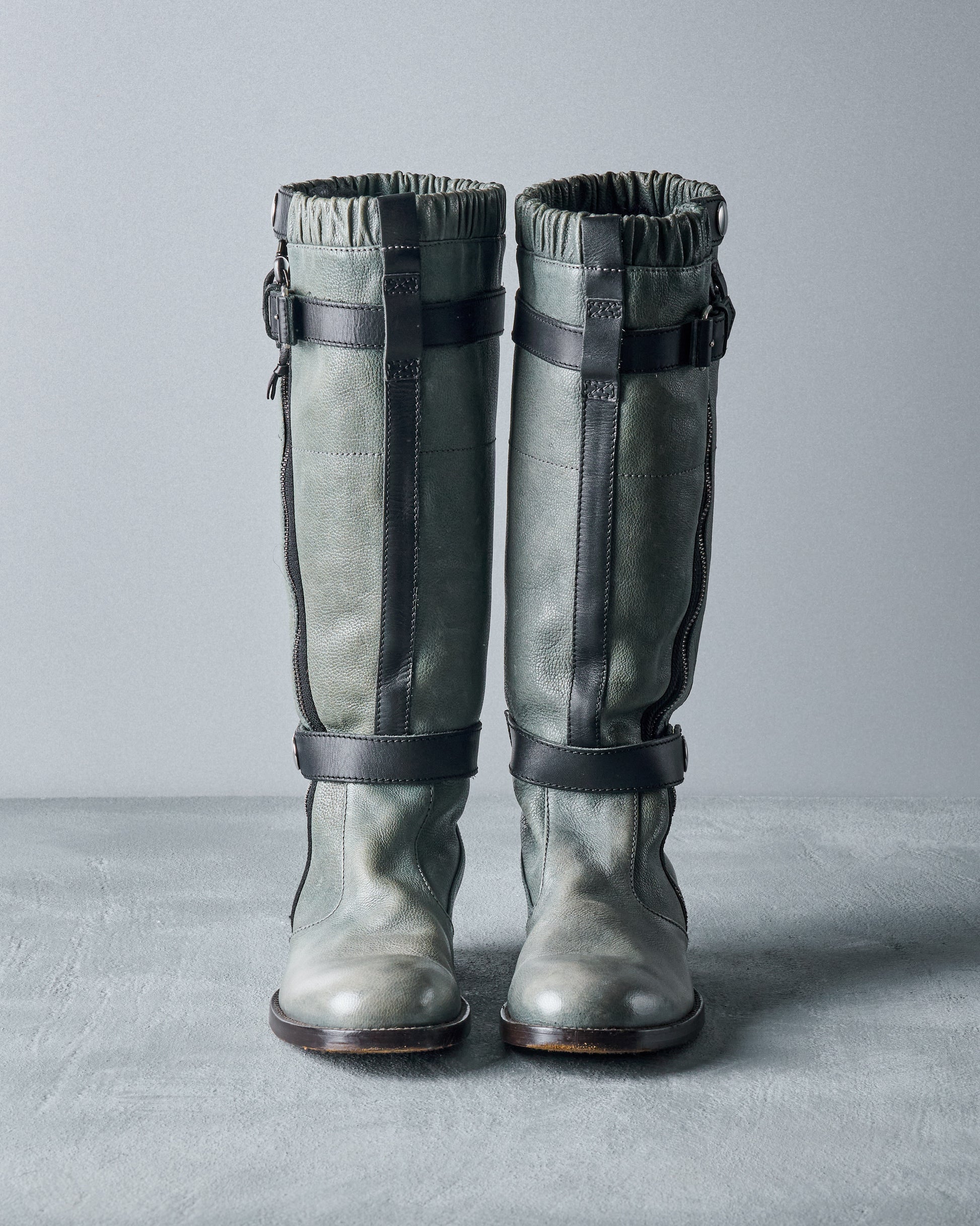 Aviation-inspired boot in textural vintage leather with a shearling lining. Features a combination of zip, belt, and press-stud closures; the boots can be worn belted and unzipped, revealing the fur interior.