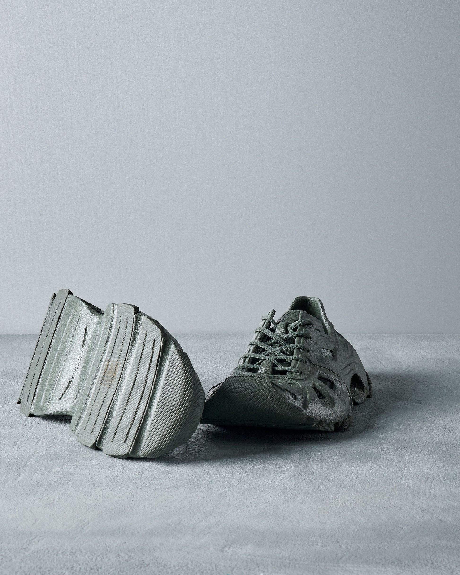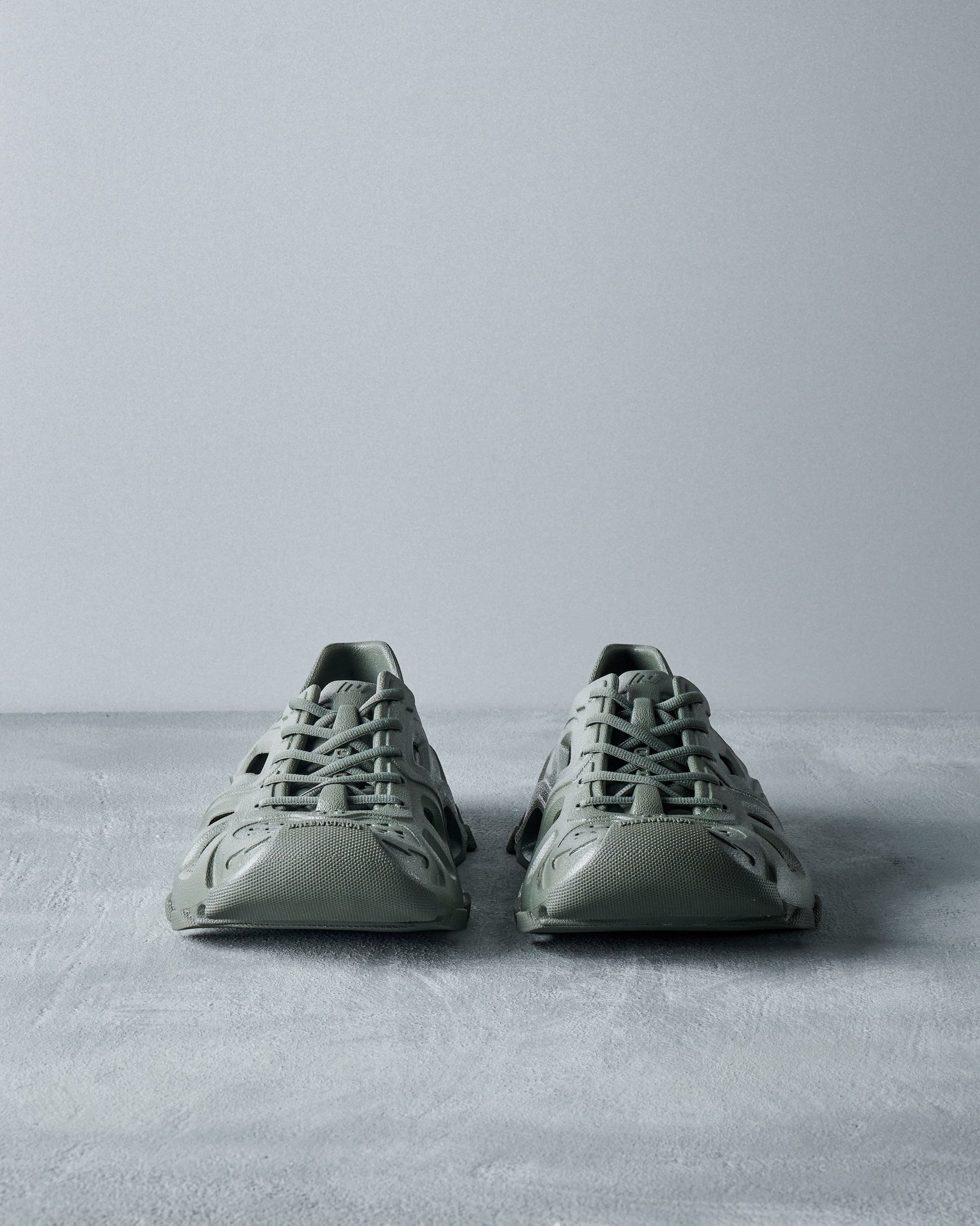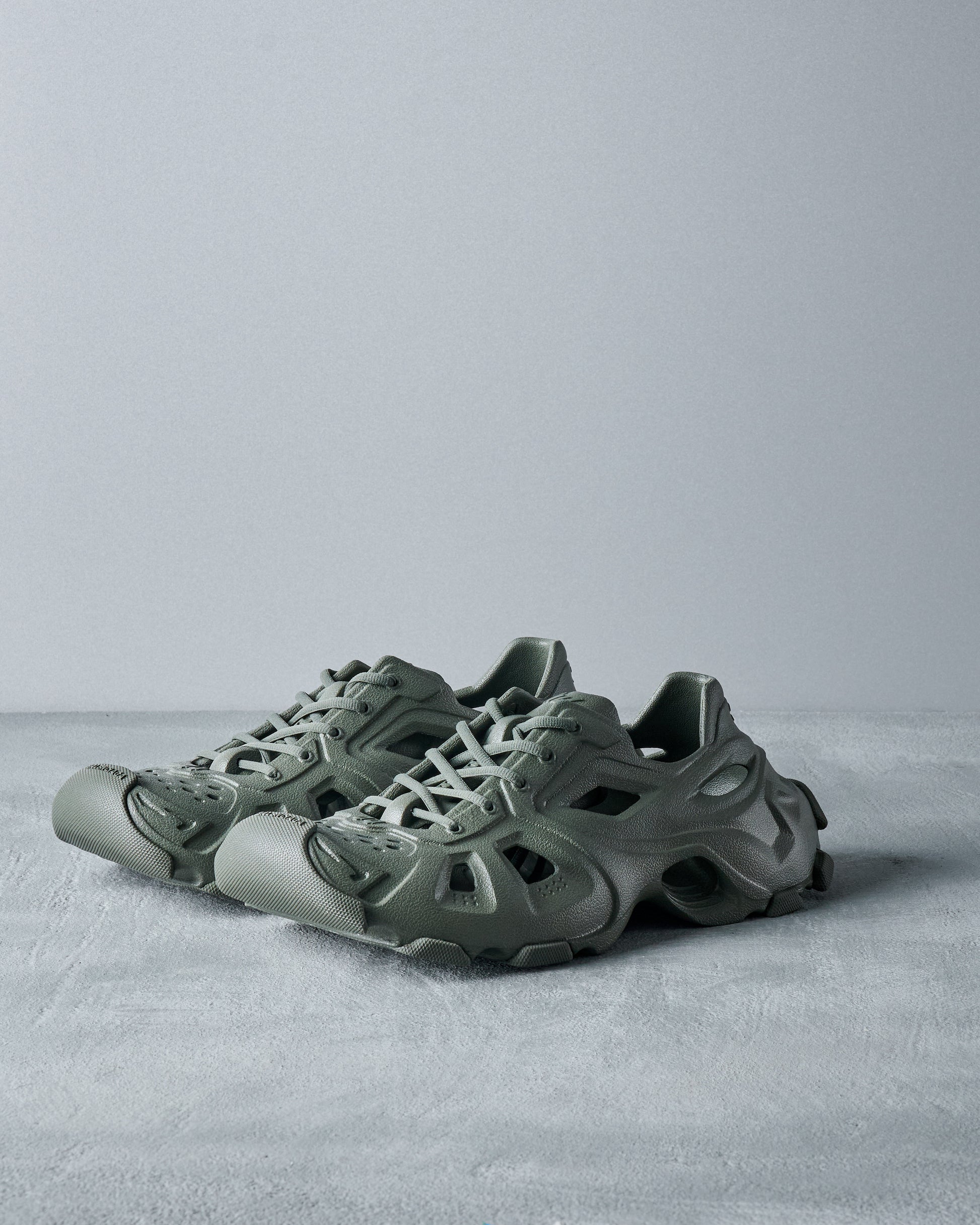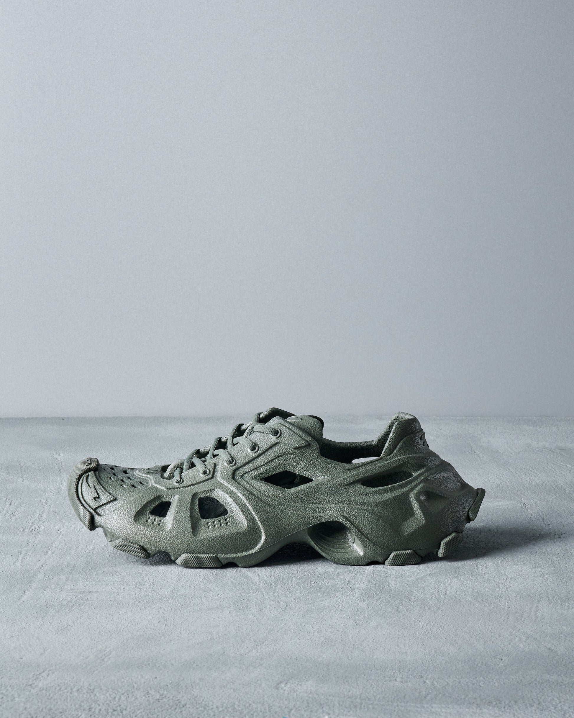 Lightweight lace-up sneaker in moulded rubber. The silhouette is wide and sculptural, expanding outwards from the base of the foot. Features durable stiff rubber panelling on soles.