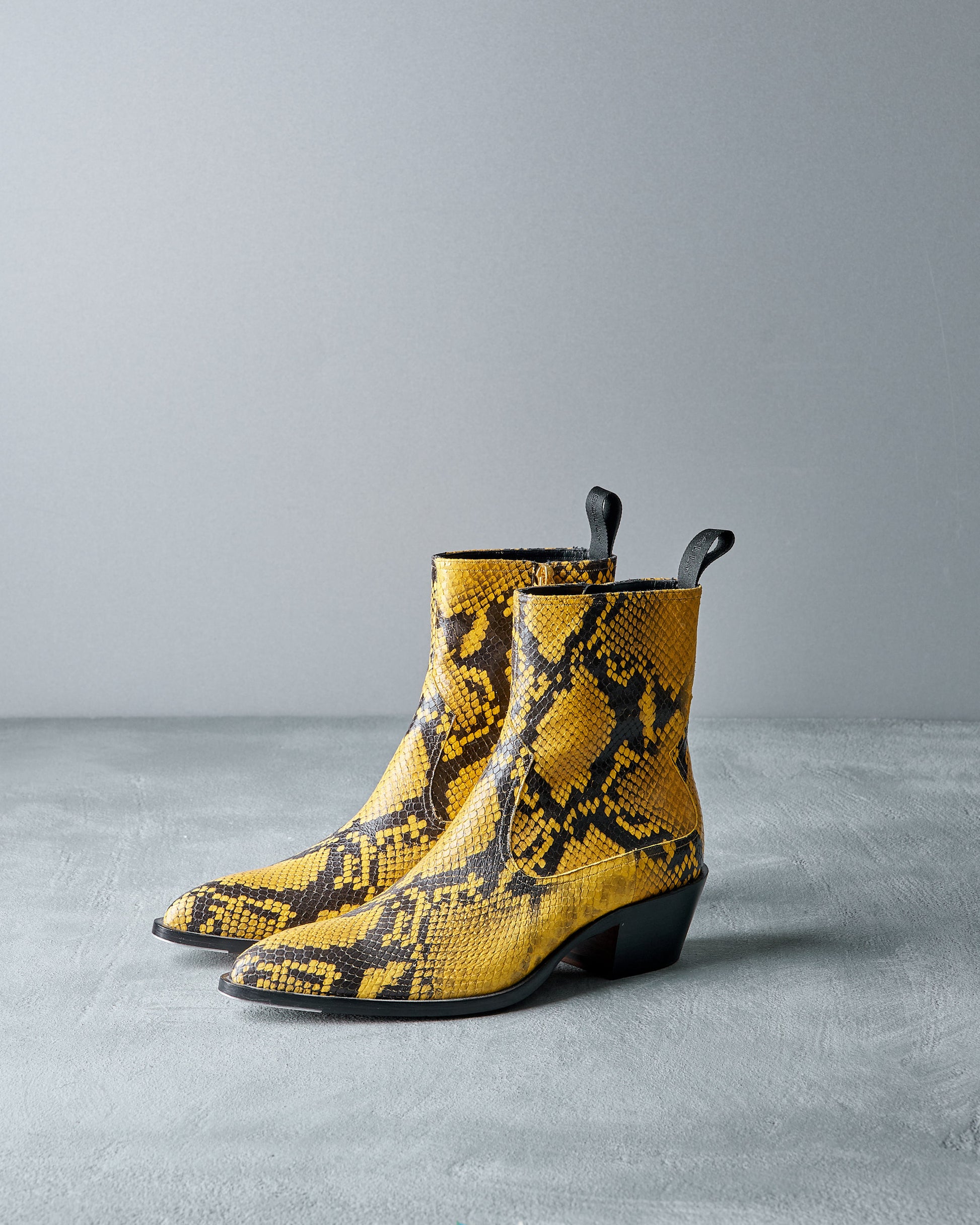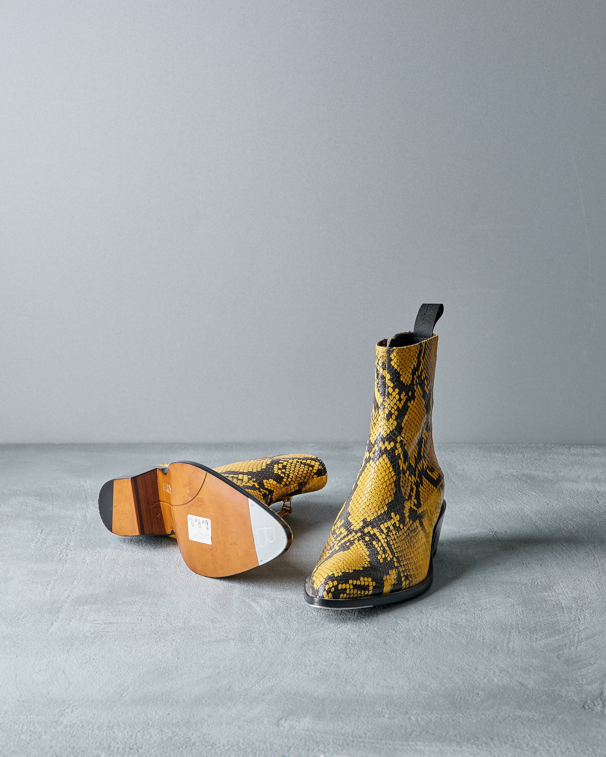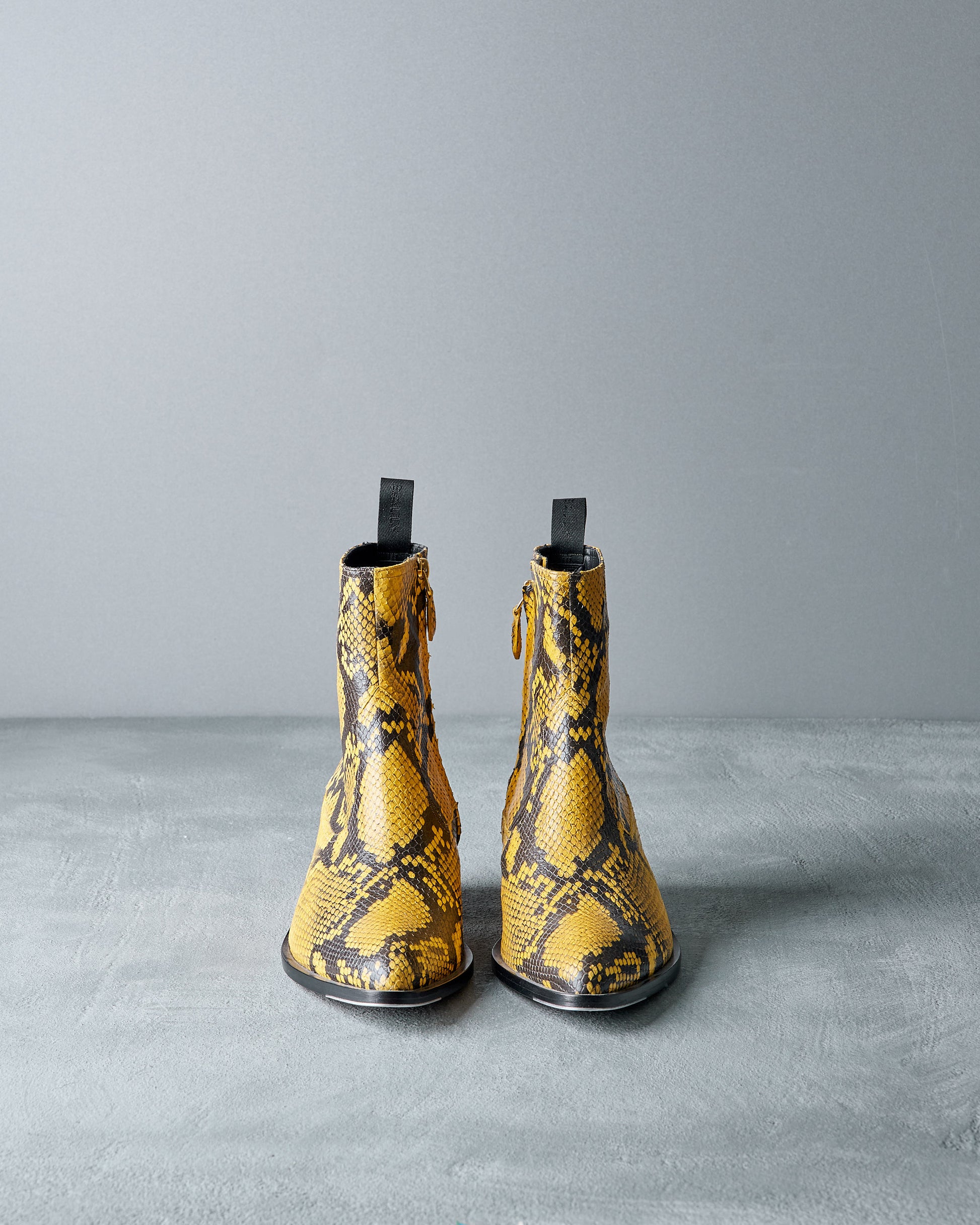 Snake-embossed effect leather boot with pointed toe, side zip closure, and bold silhouette. Refined craftsmanship in statement form.