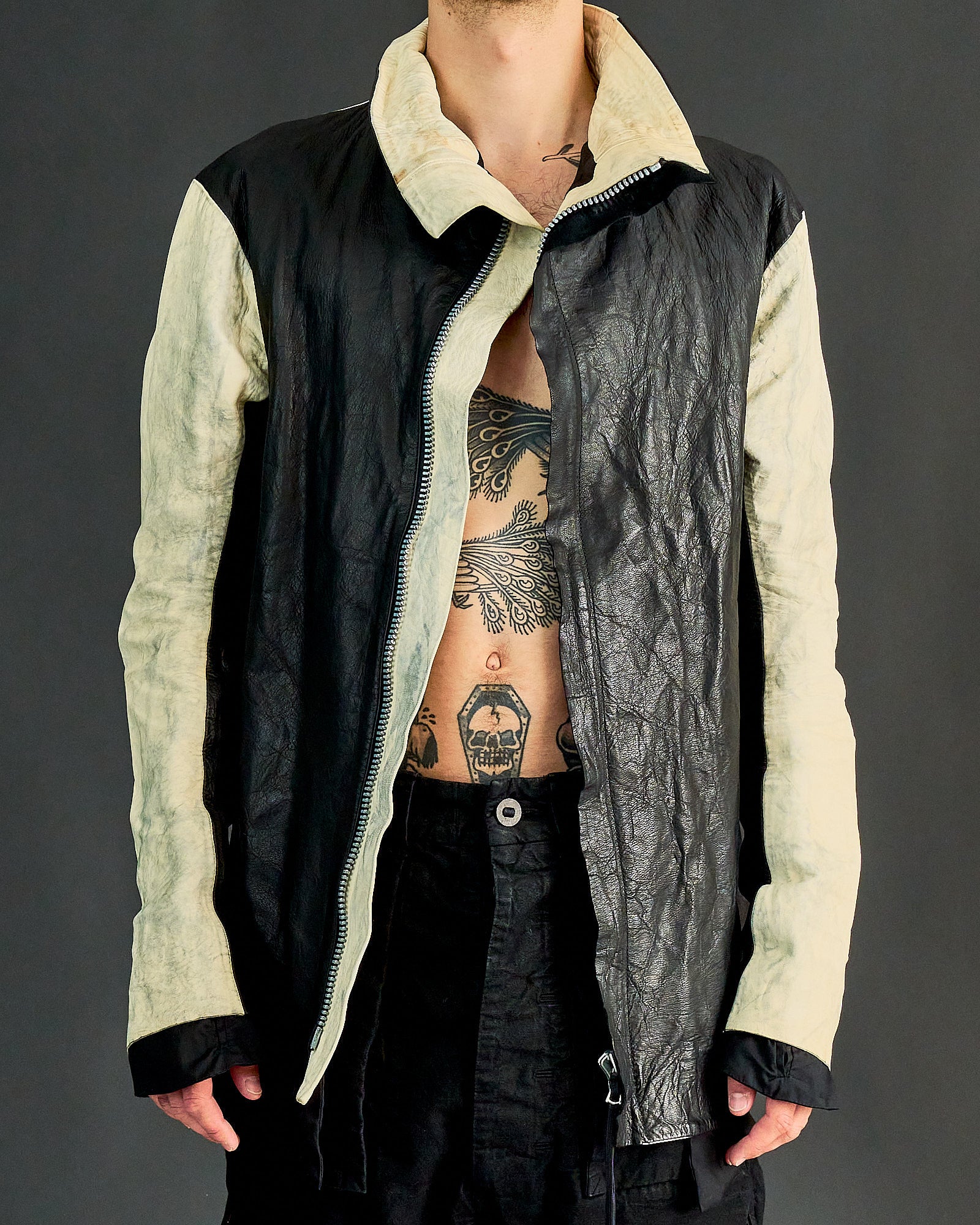 Longline zip-up jacket in crumpled buckskin deerhide. The slim fit and stacked sleeve provides a contemporary avant-garde silhouette. Features double-zip front, full lining, and Saberi's signature silver-aglet lace detail on back. Specialist clean only.