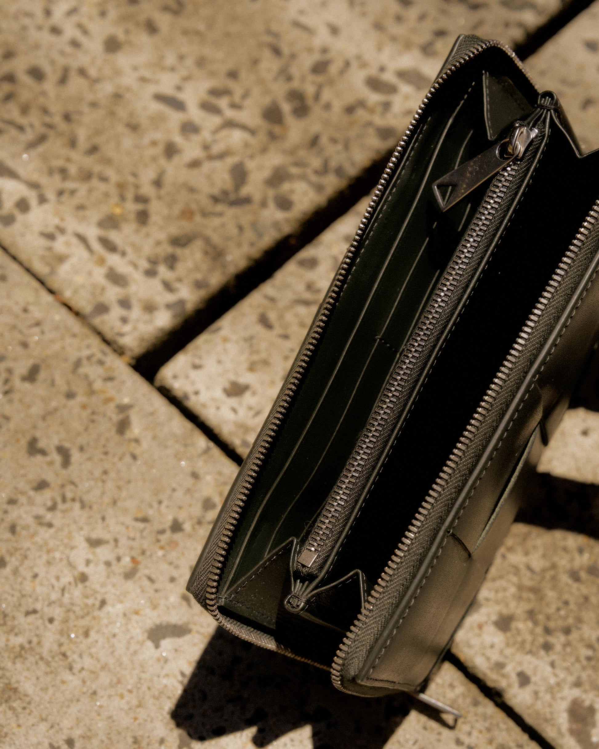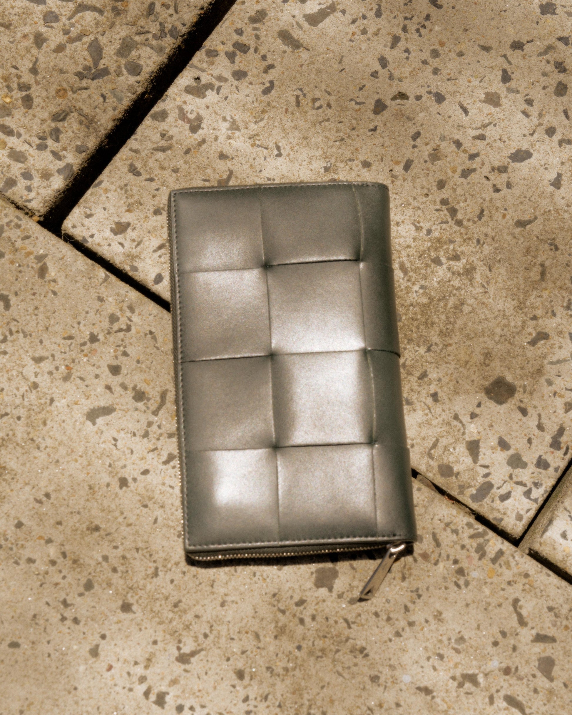 Bifold wallet in smooth intrecciato-woven leather. The side zip opens to reveal six cardholders, two pockets, and zipped pouch dividing the internal compartment. Room to fit your cards and cash, phone, or passport.