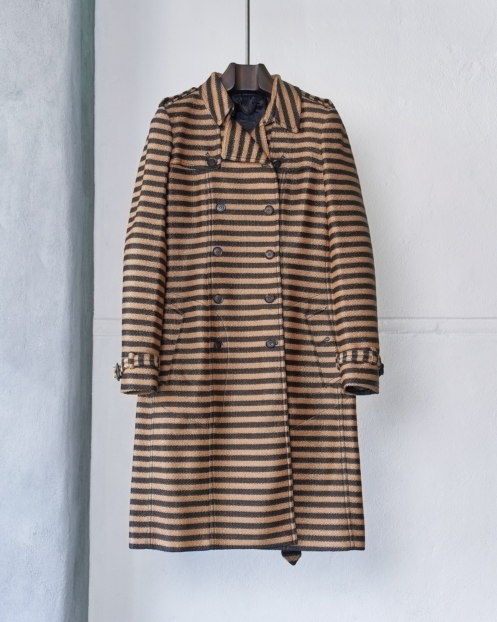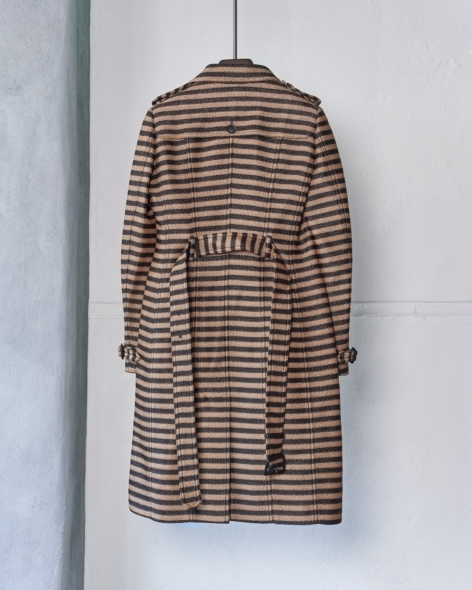 Knee-length trench coat constructed from a raffia weave cotton blend. The unique textile gives it a firm structure; it's geometric patterning reminiscent of British mod culture and the swinging sixties. High collar with six button closure, striped raffia belt and sleeve loops, single back vent, two hip pockets. Do not wash