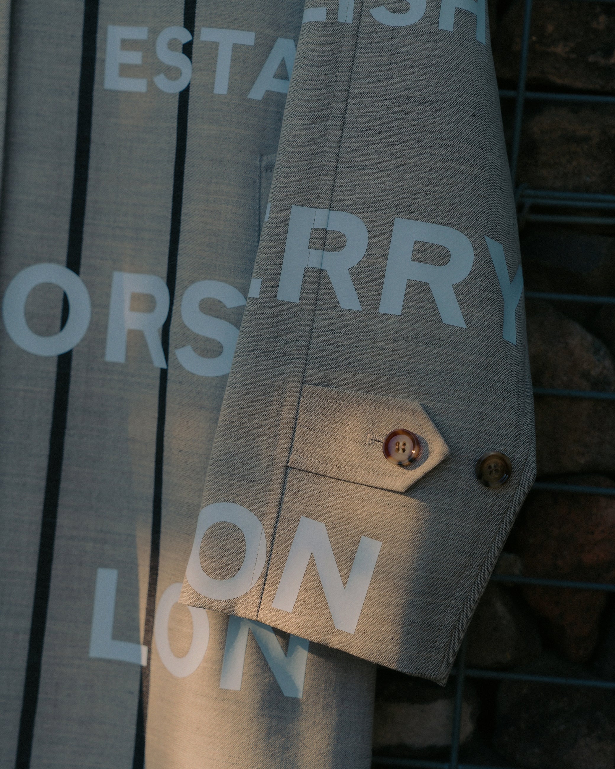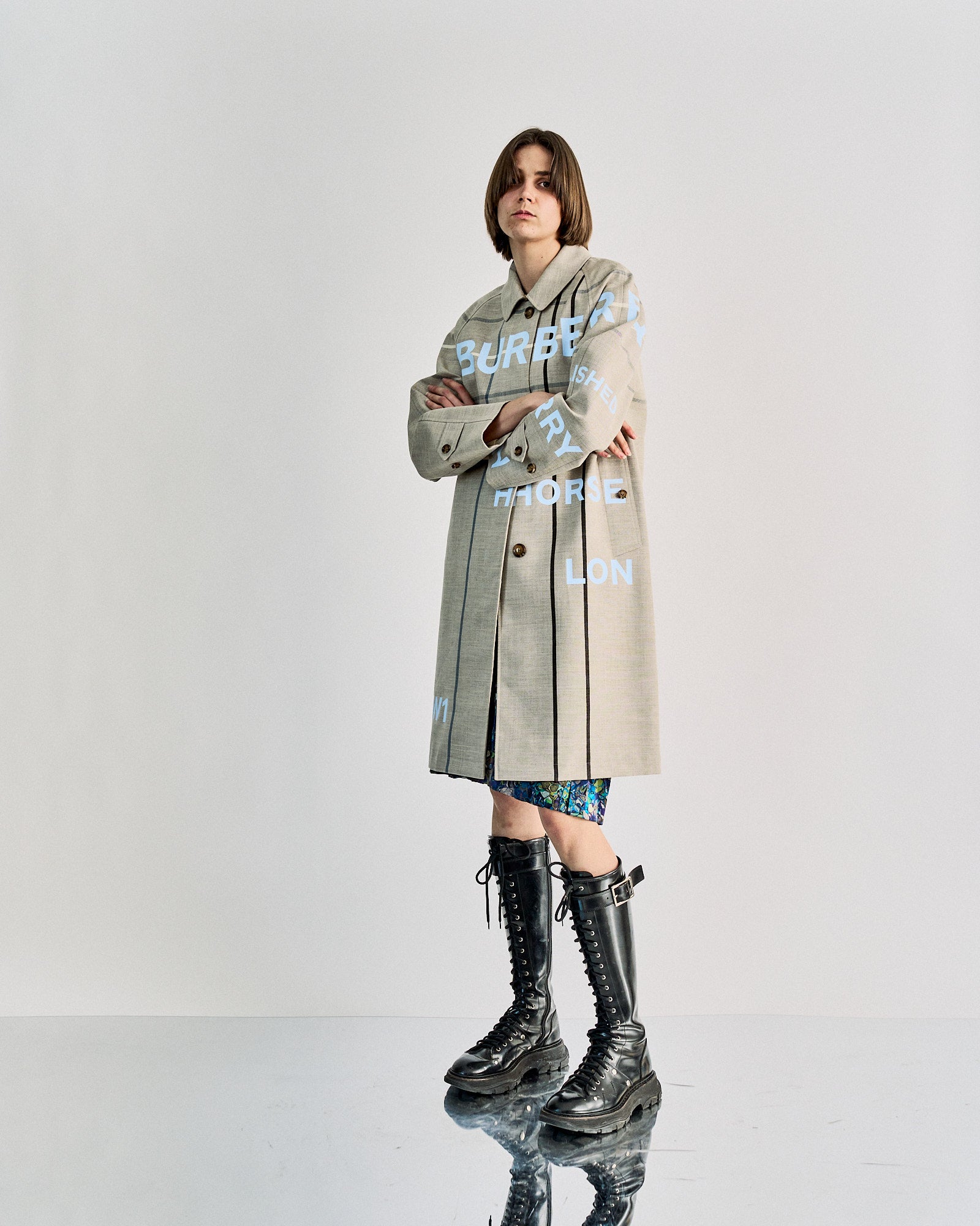 Knee-length spread collar coat with hidden five-button front closure. Features a sparse contemporary take on the Burberry check, with the House's Horseferry address wrapping from the front to the back. Single back vent, tab cuffs. Dry clean only.
