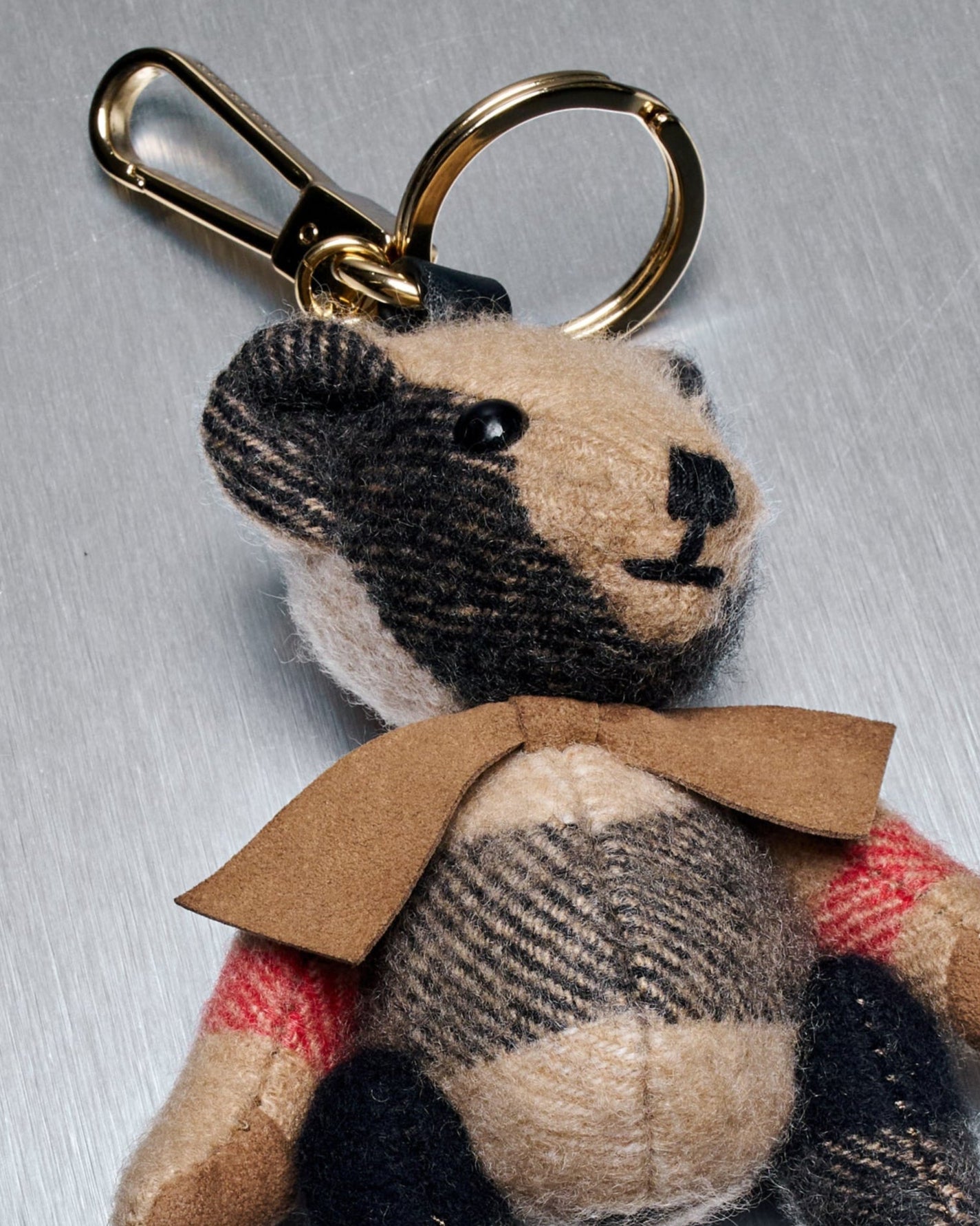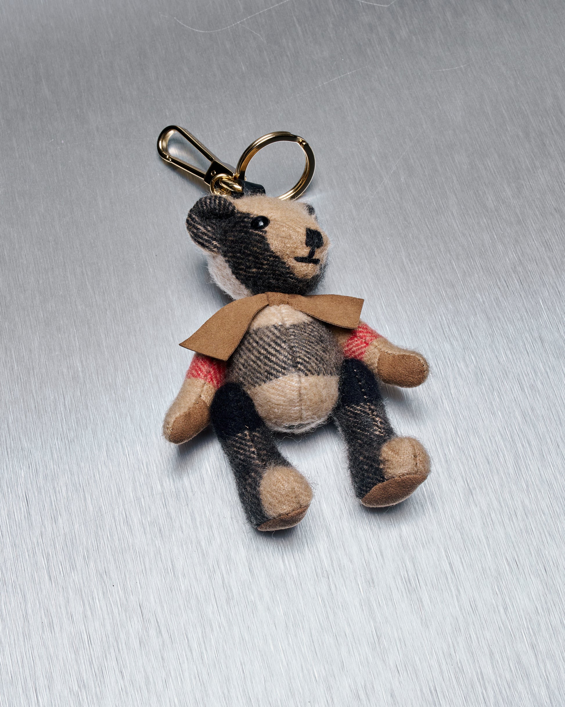 A friendly little teddy bear in cuddly checked Harrington cashmere. Features movable arms and legs, suede detailing throughout. Includes a gold-tone clip and key ring. What a functional companion to clip on your bag! <3 <3