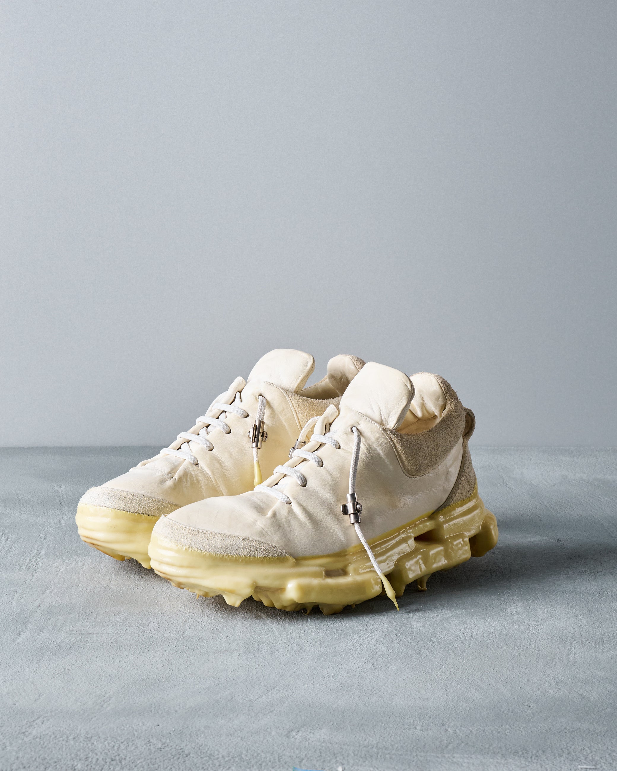 Belonging to Poell's "In Between" collection, the Paper Dart sneaker is an amalgamation of architectural structure and tactile intensity. A textural horse leather upper sits poised atop a sole formed from a series of rubber plinths. The bottom half of the piece is coated in a deluge of dripping rubber, left raw and dribbling to the earth.