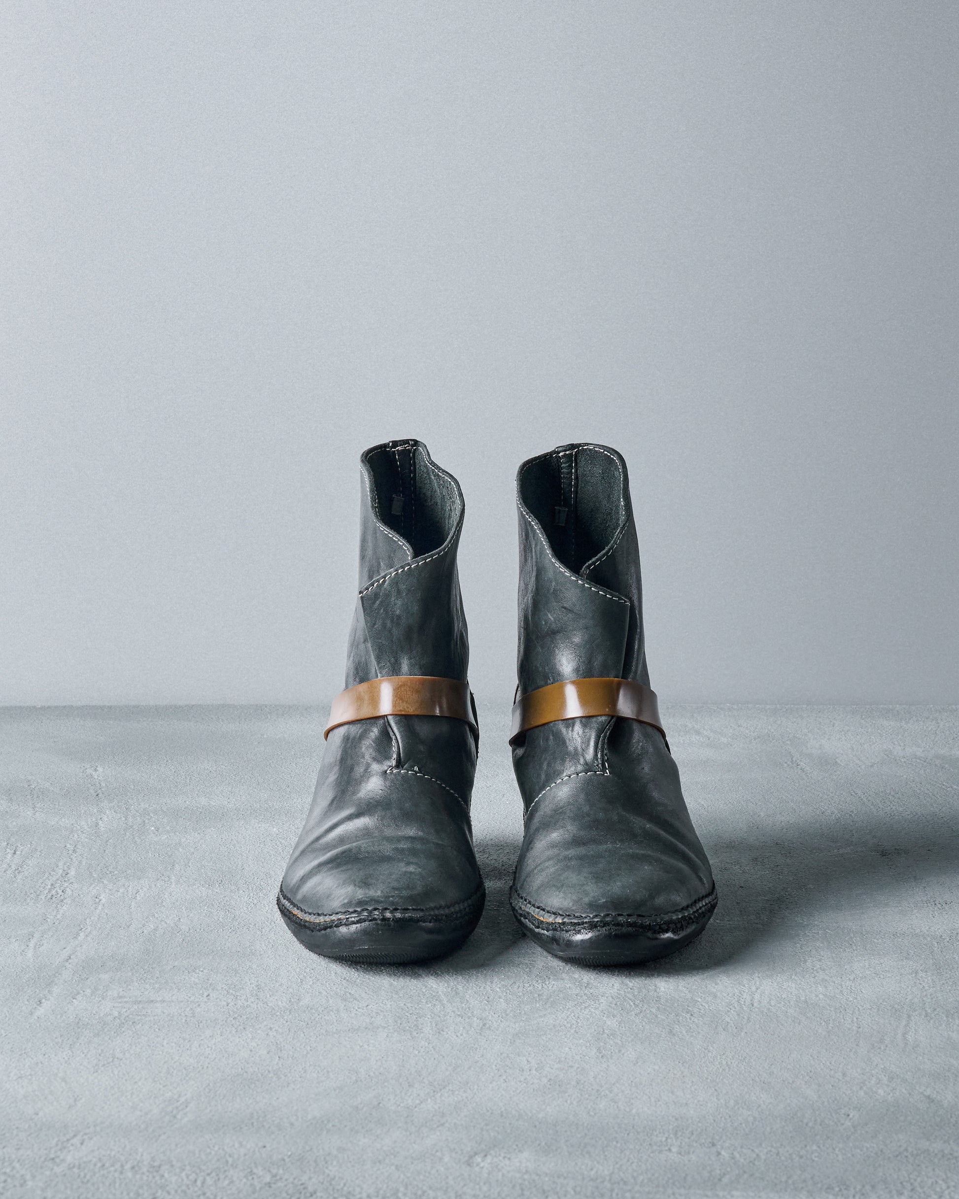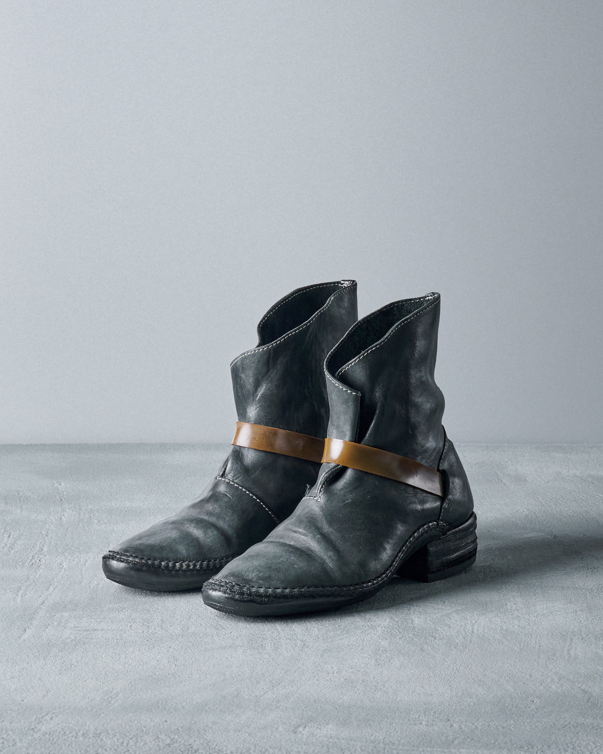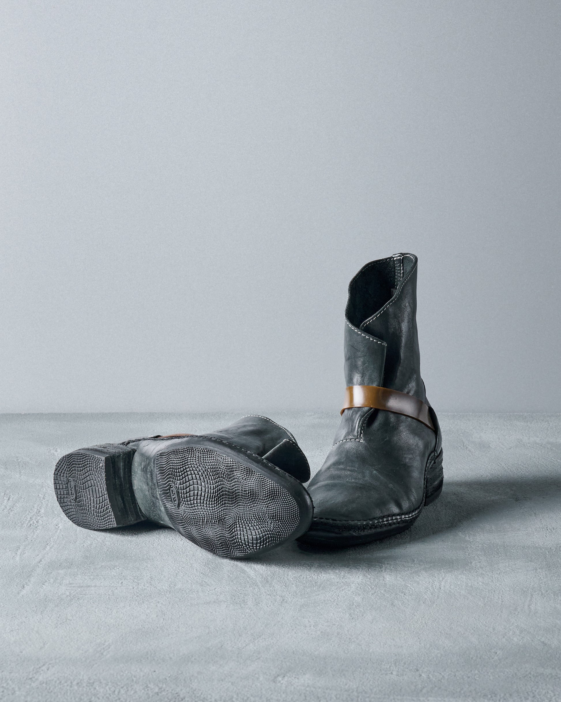 Belonging to Poell's "Off-Scene" collection, the Rubber Band boot distorts the masculine with the mundane. A sanded Cordovan horse leather upper is contorted by a thick rubber band which wraps around the ankle, securing the foot in place like a rolled-up newspaper.