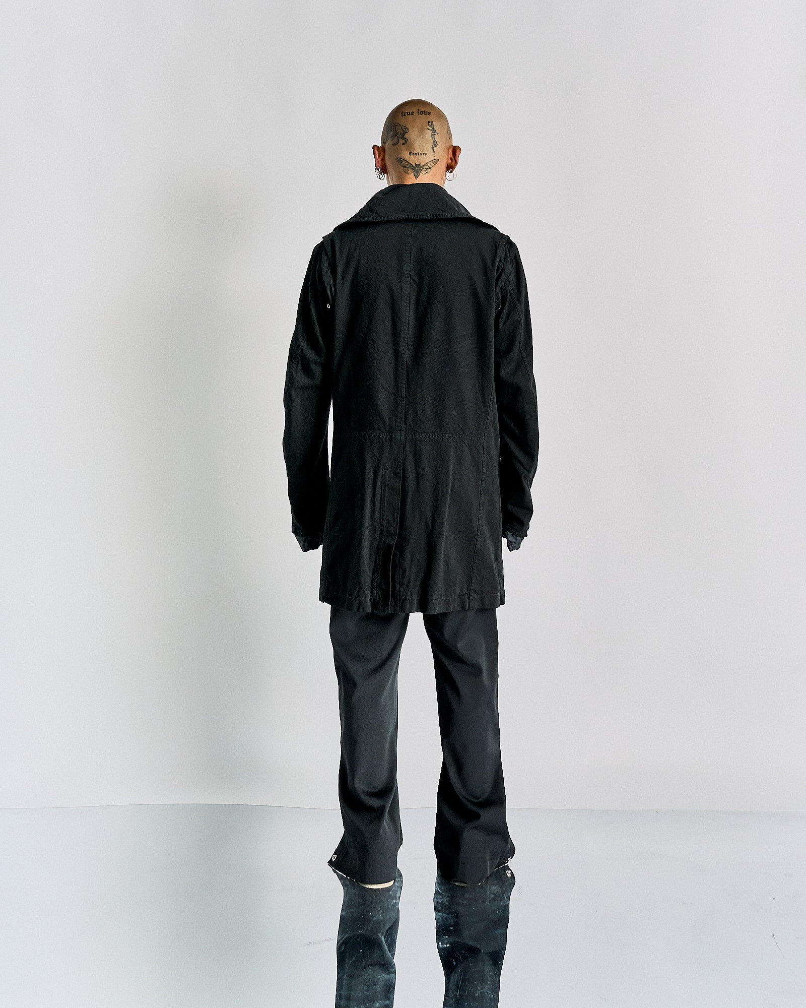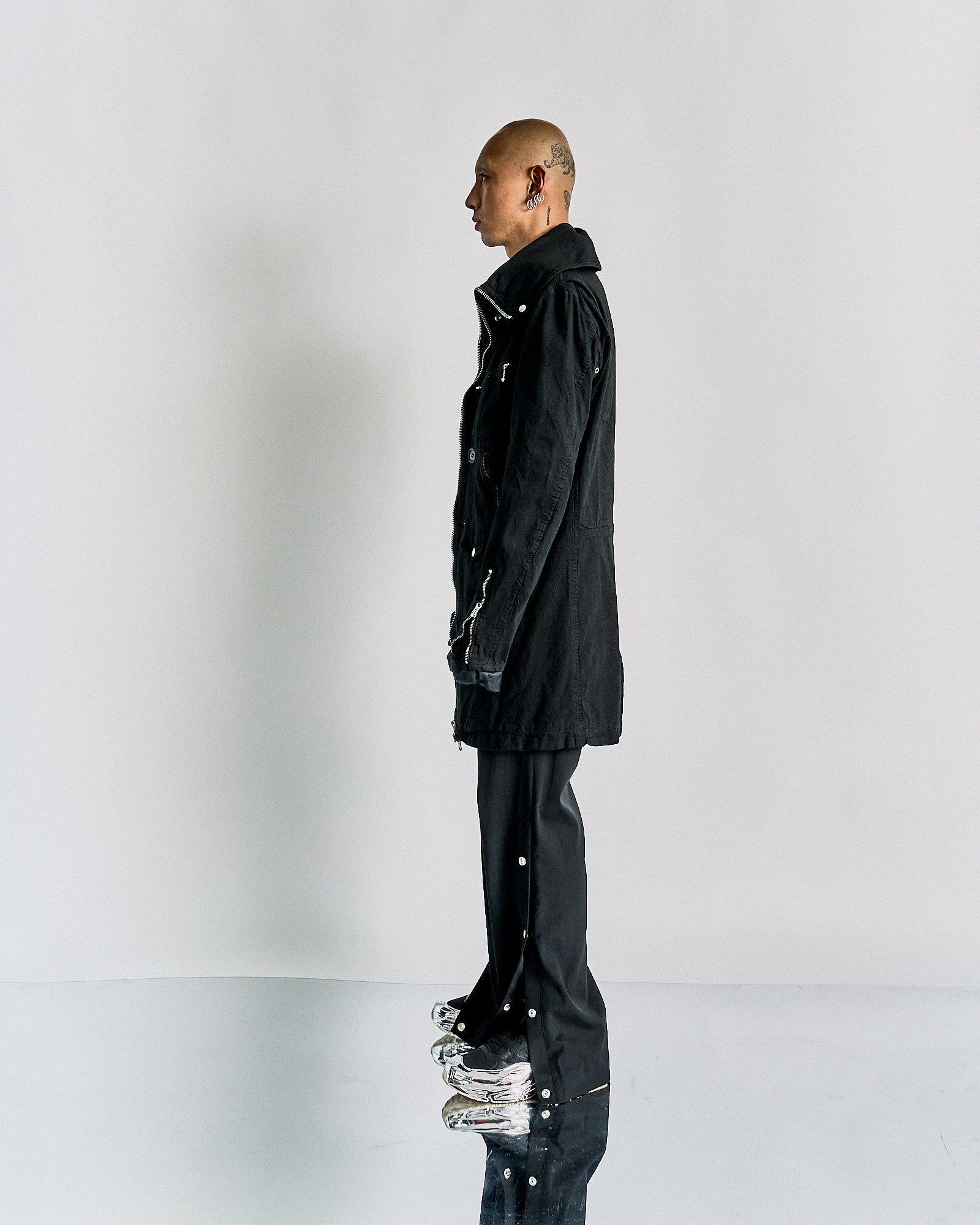 Longline front-zip jacket in Nylon cotton twill. Double-zip and button-front closures provide multiple styling options. Features external zip and press-stud pockets, internal lining, zip cuffs, polished hardware throughout. Dry clean only