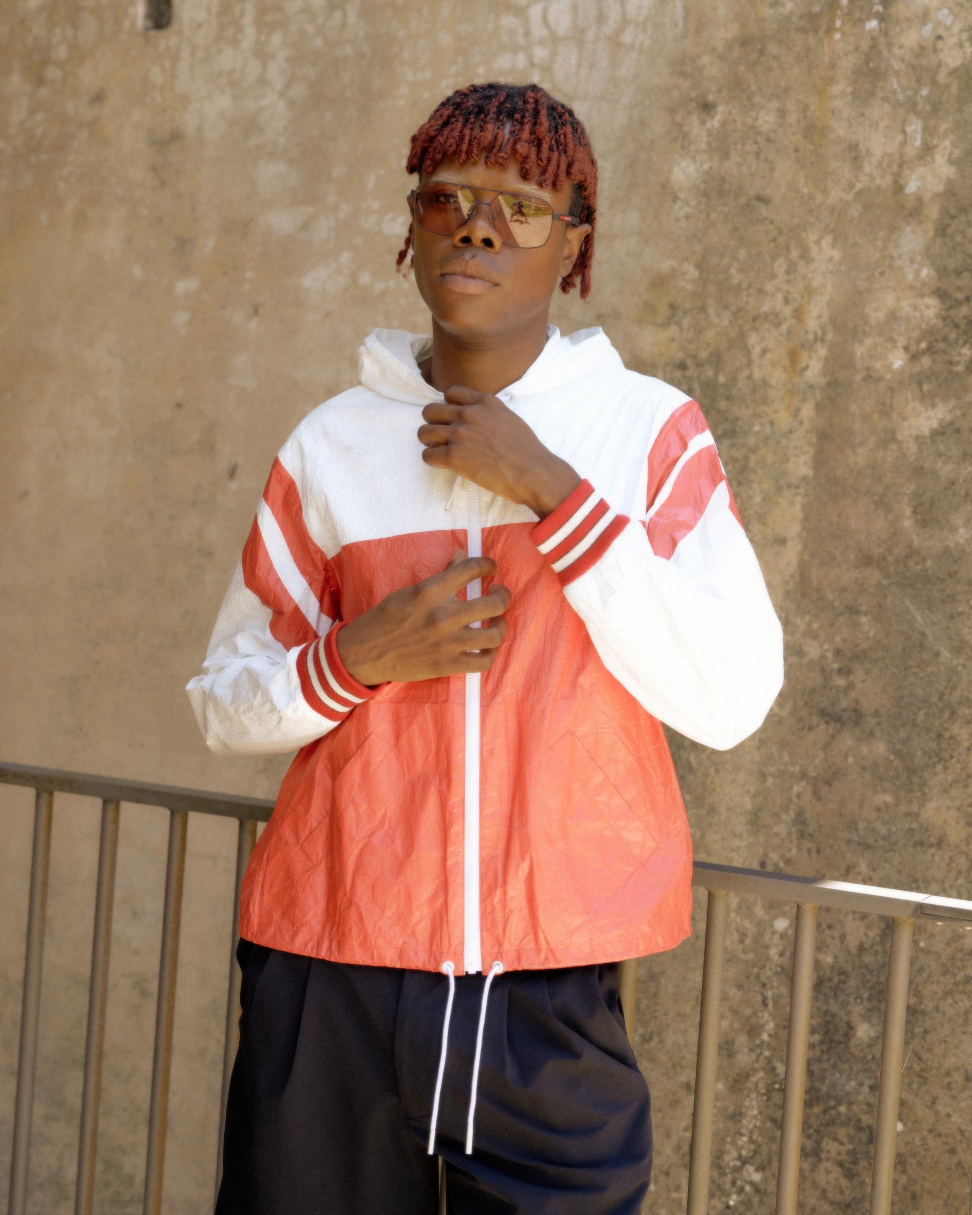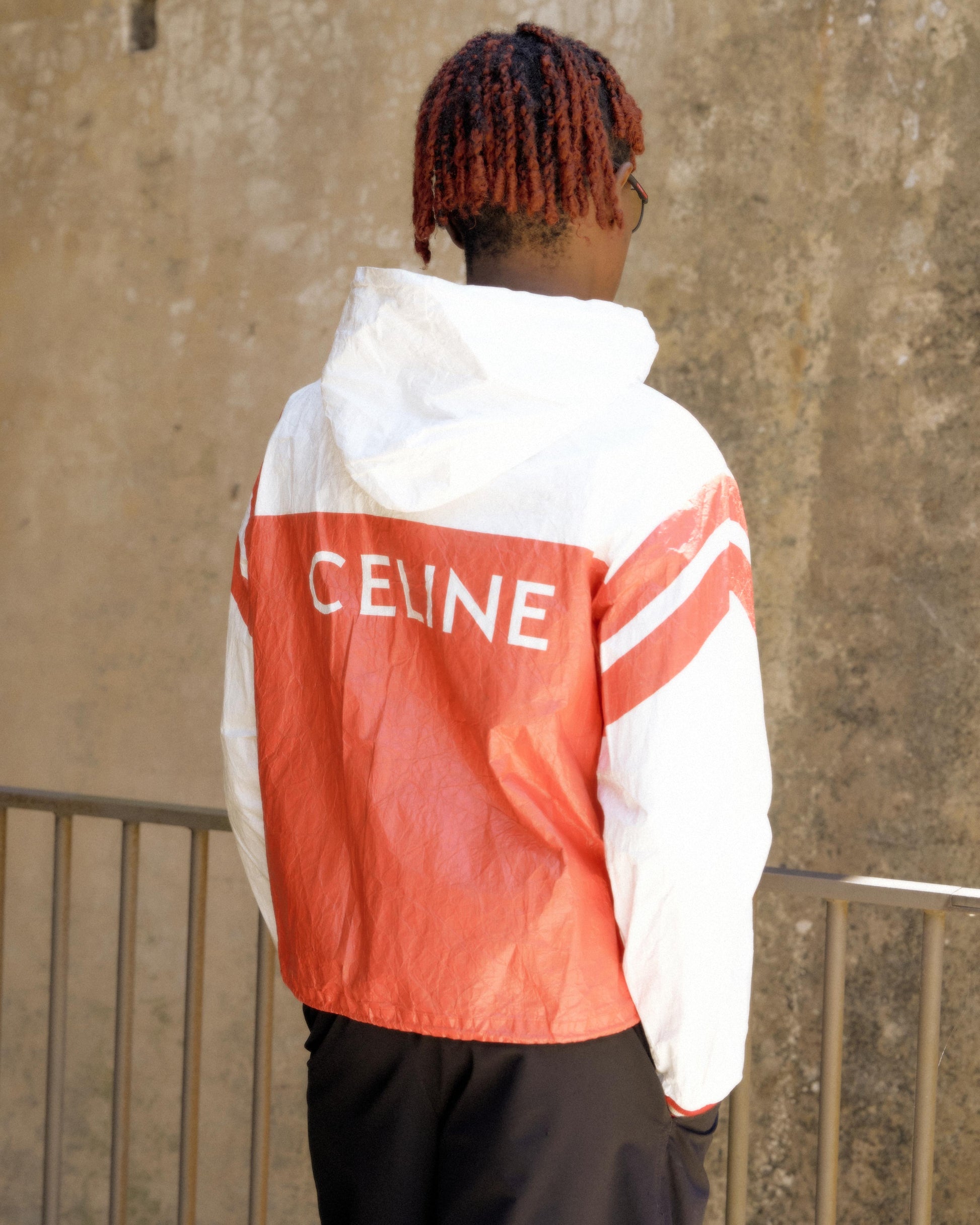 Lightweight zip-up windbreaker in crumpled polyethylene with a thin laminated finish. The jacket is cut with a boxy cropped rise and varsity finishings for a 1980's-inspired silhouette. Features drawstrings on hood and base, ribbed cuffs, two front pickets, house branding across back. Delicate hand wash.