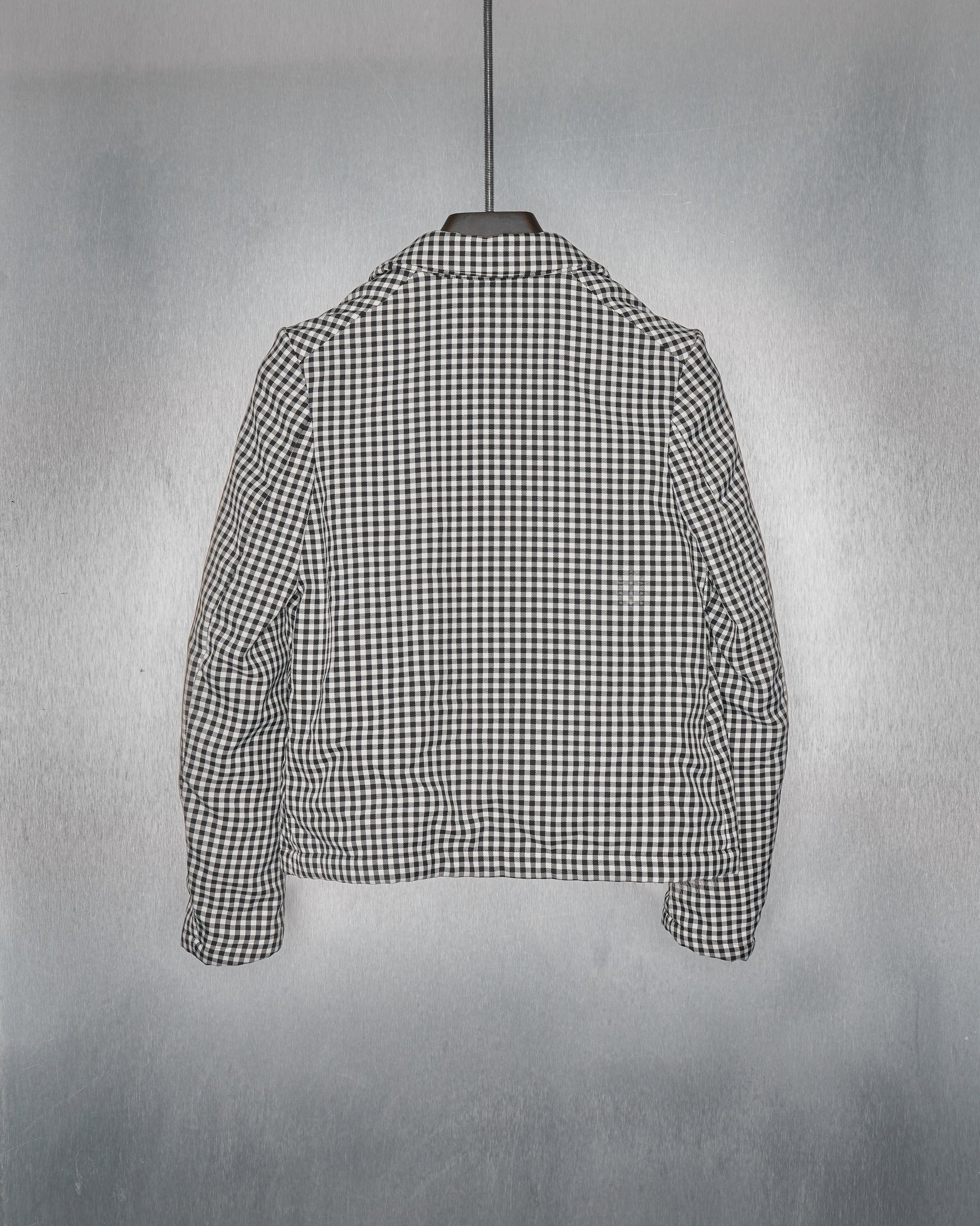 Five-button blazer in gingham polyester with warm wool lining. The jacket can be closed with a single-button waist or fastened to the boutonniere. Features three external pockets in candy floss faux fur. Dry clean only