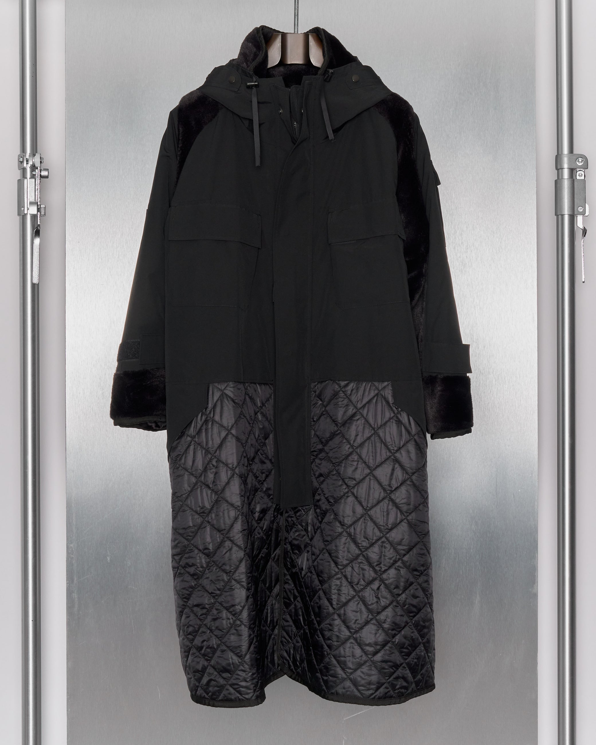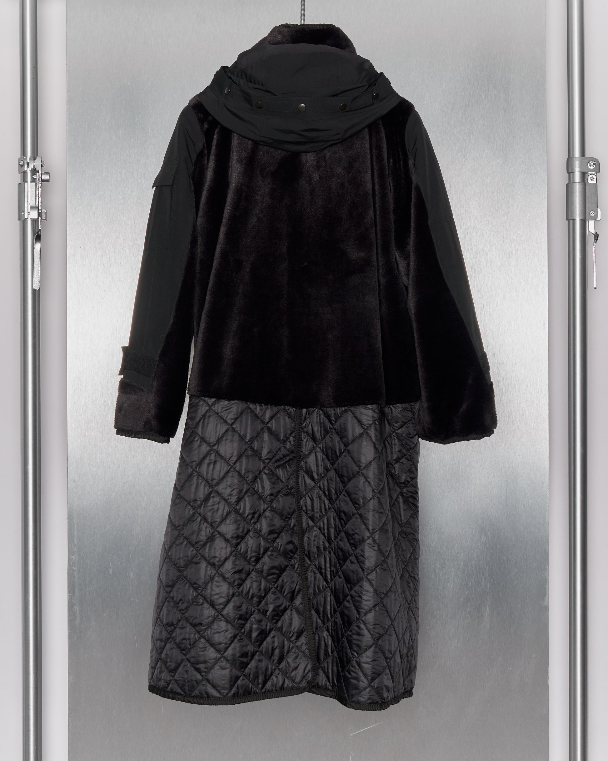 Voluminous flowing coat in layered panels of technical drill, soft faux fur, and quilted nylon. The zip front opens to reveal an internal vest with strap and buckle closures. Features a press-stud flap, toggle-pull hood, four external pockets, tonal hardware throughout. Dry clean only