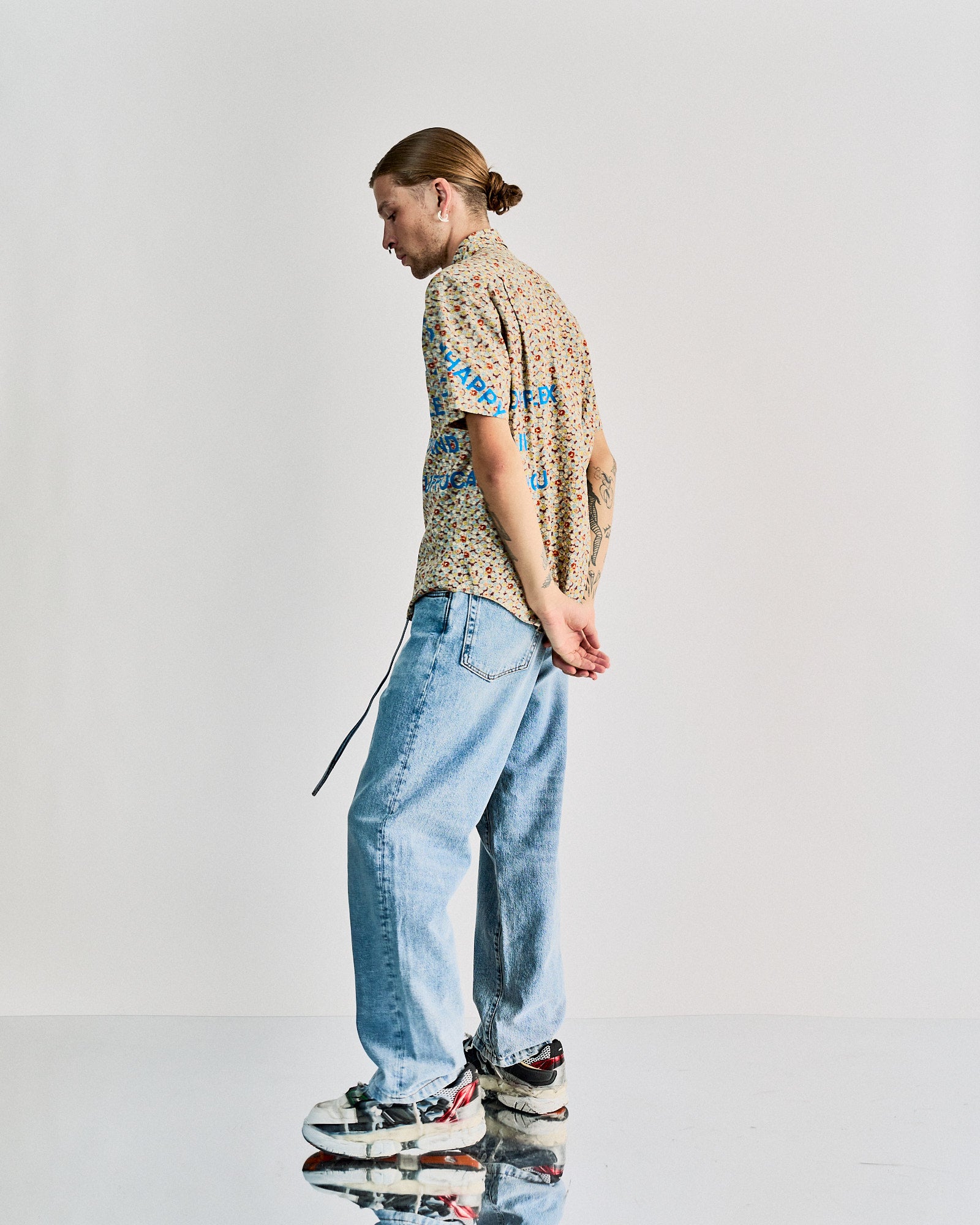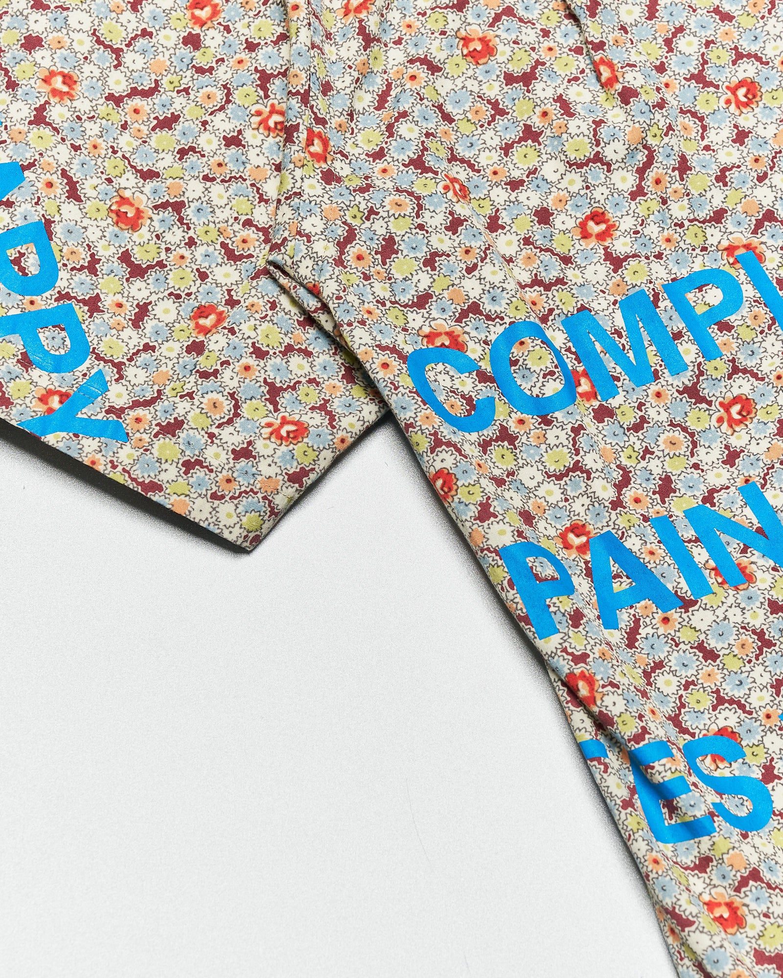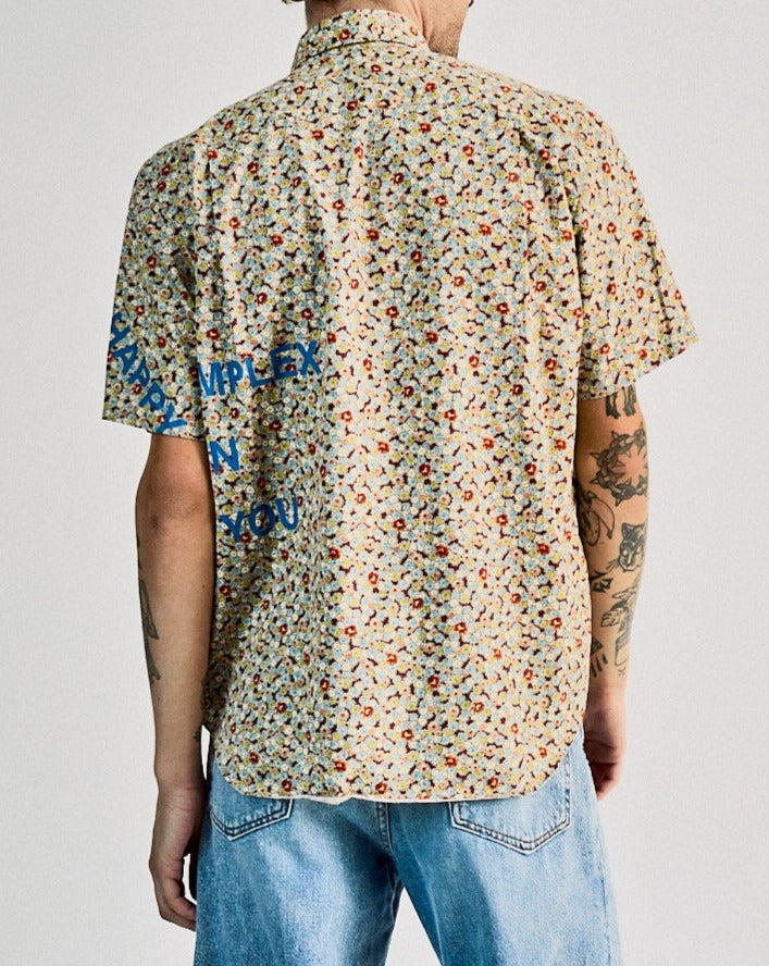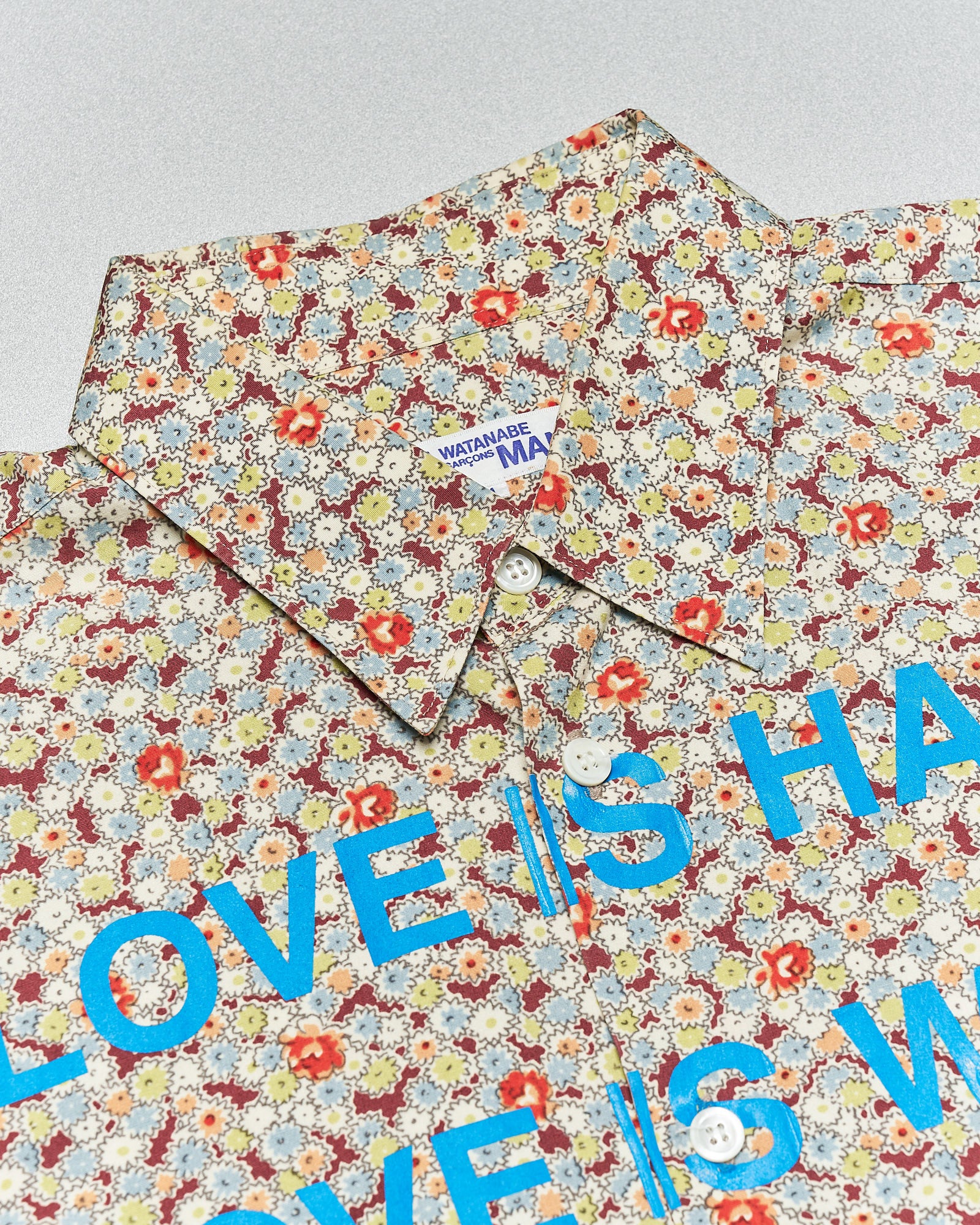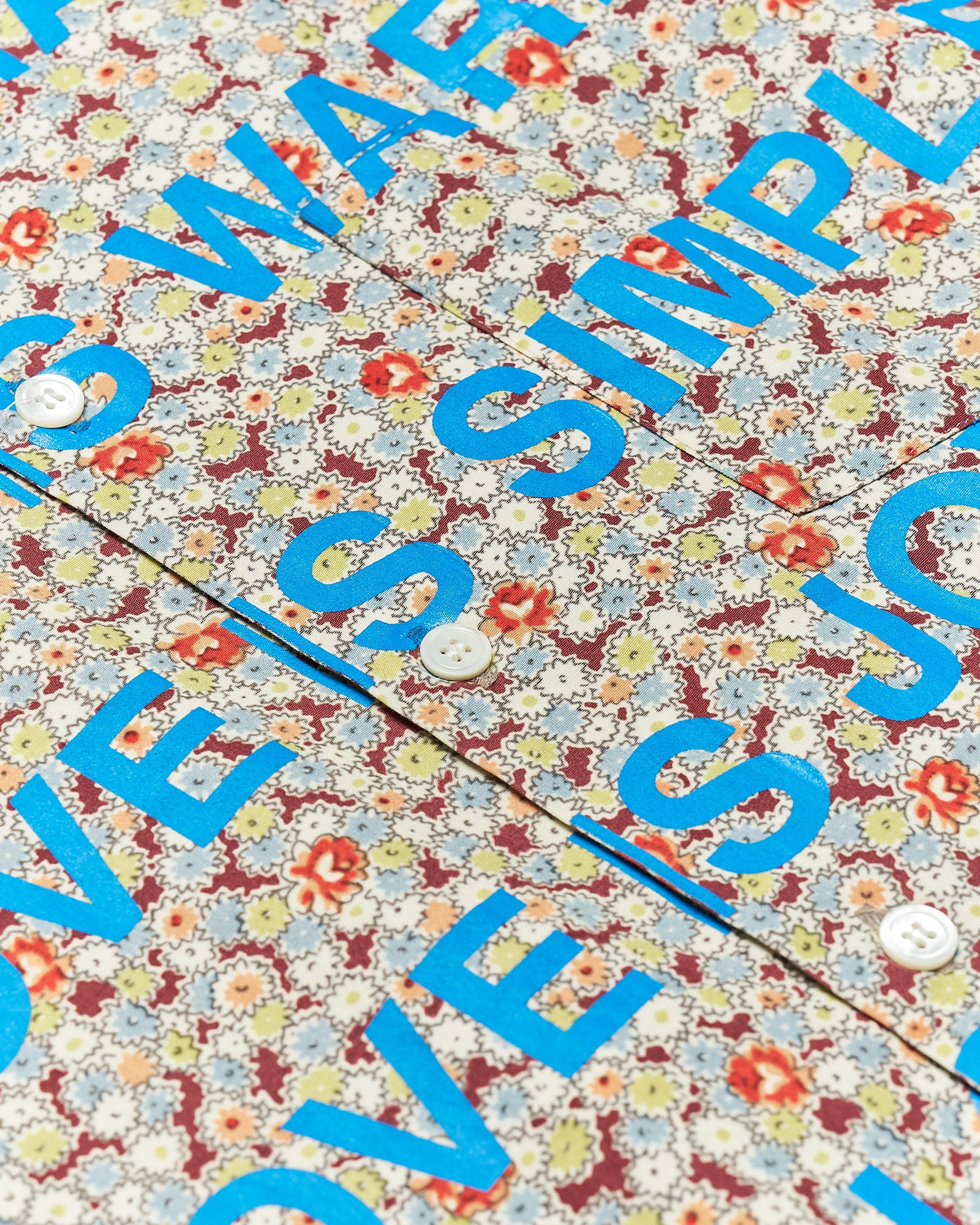 A gloss vinyl applique is adhered around the chest and side of this floral poplin shirt. The shirt has a tailored fit, curved hem, and button closures on front. Note: this piece runs small. Hand wash in cold water recommended.