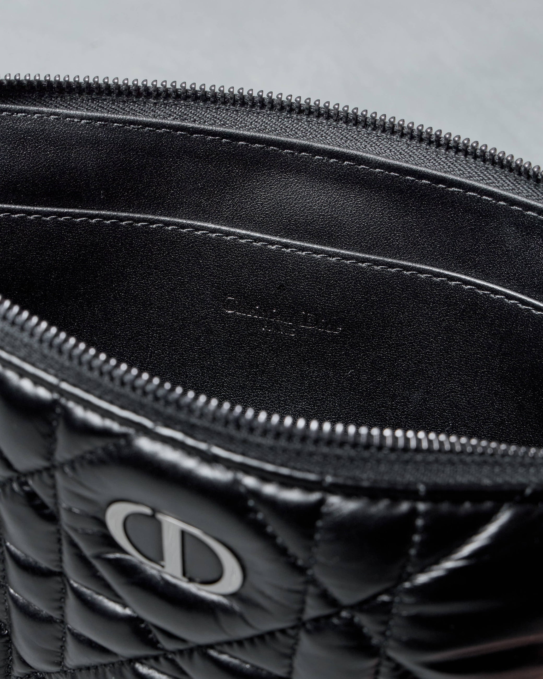 A daily pouch in soft black calfskin with signature Cannage stitching. Features a front CD signature, a spacious zippered compartment, and an internal slip pocket for everyday essentials. Finished with a detachable wrist strap for easy, versatile carrying.