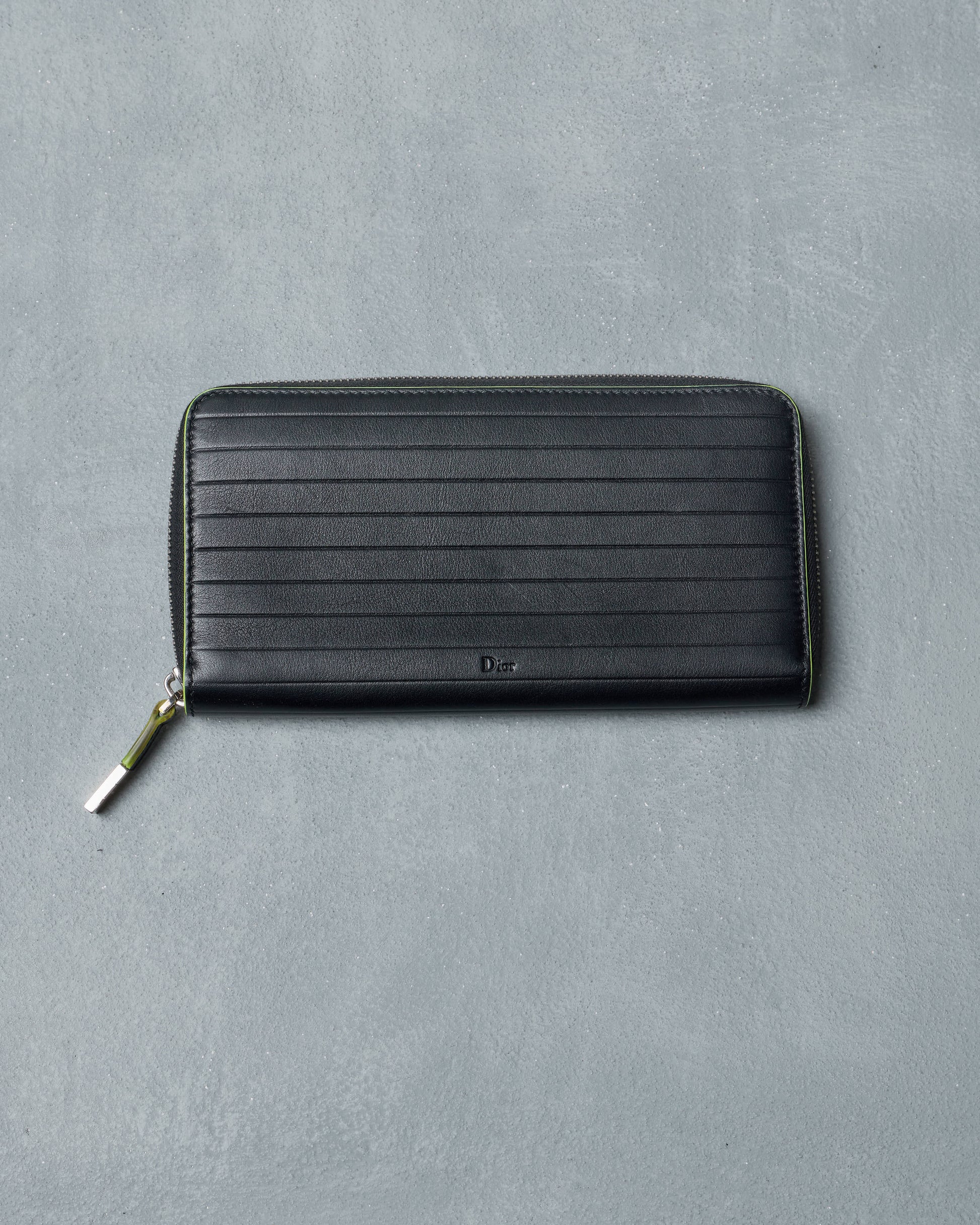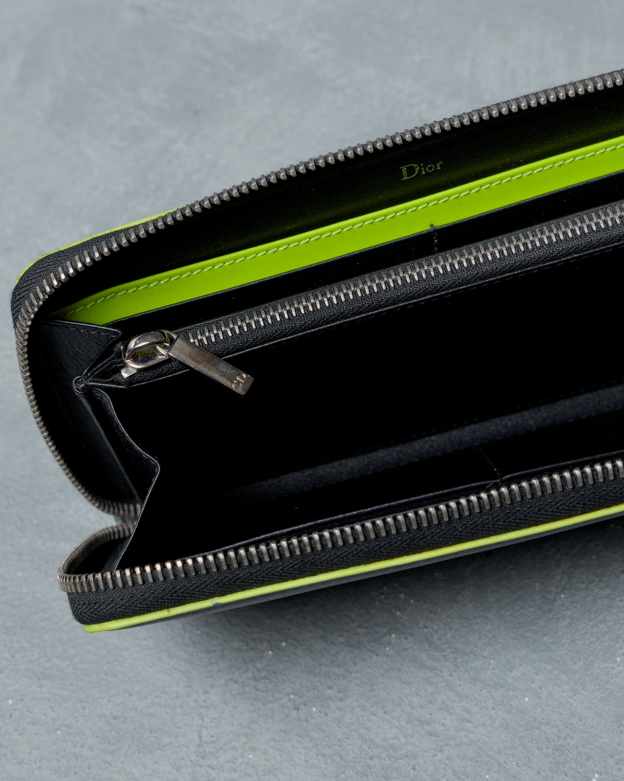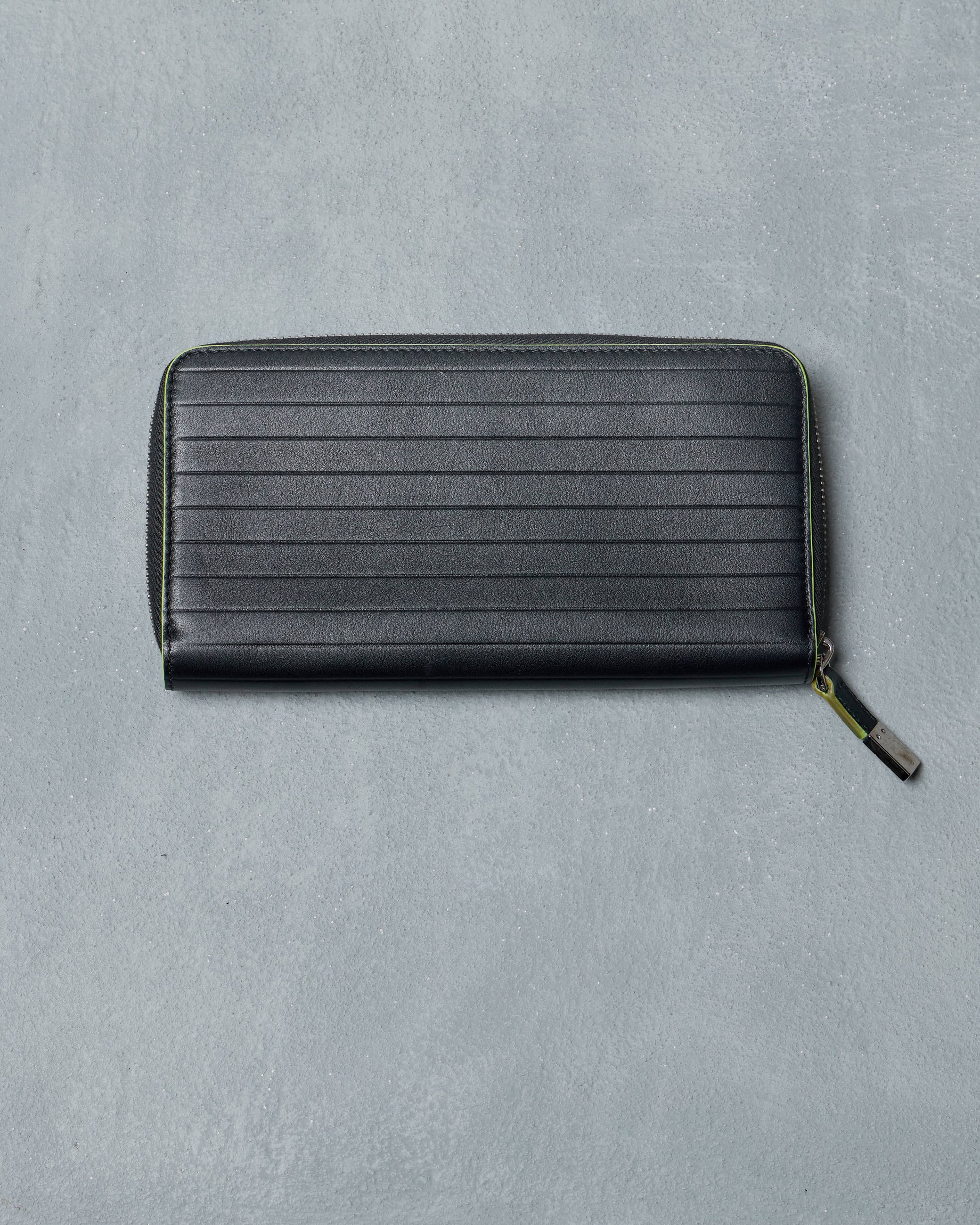 Panelled zip-around wallet in black leather with a neon green edge detail. Features twelve card compartments and an internal zipped pouch for cash or coins, combining practical storage with a modern, graphic finish.