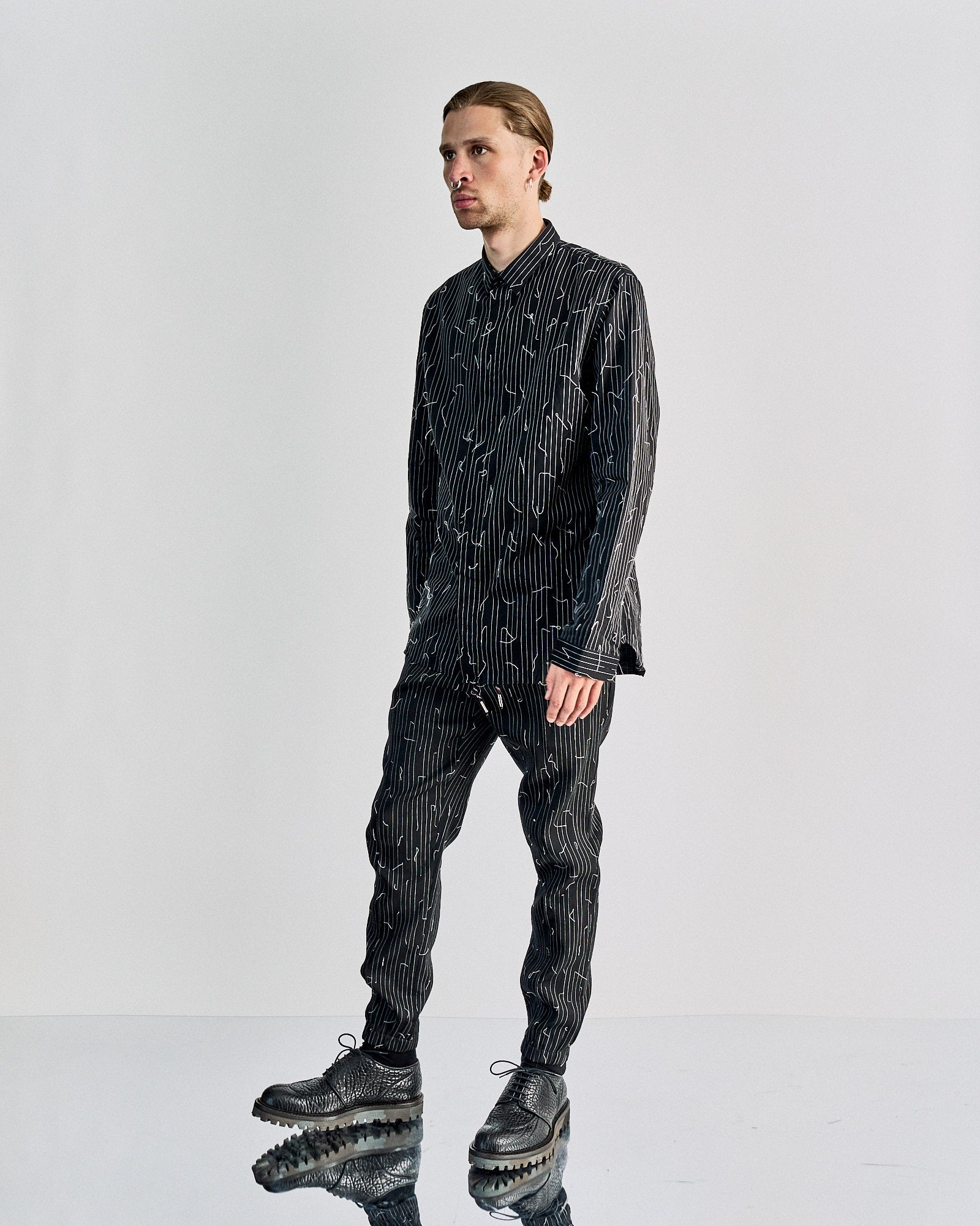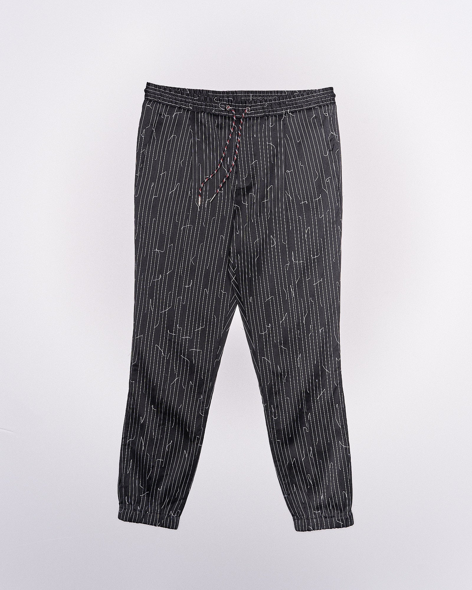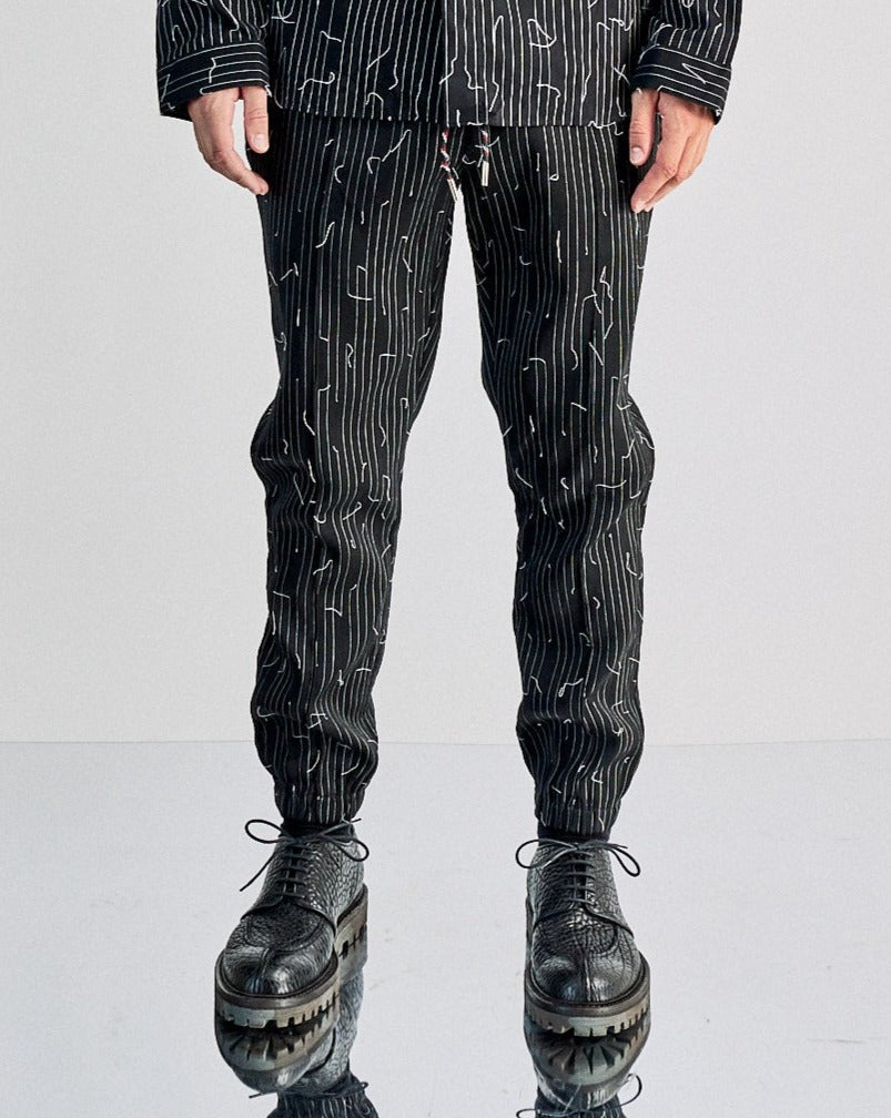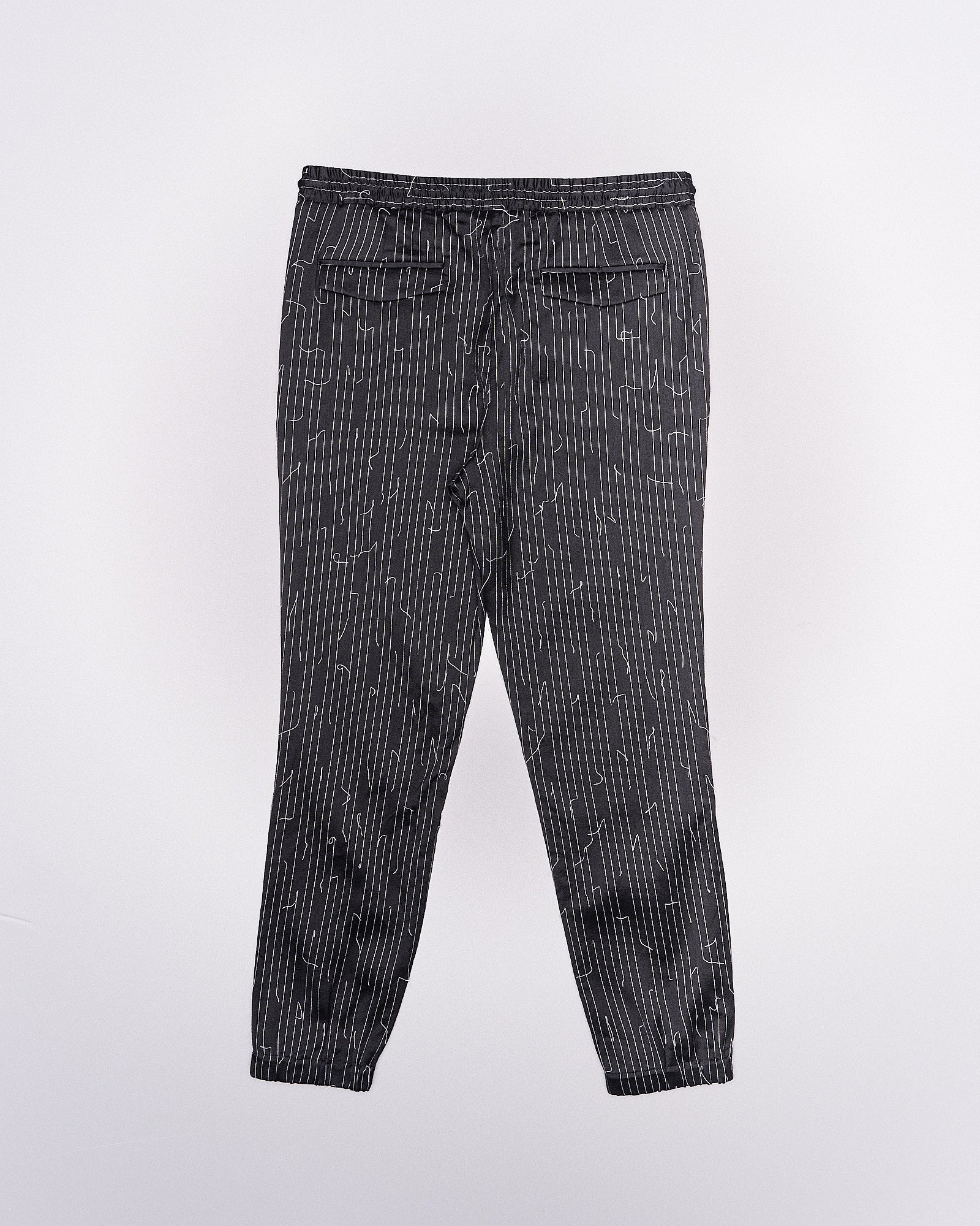 Slim tapered pant with drawstrings and elasticised waistband. Features two side pockets, two back flap pockets with button closures, elastic ankle cuffs. Front pleats and embroidered pinstripe stitches detail the piece. Dry clean only.
