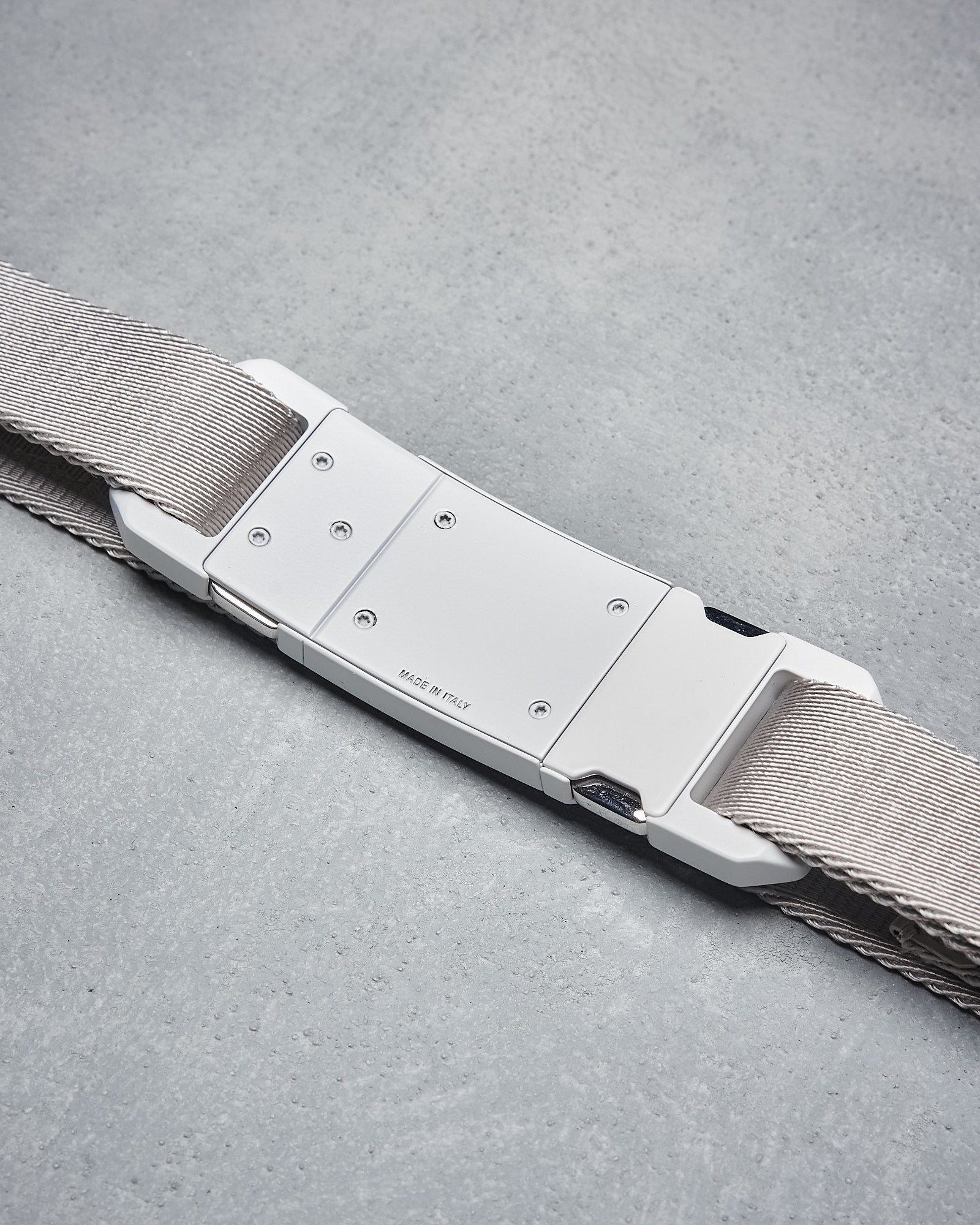 Materials _ Webbing belt, powder coated metal buckle, pebbled leather