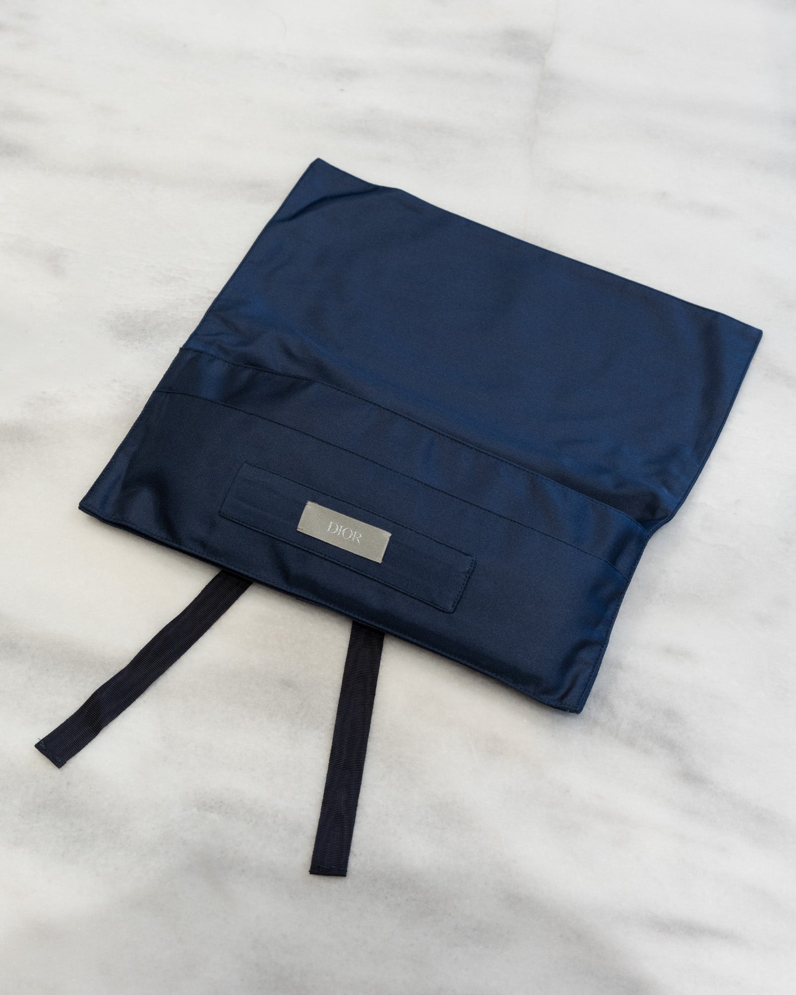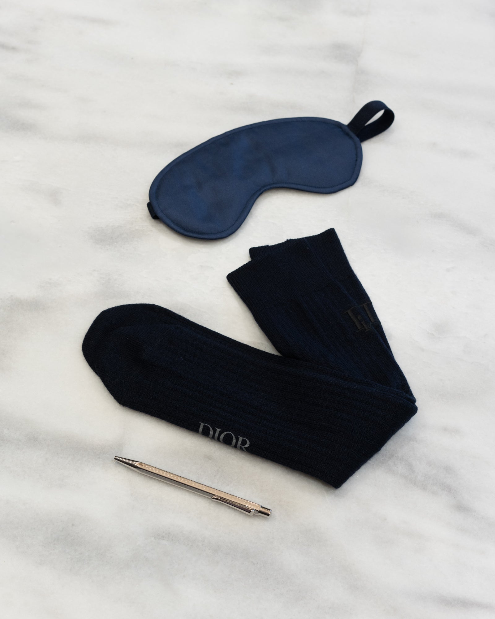 Flawless three-piece travel set nestled in luxurious satin bifold case. Includes a Dior monogram engraved pen, embroidered Navy socks, and a Silk eye mask. The satin case has a tie closure and internal Dior branding.