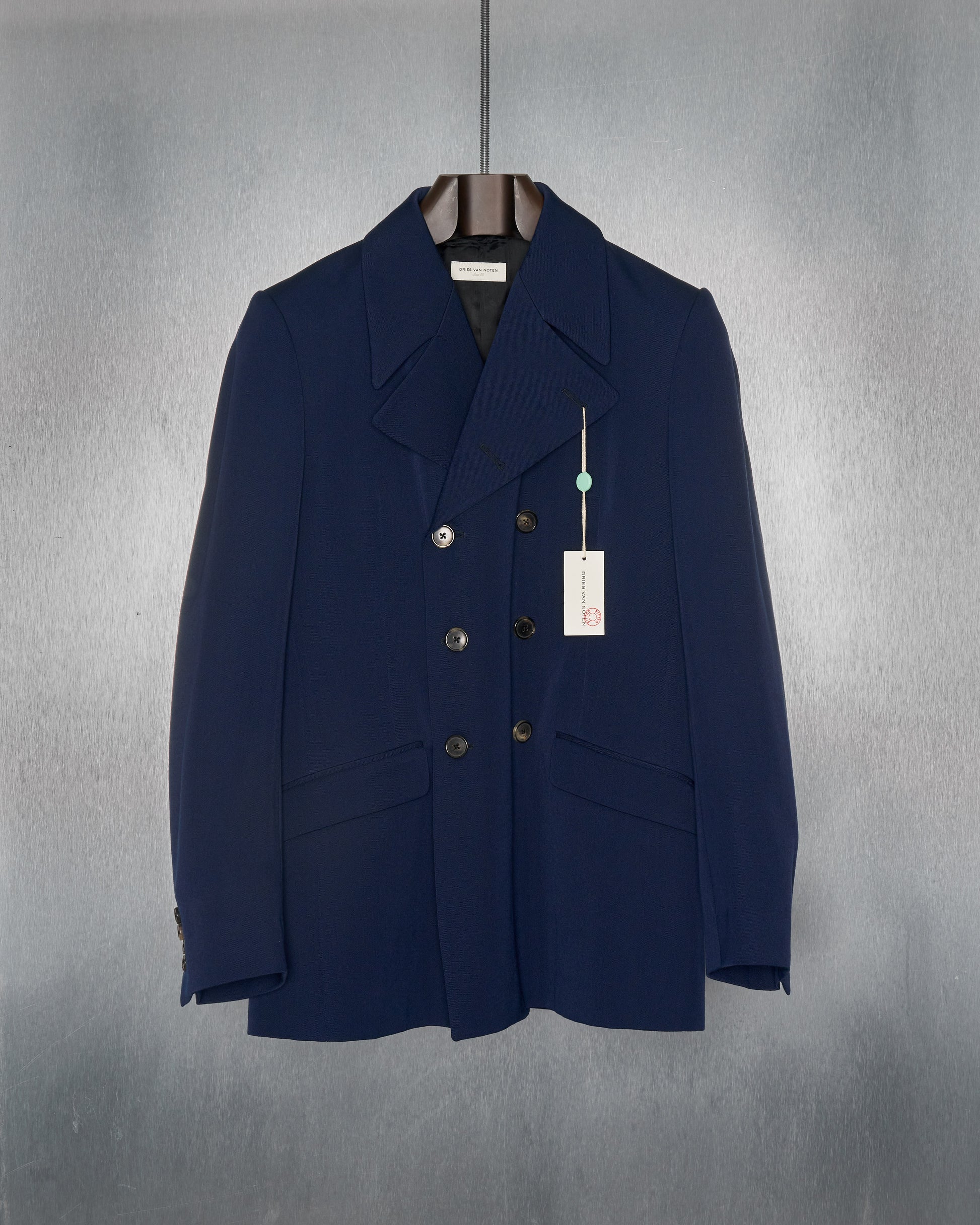 Slim double-breasted coat in heavy wool twill. The cinched waist and turn down collar create an hourglass-like form reminiscent of post-war silhouettes. Features a five-button front with functional boutonniere, two external unopened pockets, two internal pockets and fully lined.