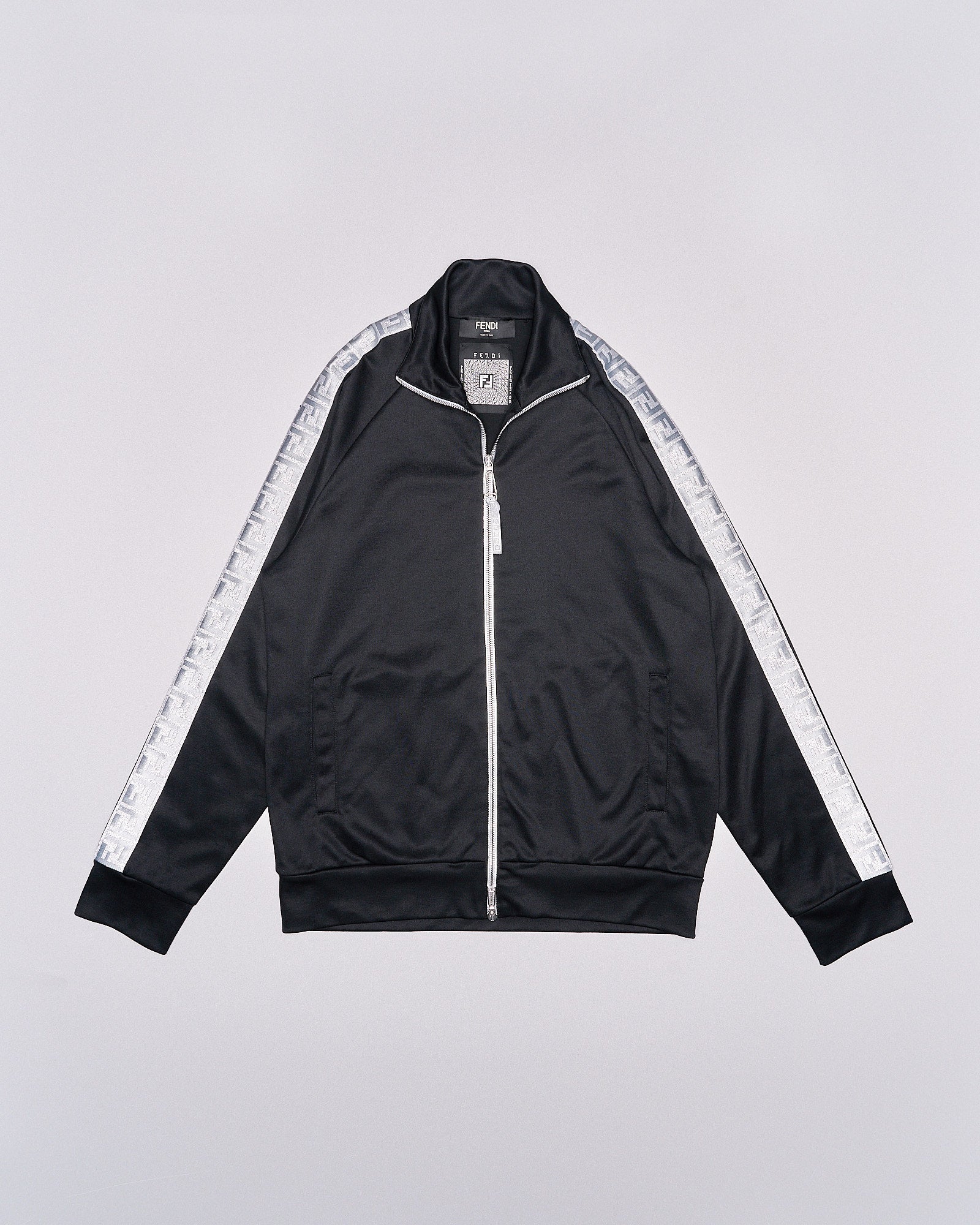 Slim track jacket in soft athletic polyester. Features a front zip closure, elasticised cuffs and hem, two side pockets. The Fendi monogram embellishes the outside sleeve in shining metallic sliver. Matching pants available for the full tracksuit. Delicate cold wash