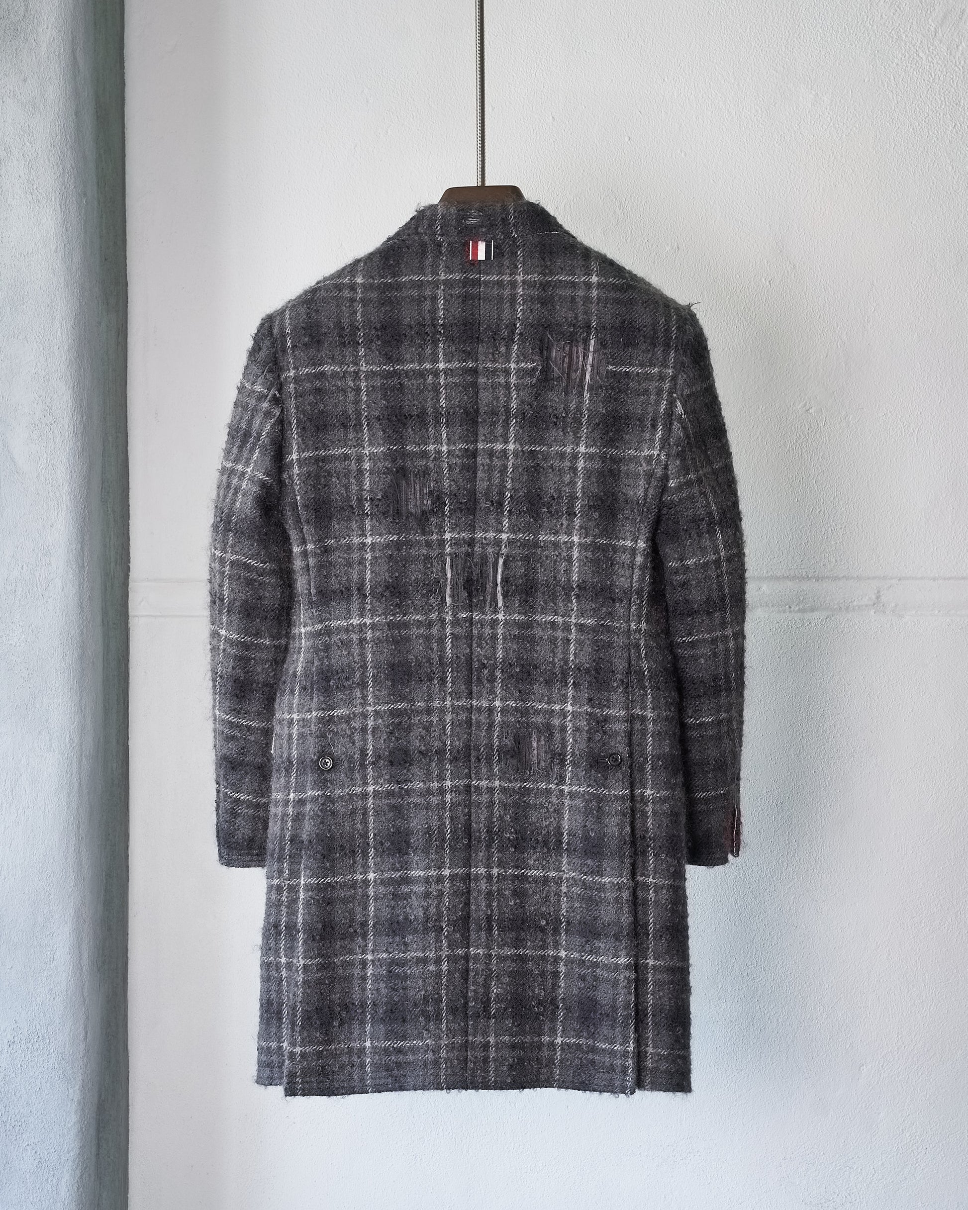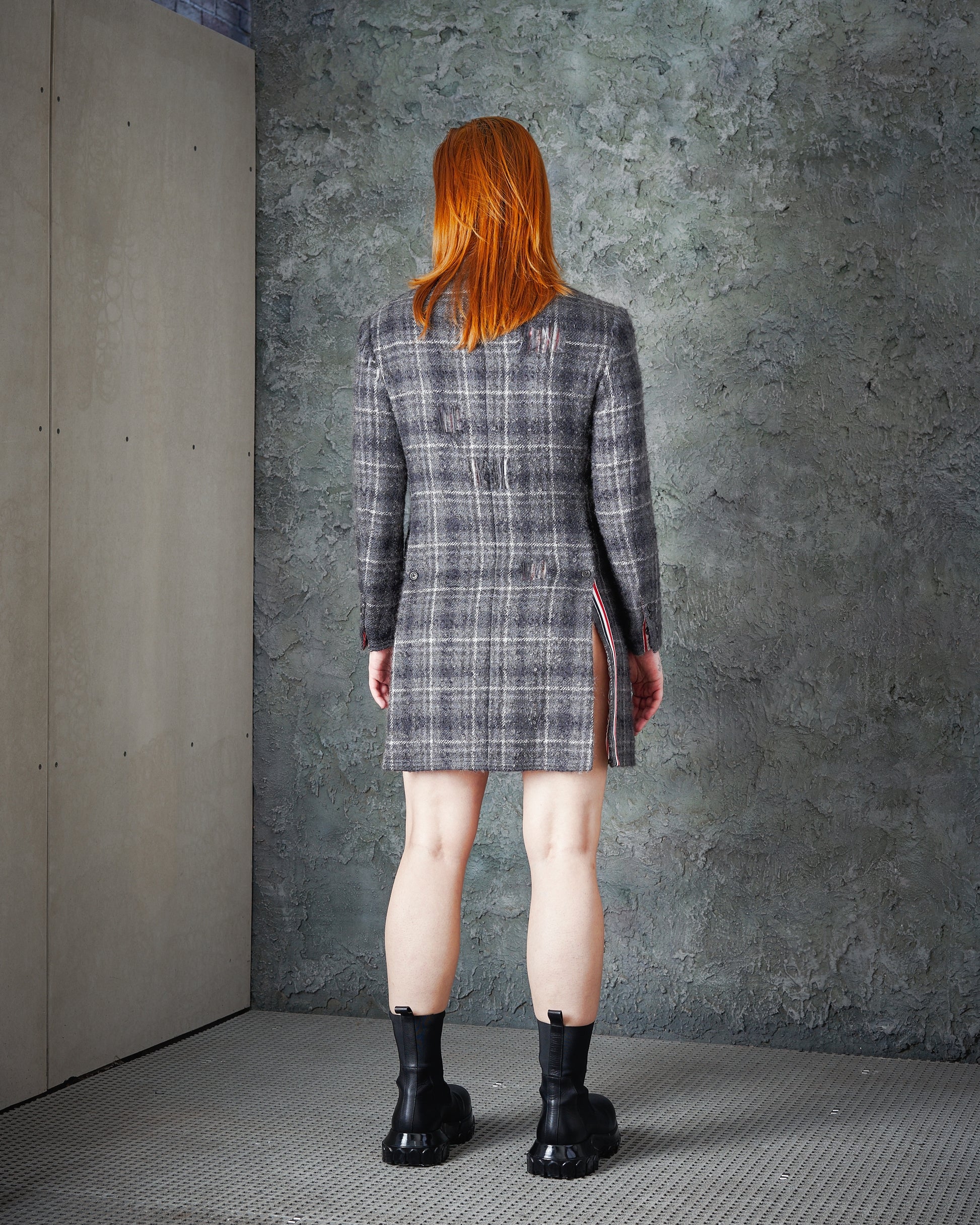 Slim-fitting coat with high notch lapel and hidden front closures. Features three external pockets, functional cuffs, and Browne's signature striped collar tab and lining. The shell is constructed from intentionally distressed wool which exposes internal elements of the piece. Specialist dry clean only