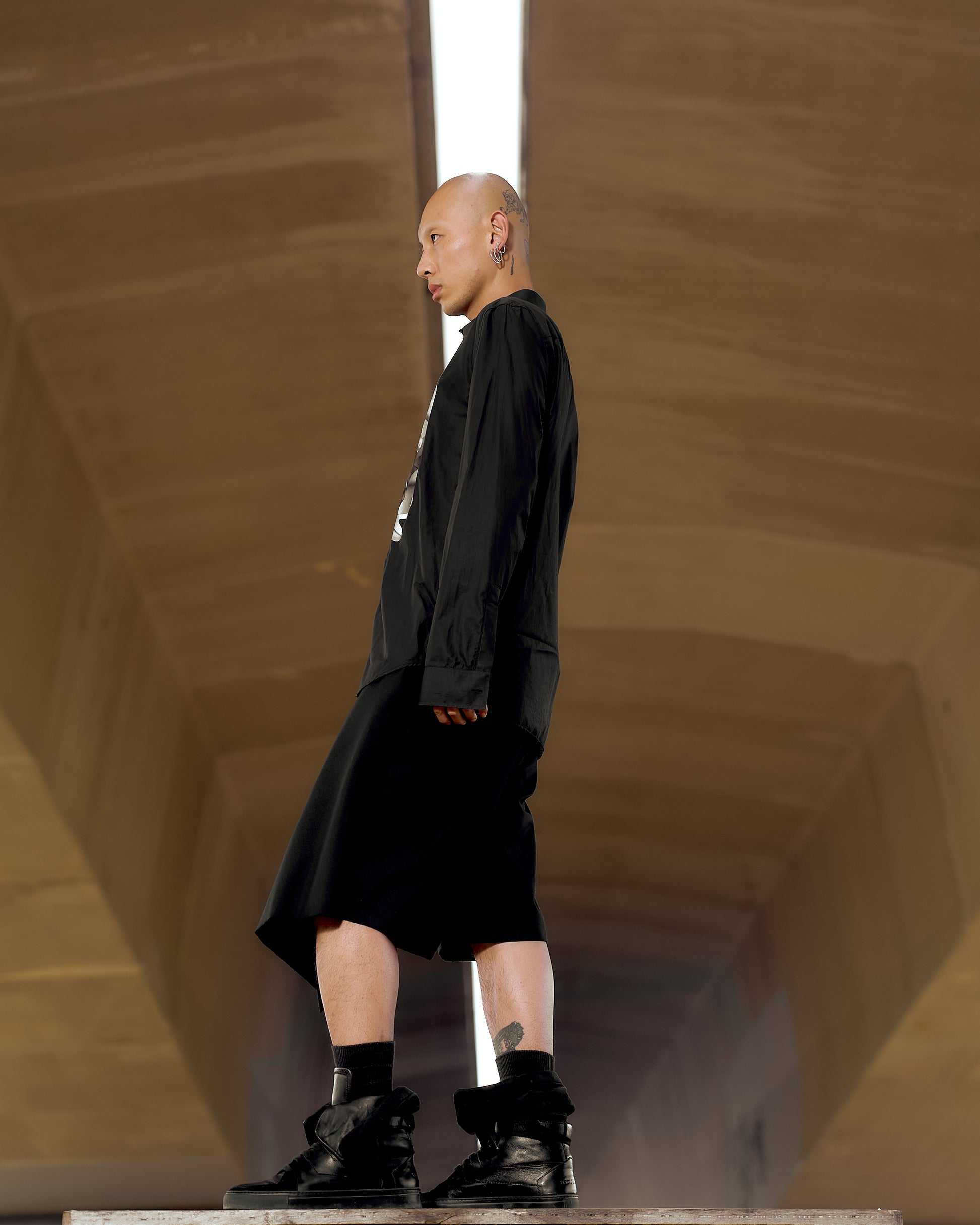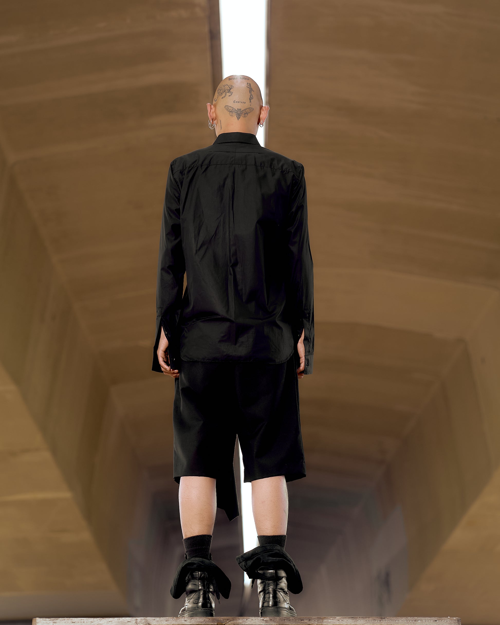 Straight-cut collared shirt in light cotton drill. Features a hidden placket front and a glossy palimpsest graphic across the chest. Warm hand wash only