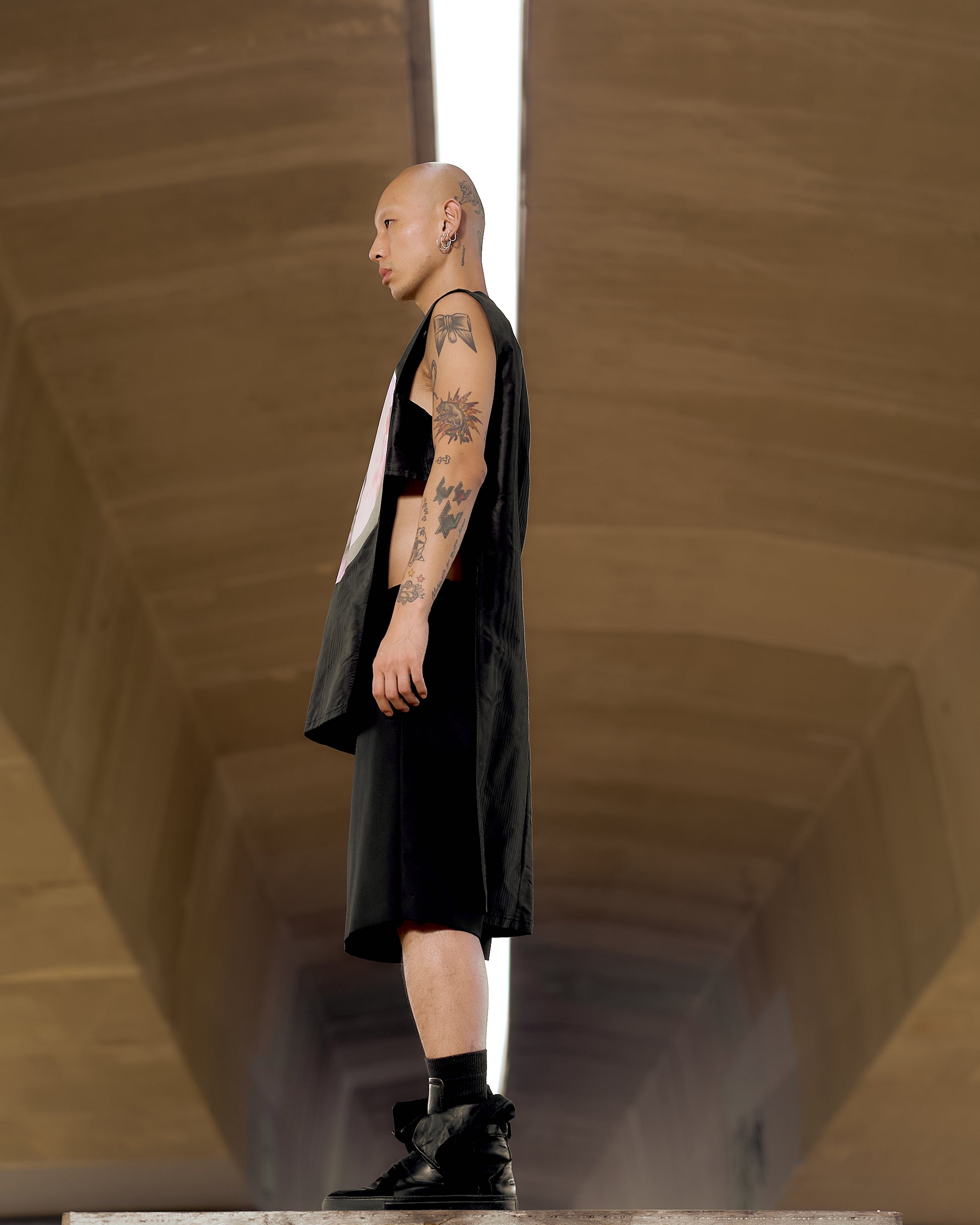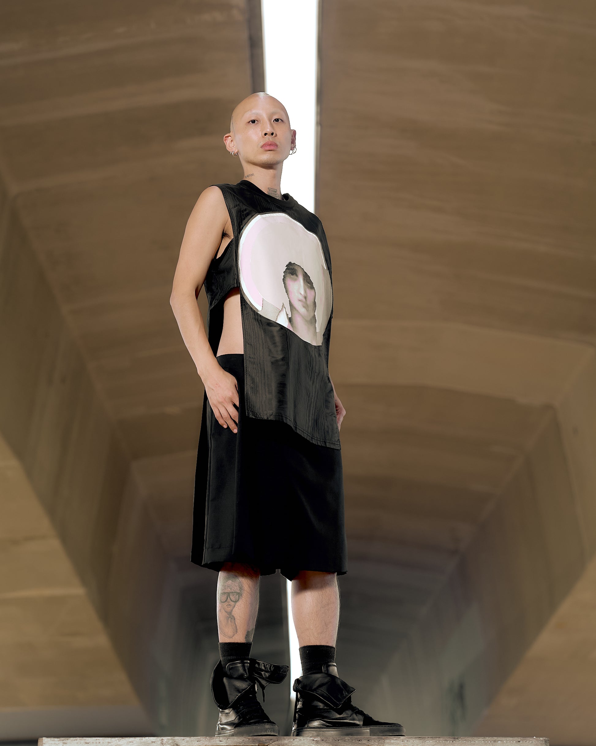 Longline high-low tunic in light nylon drill. The weave of the fabric catches the light, creating a wood grain effect. Features a crewneck with shoulder zip openings, open sides with underarm band, and a graphic screen print of the Mother of Christ adorns the chest. Delicate hand wash.