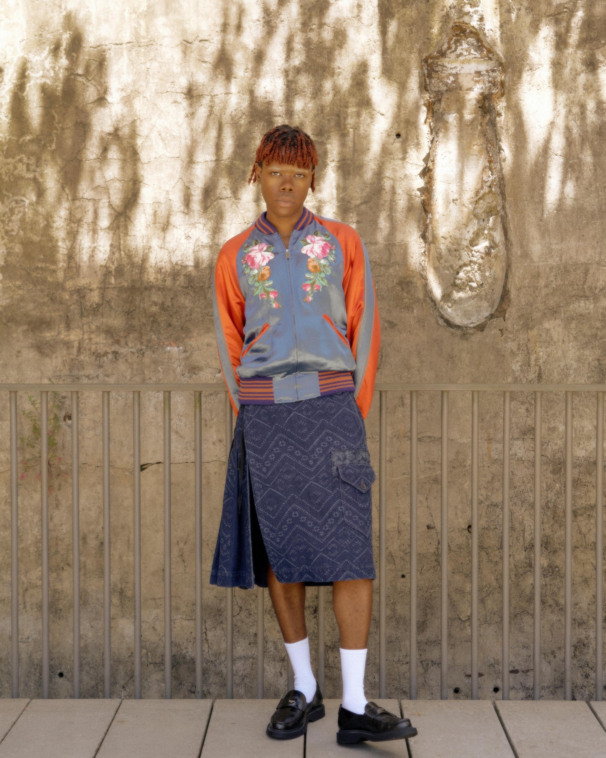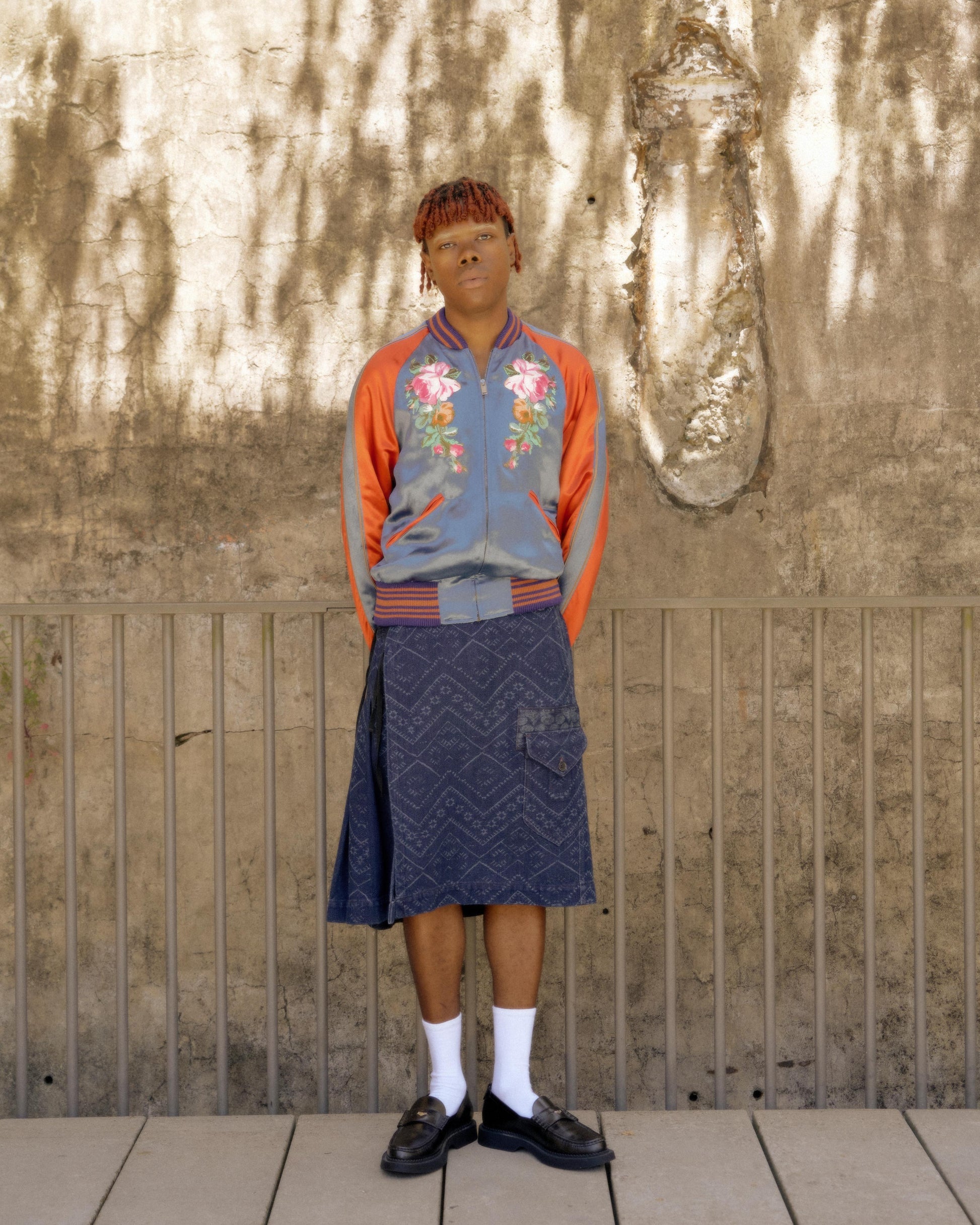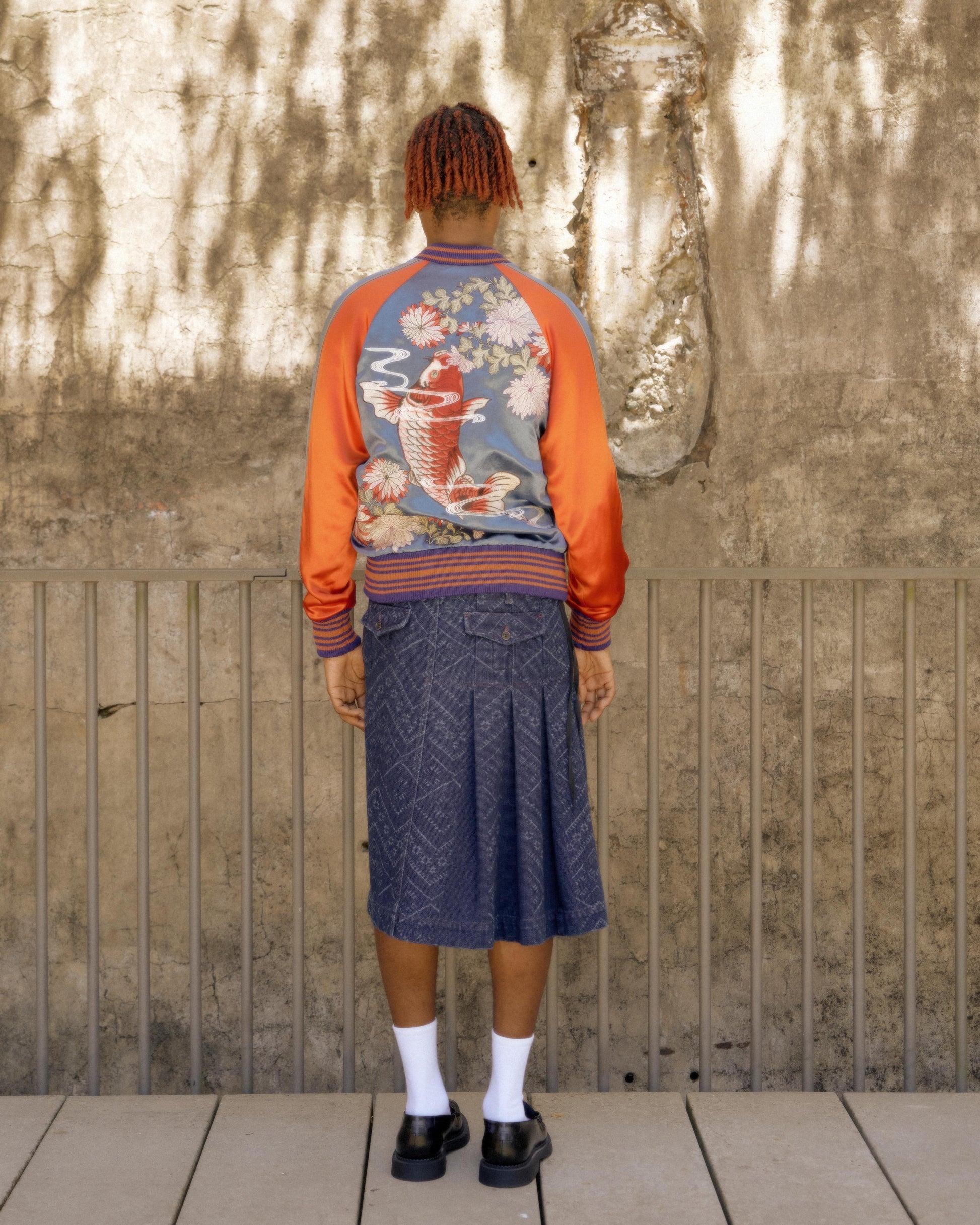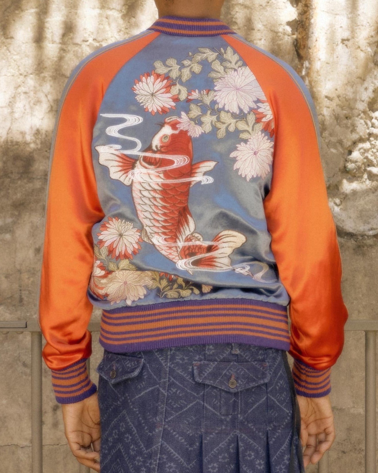 Vintage-inspired souvenir jacket in smooth vegan silk with jacquard satin lining. Hand-embroidered lace appliques are stitched to the face of the jacket; all-over stitched embroidery decorates the back. Features zip front, two external and internal pockets, ribbed cuffs and base. Dry clean only
