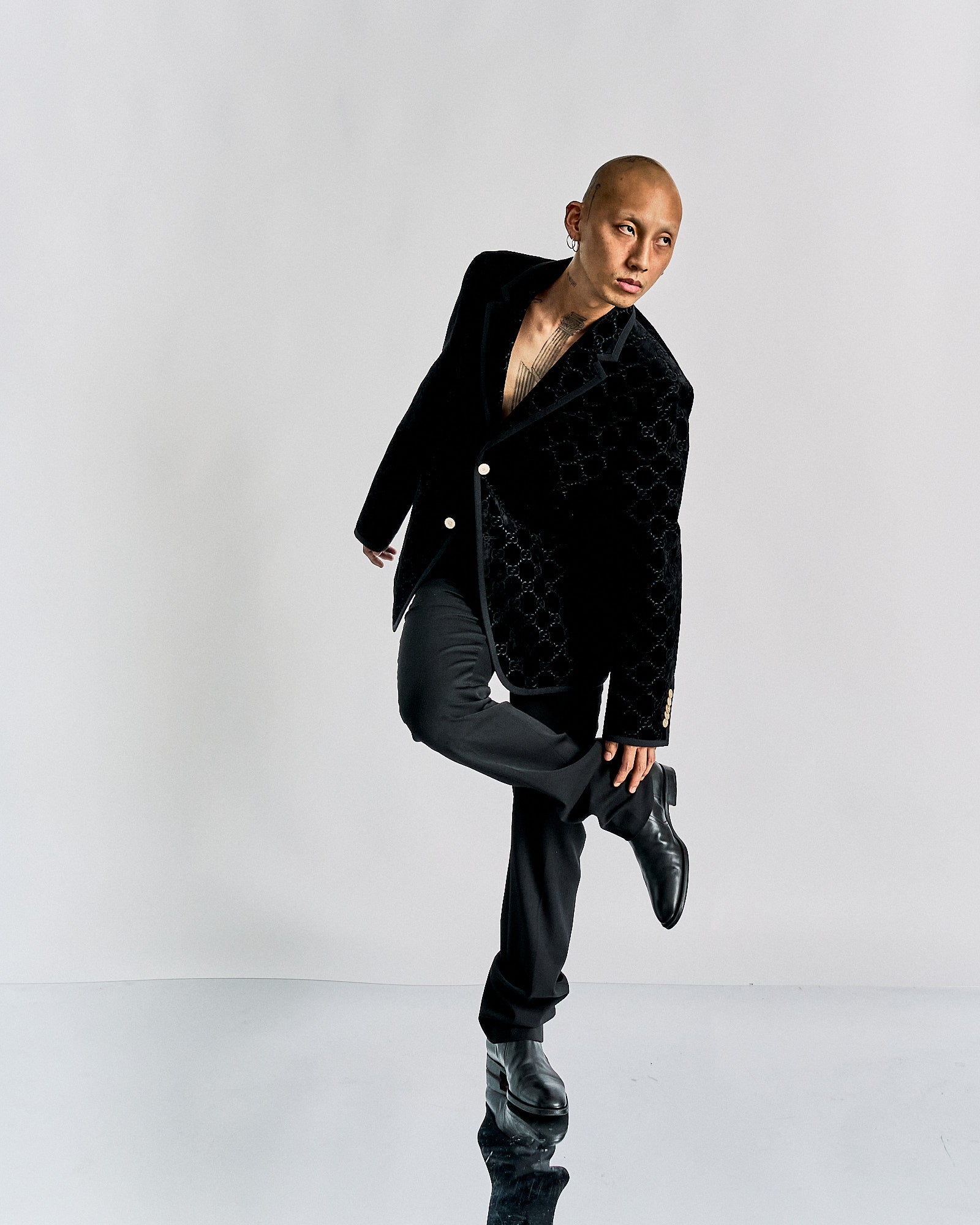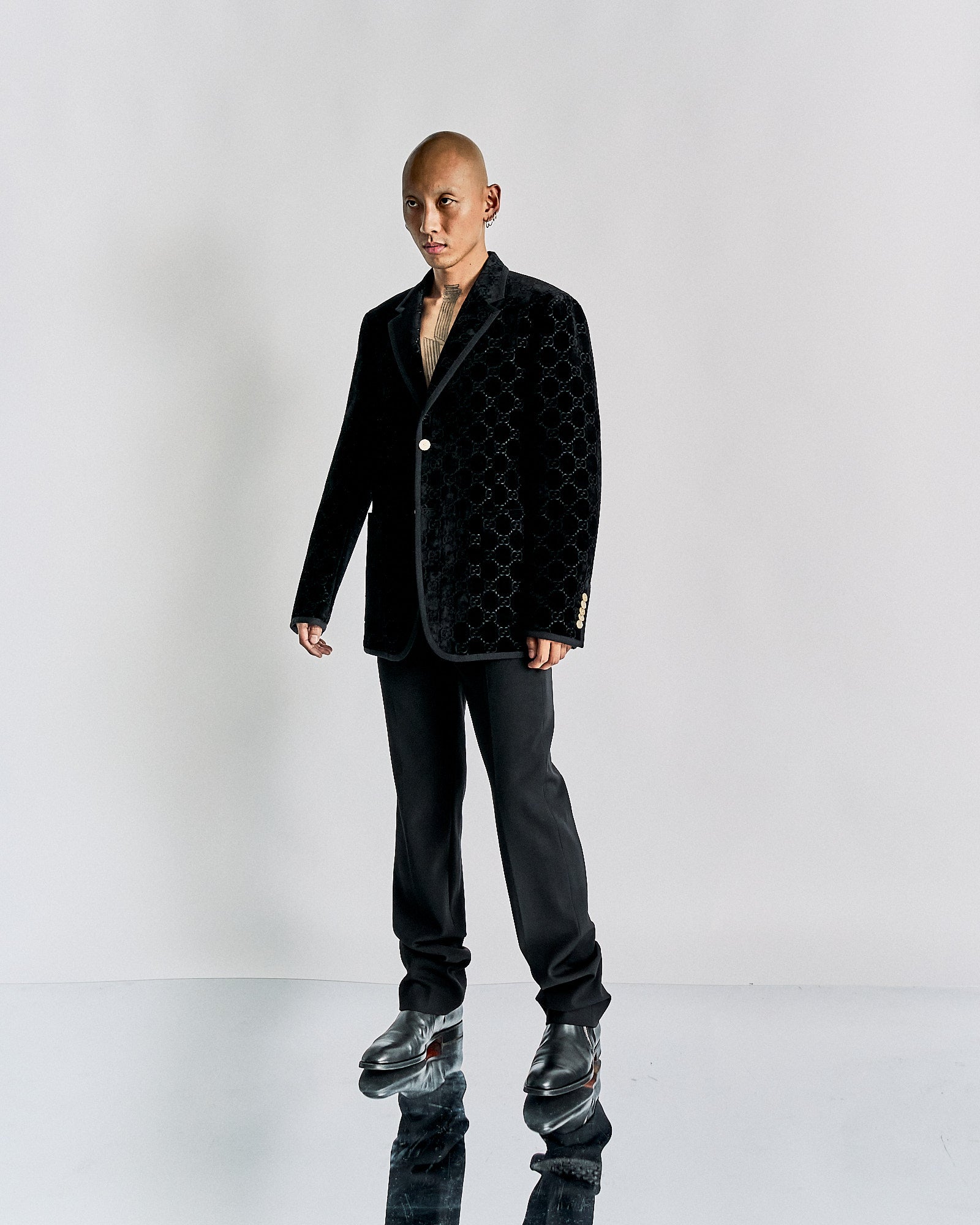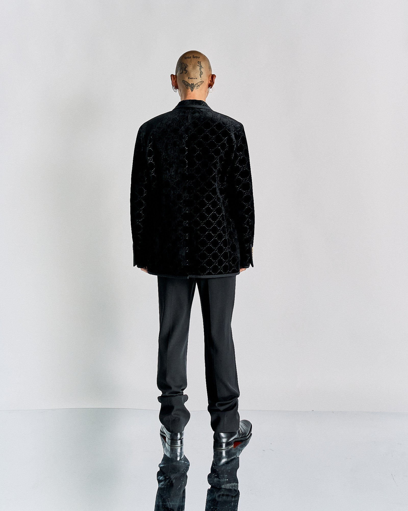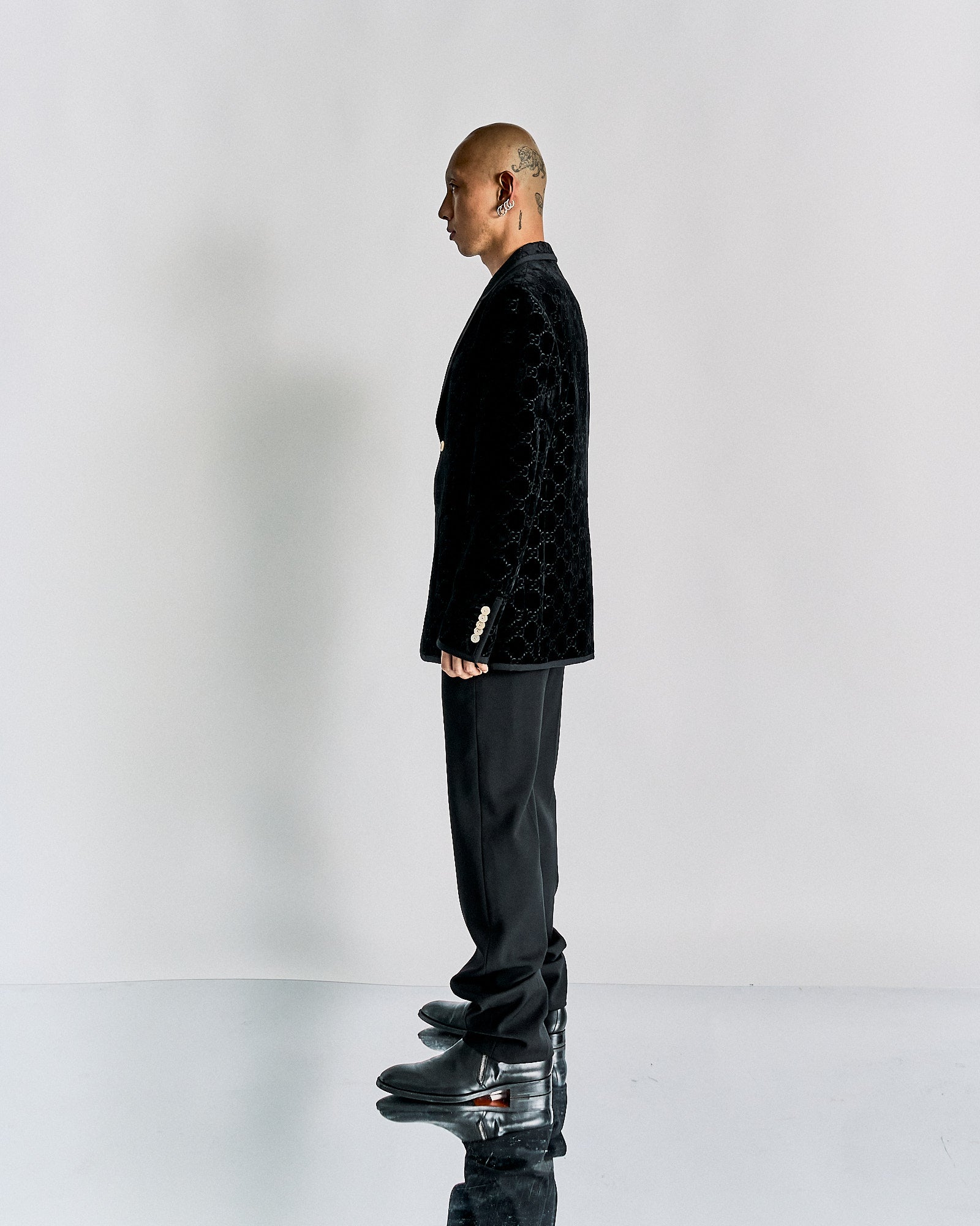 Mid-weight evening blazer in monogrammed velvet. High notch lapels and patch pockets provide a relaxed and contemporary flair. Features half-canvassed construction, full internal lining. Dry clean only