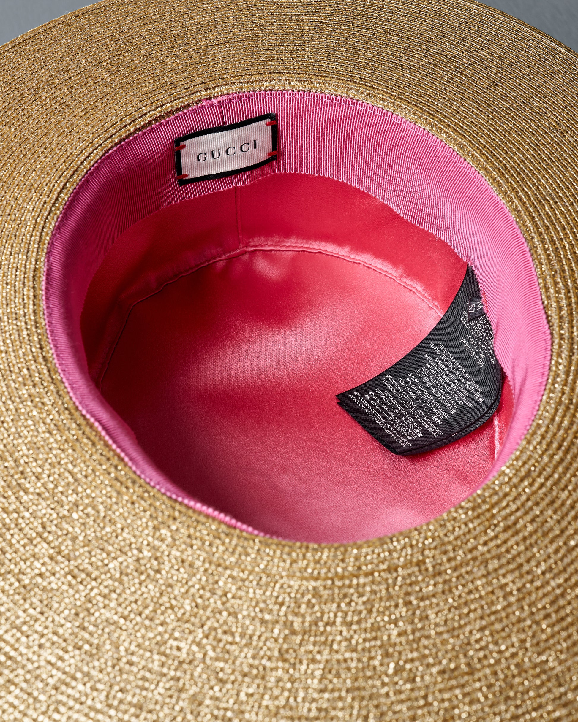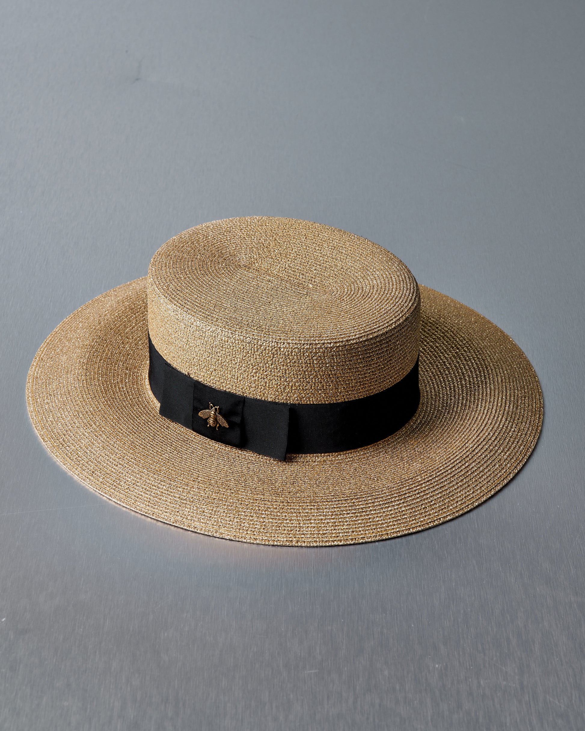 Vintage-inspired high-domed hat crafted from straw effect fabric interwoven with shiny lamé threads. Features a grosgrain band trim with bow, metal bee pin, soft internal lining.