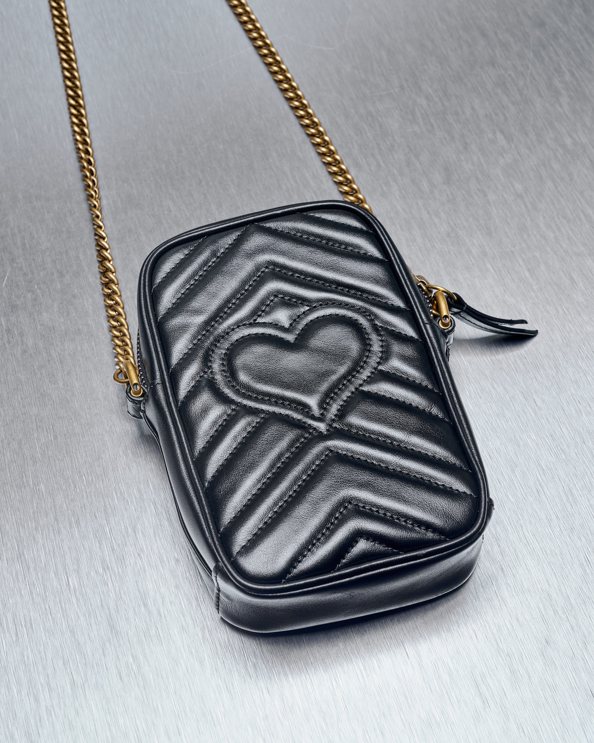 Soft quilted phone bag in matelassé chevron leather. The interlocking brassy GG on the gront gives way to a tonal stitched love heart on the reverse. Features a zop opening with leather pull, gentle microsuede lining, two leather card slots, metal hardware throughout. The chain strap can accomodate shoulder or cross-body wear. Room for your phone, cards, and keys.