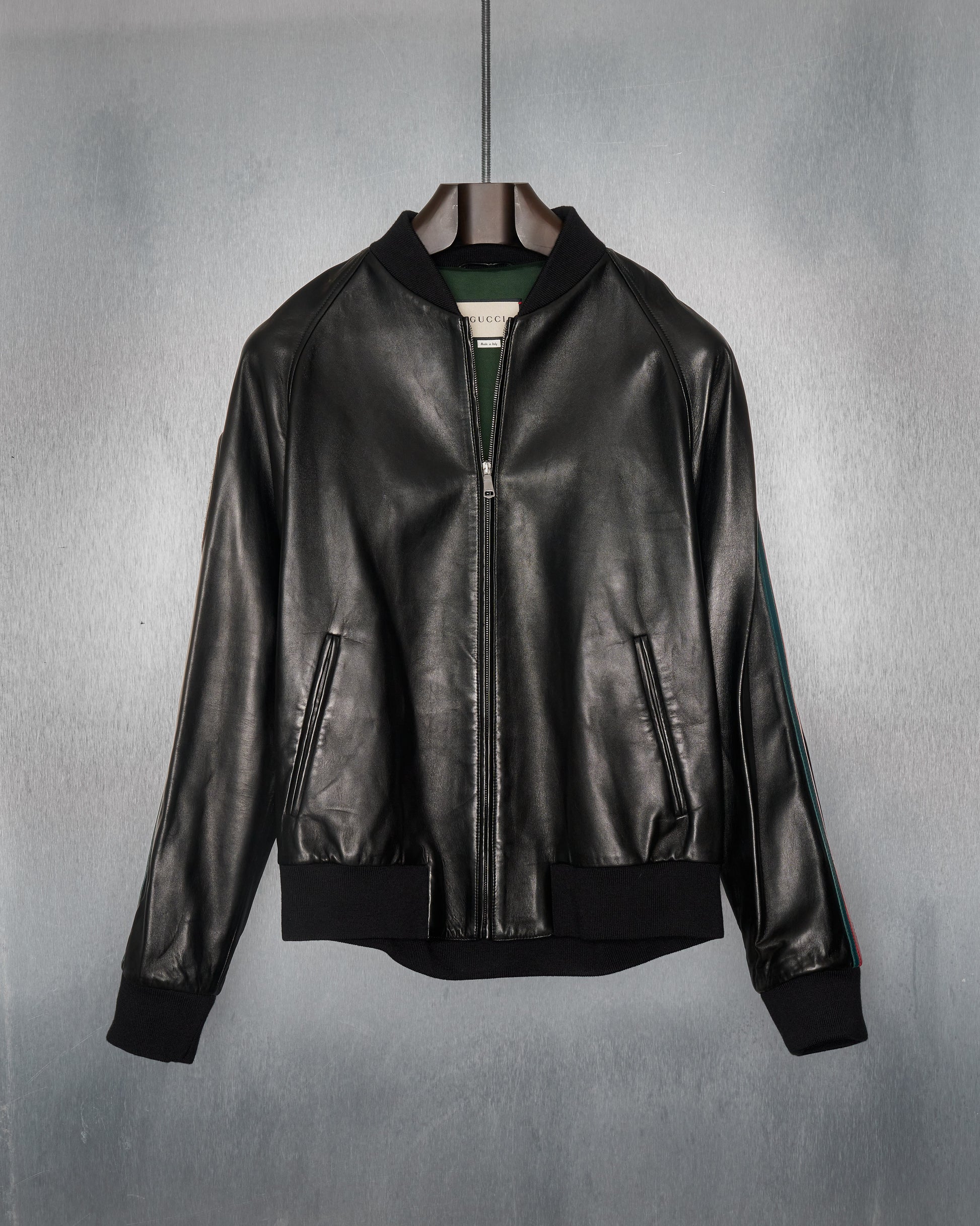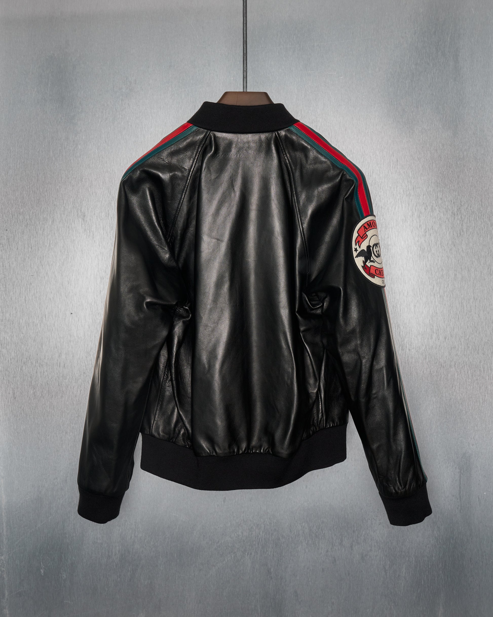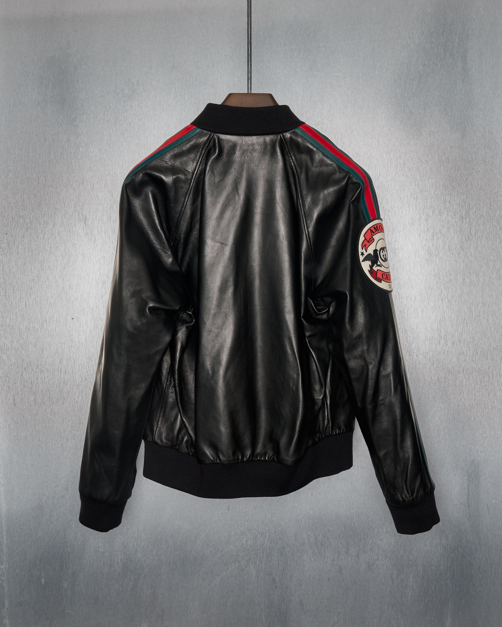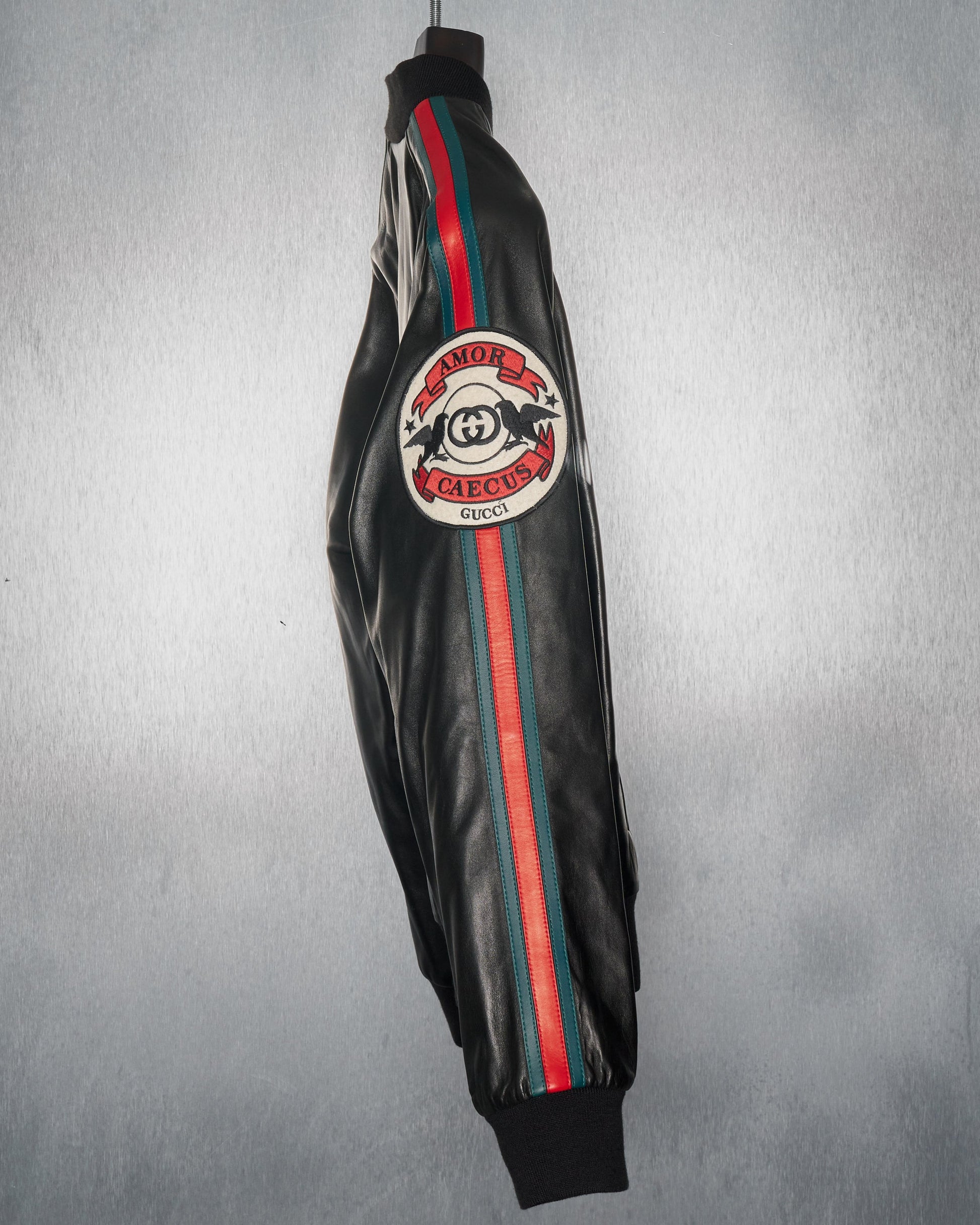 Racing-inspired leather jacket in soft lambskin with a true-to-size silhouette. A large patch decorates the right arm: ‘amor caecus’ -- Latin for ‘blind love’. Features gunmetal front zip closure, confortable raglan sleeve construction, two hip pockets, two internal pockets, ribbed finishings throughout. Fully lined in olive-tone viscose twill. Specialist clean only