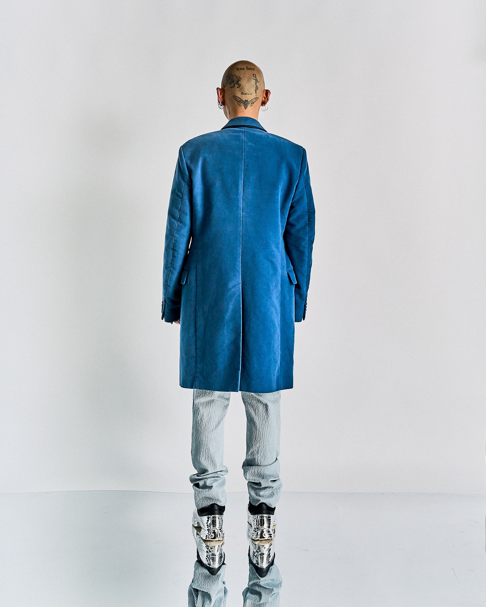 Thick knee-length coat with notch lapel and three-button closure behind hidden placket. Features two external hip pockets and single chest pocket, non-functional four-button cuffs. Fully lined. Dry clean only