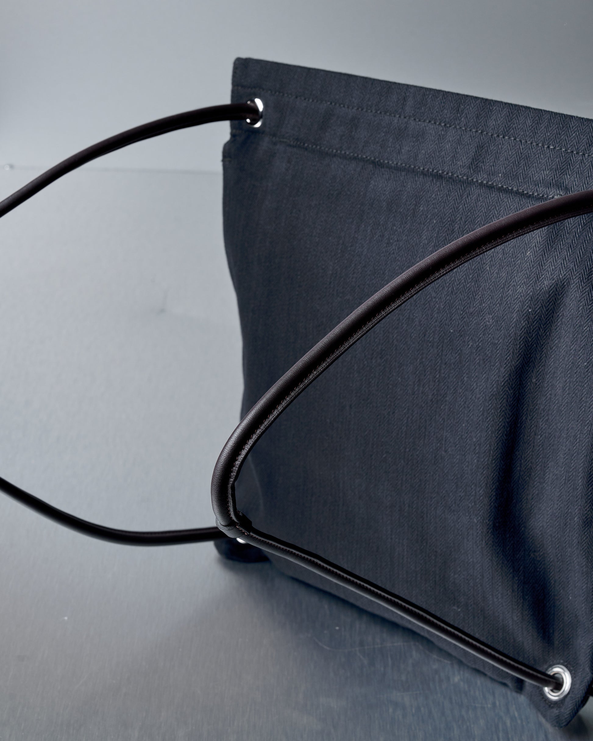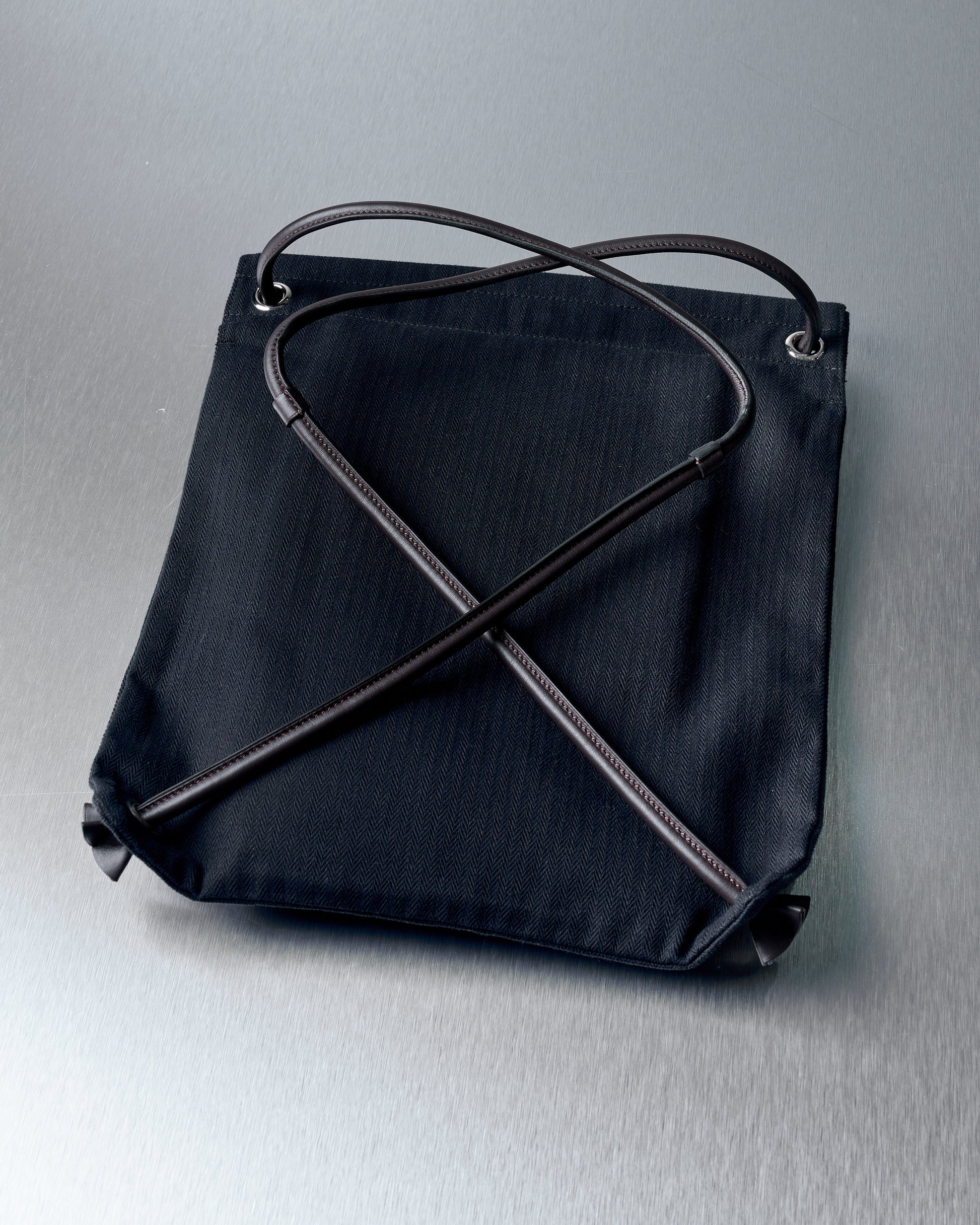 Convertible bag in sturdy herringbone cotton with palladium-plated hardware. The smooth leather straps can be worn over the shoulder or pulled inwards; transforming the piece into a slim backpack. Features an open top with reinforced banding, internal zip pouch. Room for your iPad, books, and lunch.
