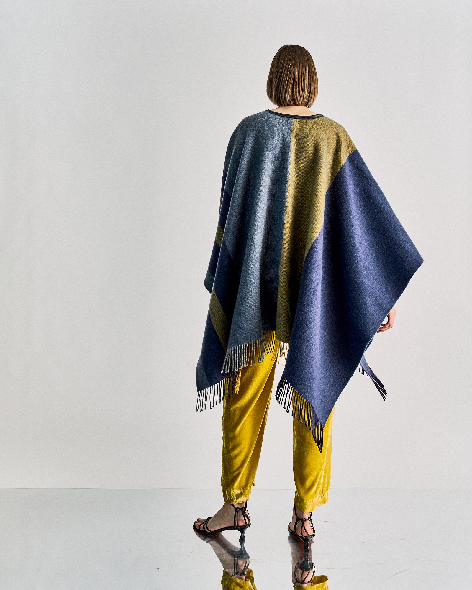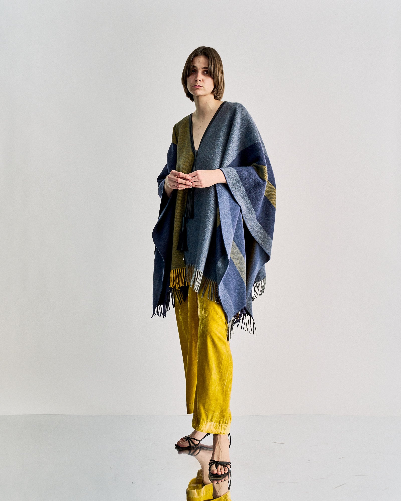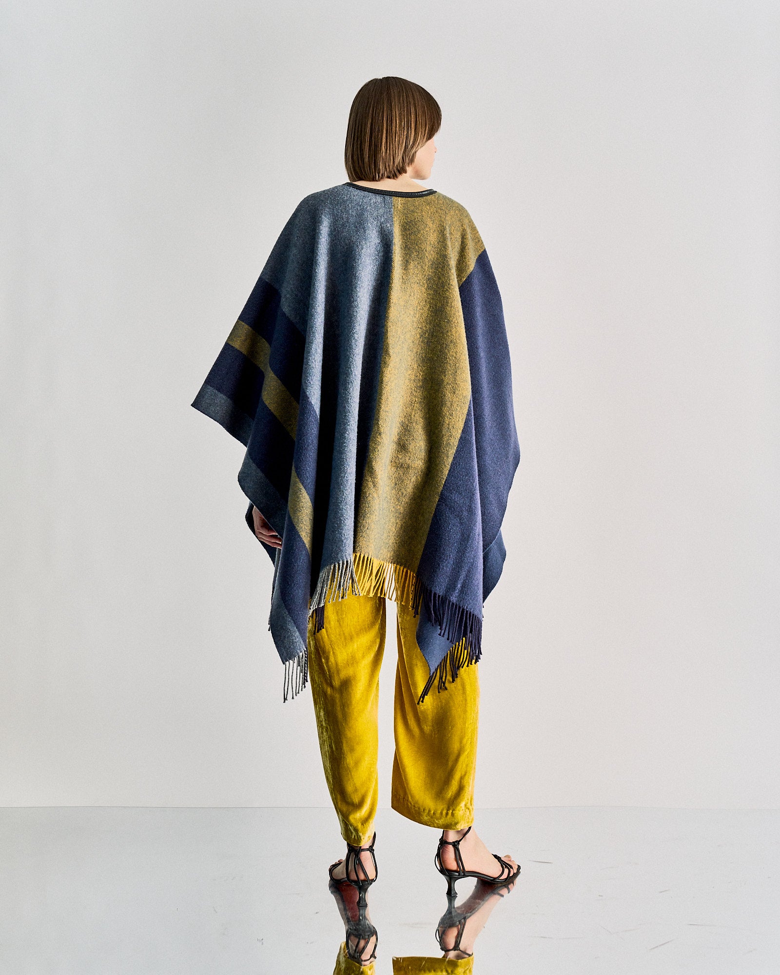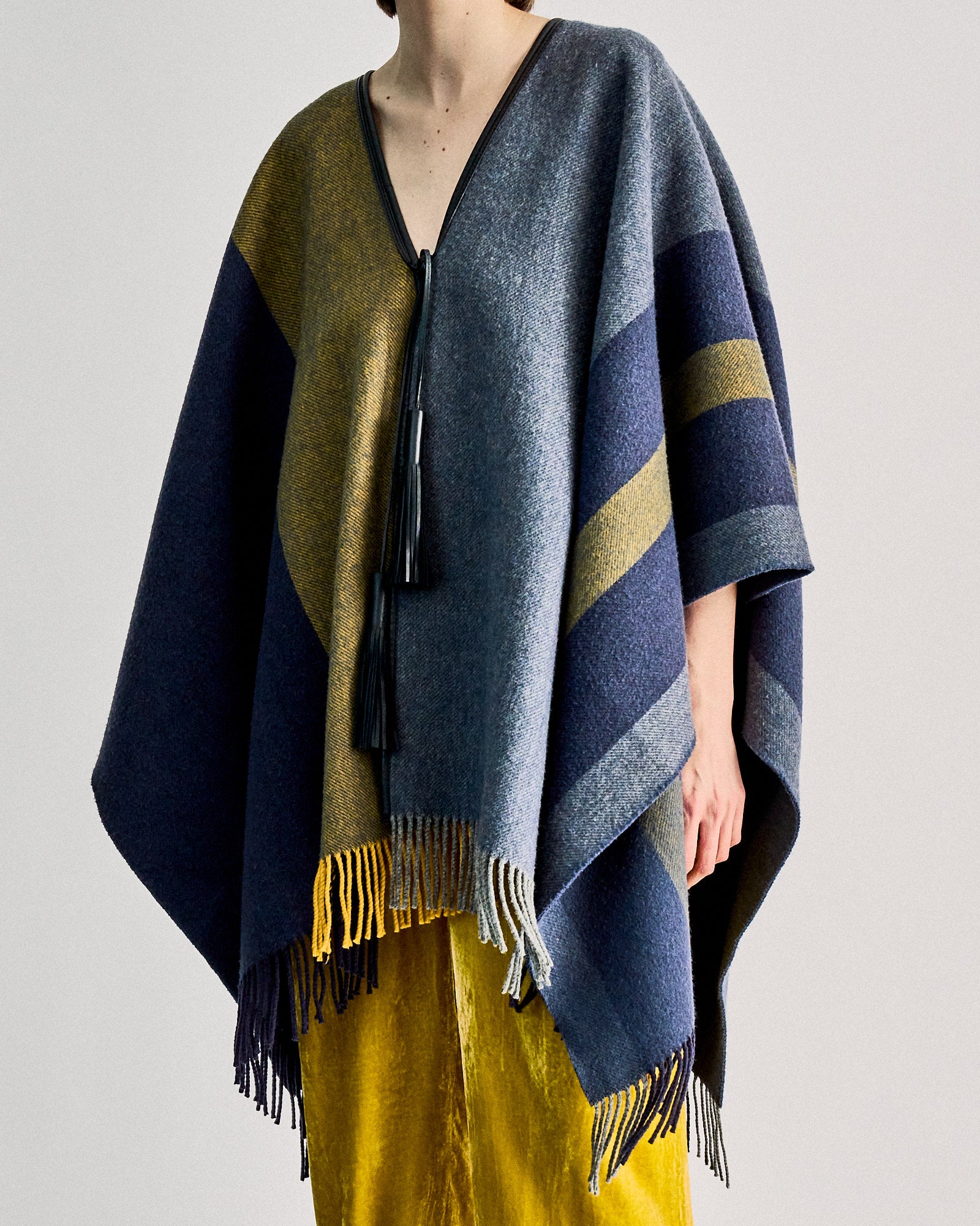 An effortless poncho inspired by racehorse blankets used throughout the 19th century. This piece is constructed from a wool cashmere blend and features leather pull finishing with fringe details around the base. Immerse yourself in its romantic simplicity. Dry clean only