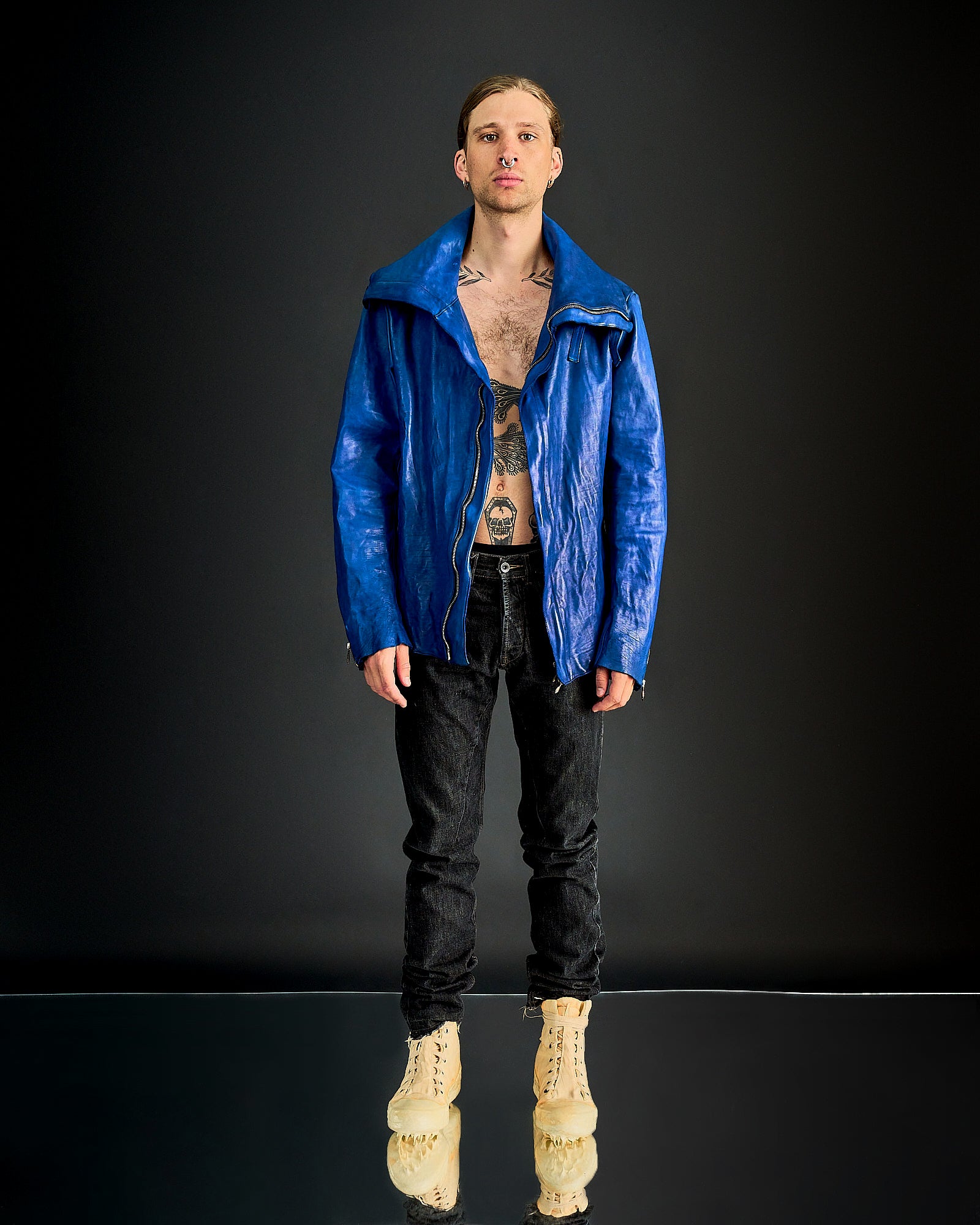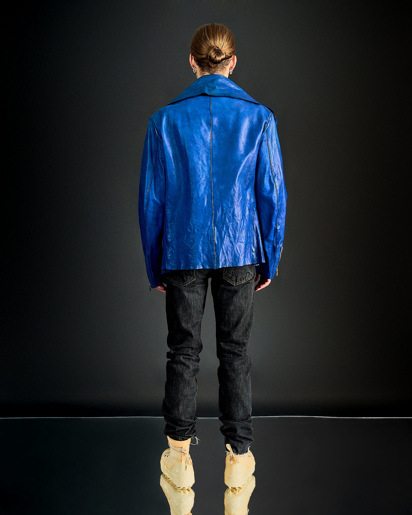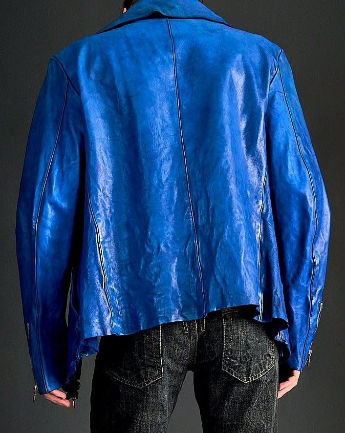Brash blue jacket constructed from sanded equine leather with a lustrous pigmented finish. Features a curved asymmetrical double-zip closure and sculptural collar with darted structure. Two side zip pockets, zip cuff closures, and back vent. Specialist clean recommended.