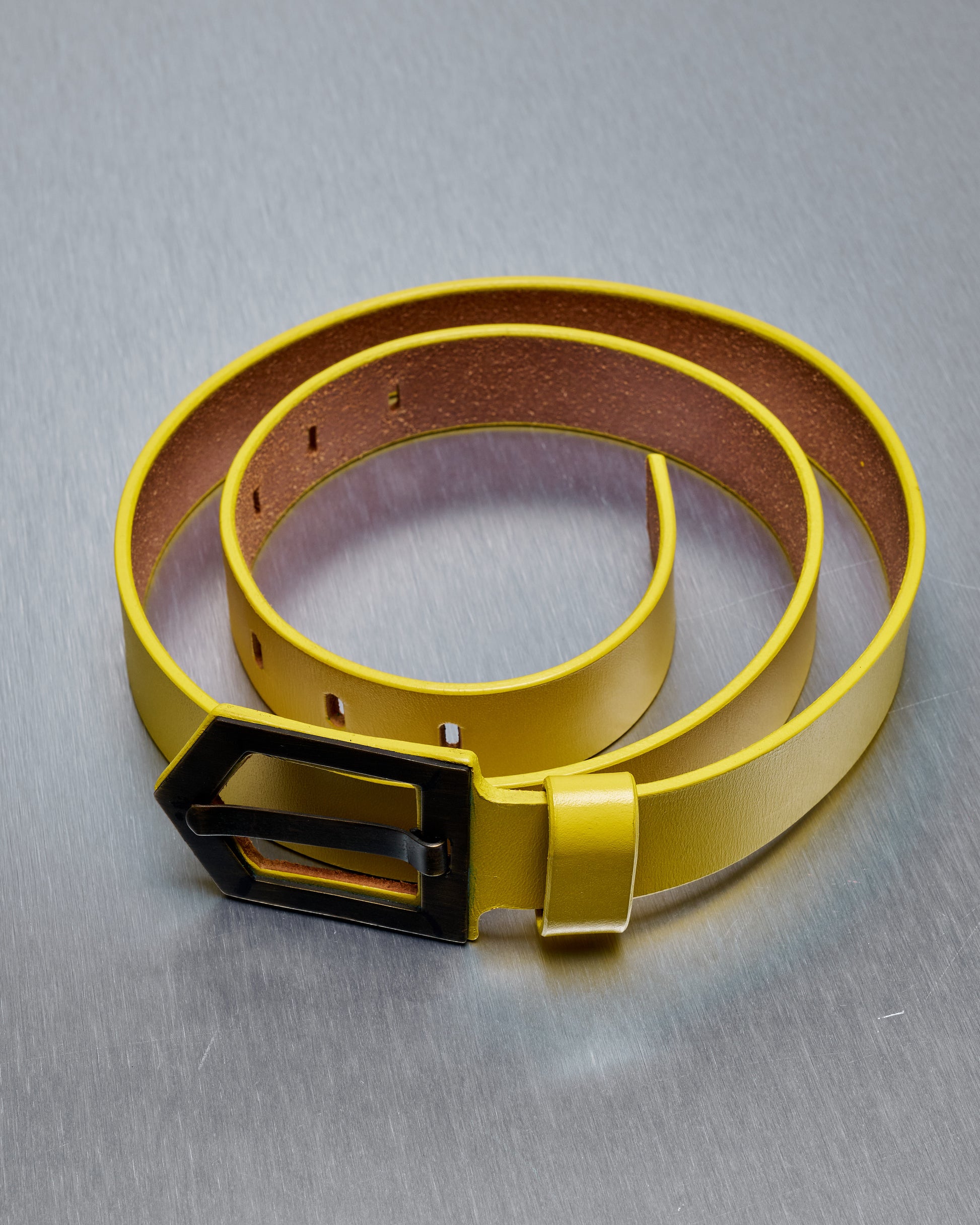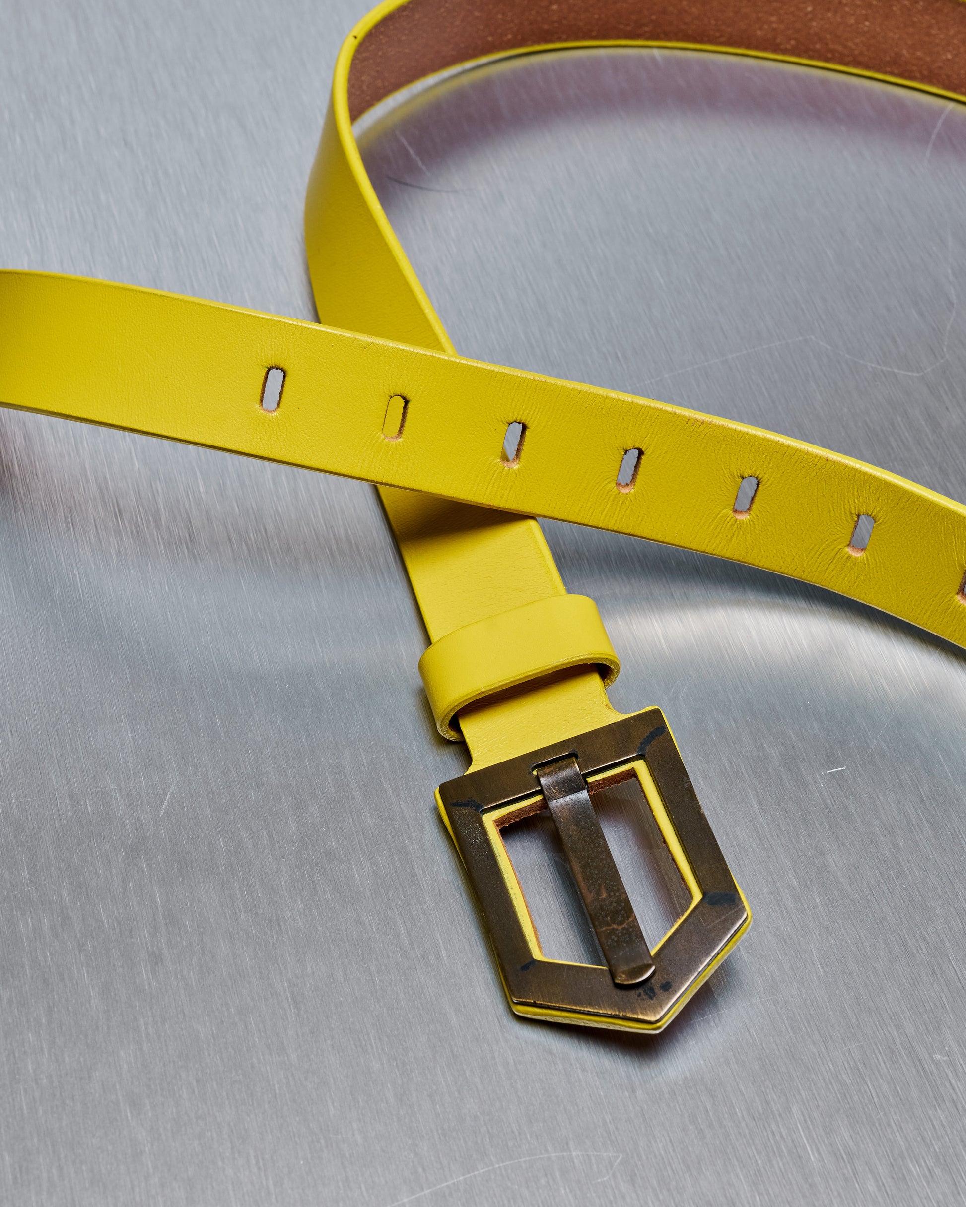 Geometric belt in smooth sanded canary leather. Features a brushed bronze-tone buckle with painted stitch motif. Debossed branding stamped on reverse.