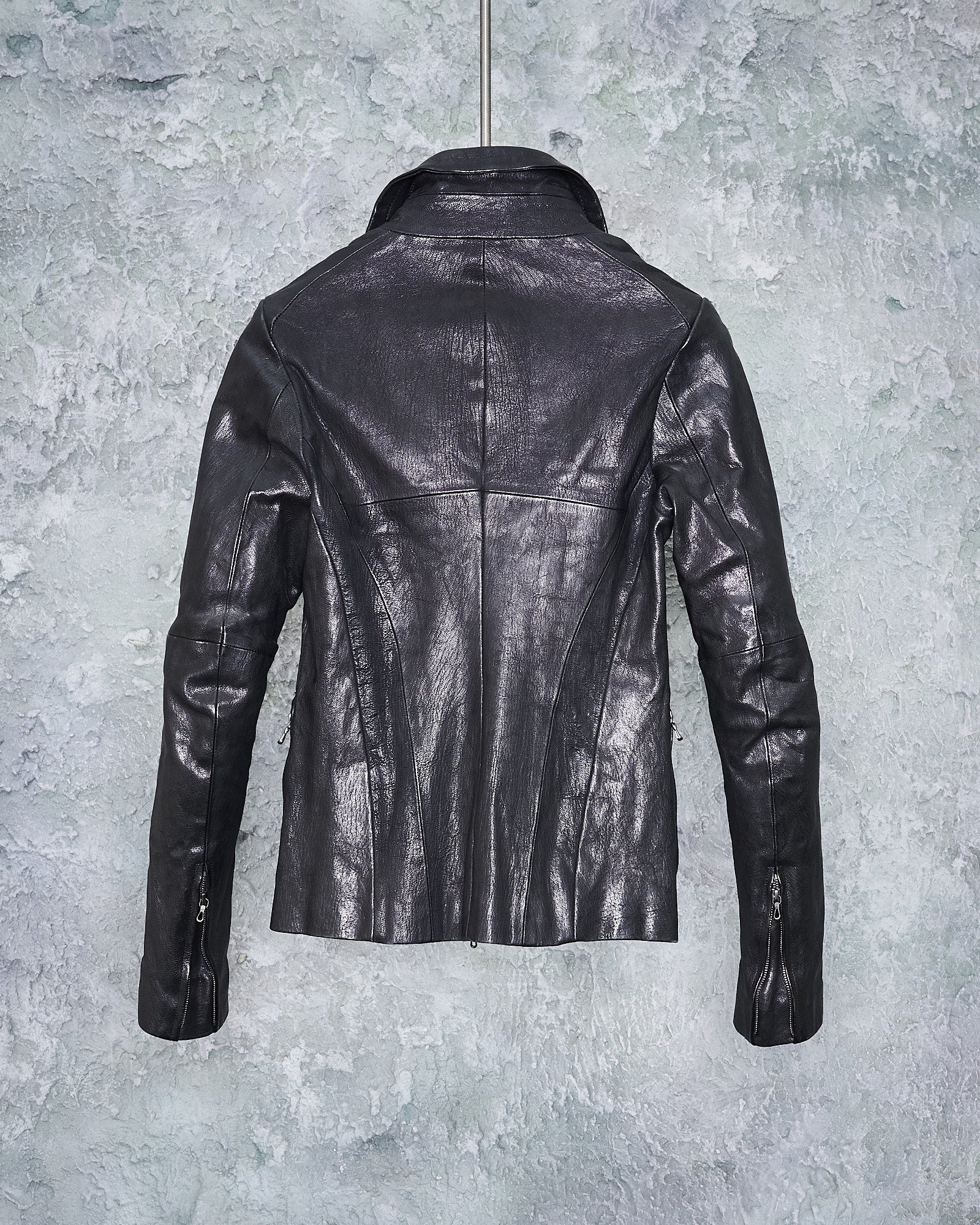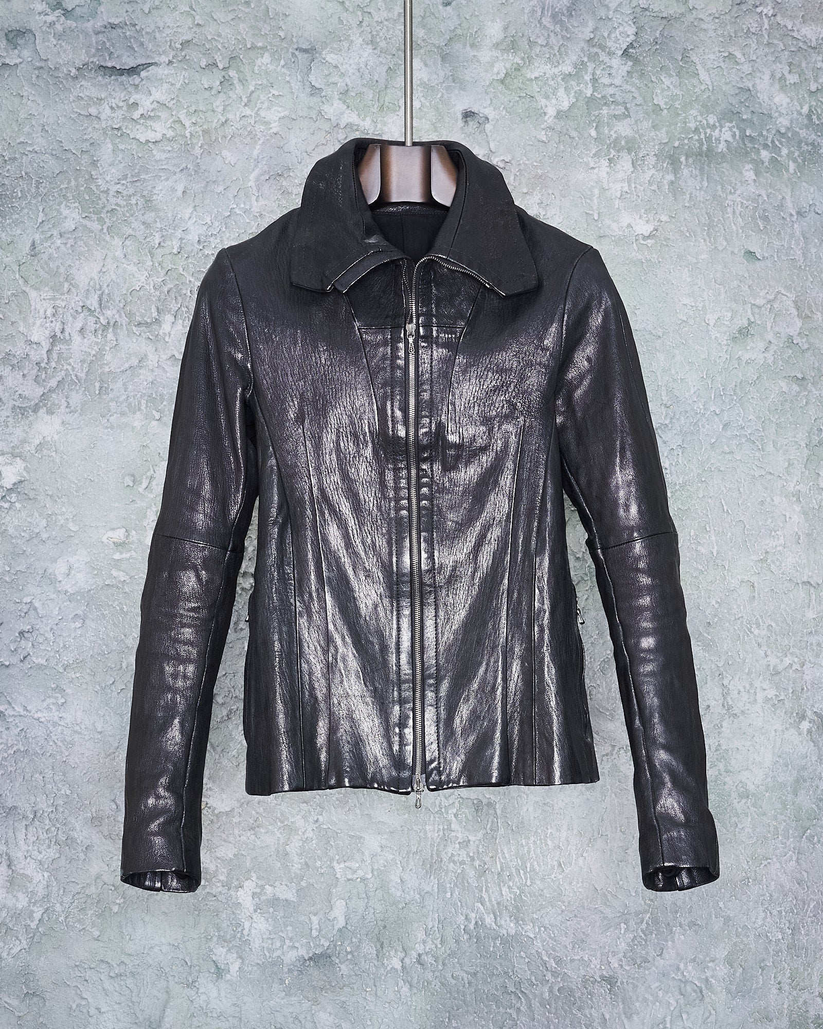 Slim leather jacket constructed from heavyweight grained leather with exaggerated spread collar and double zip closure. The collar can be fully zipped, creating a jutting architectural form. Features side pockets, zip cuffs. Specialist clean only