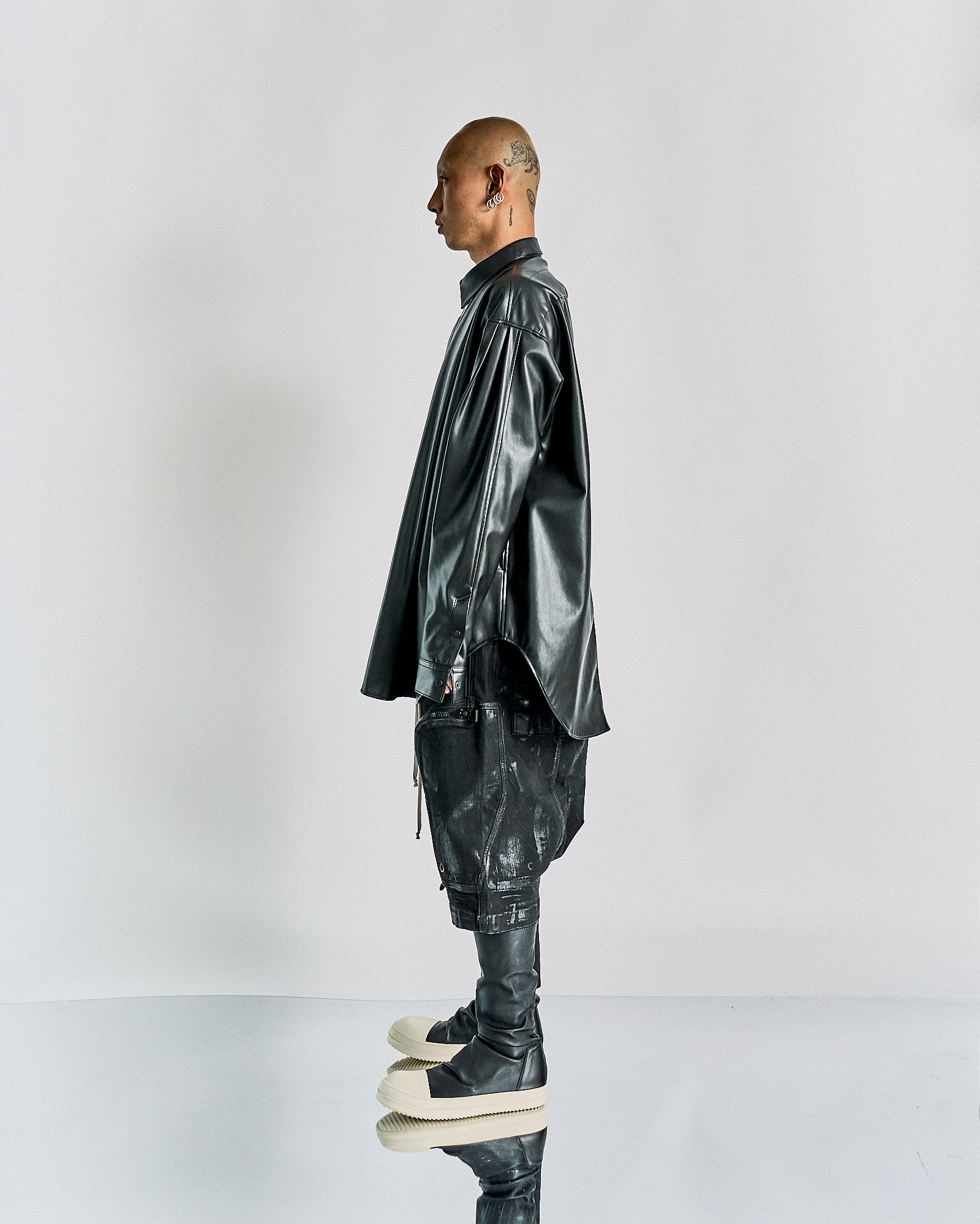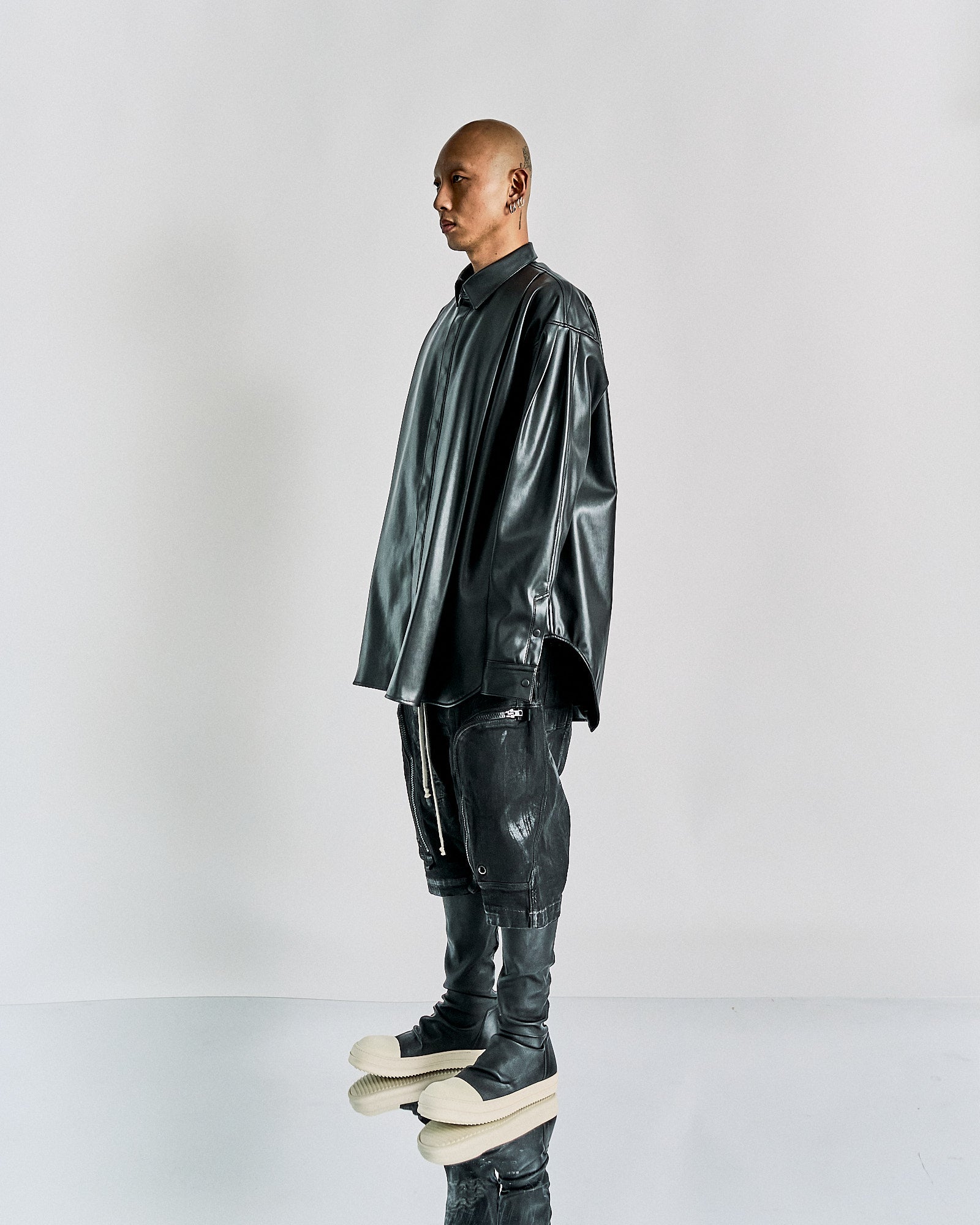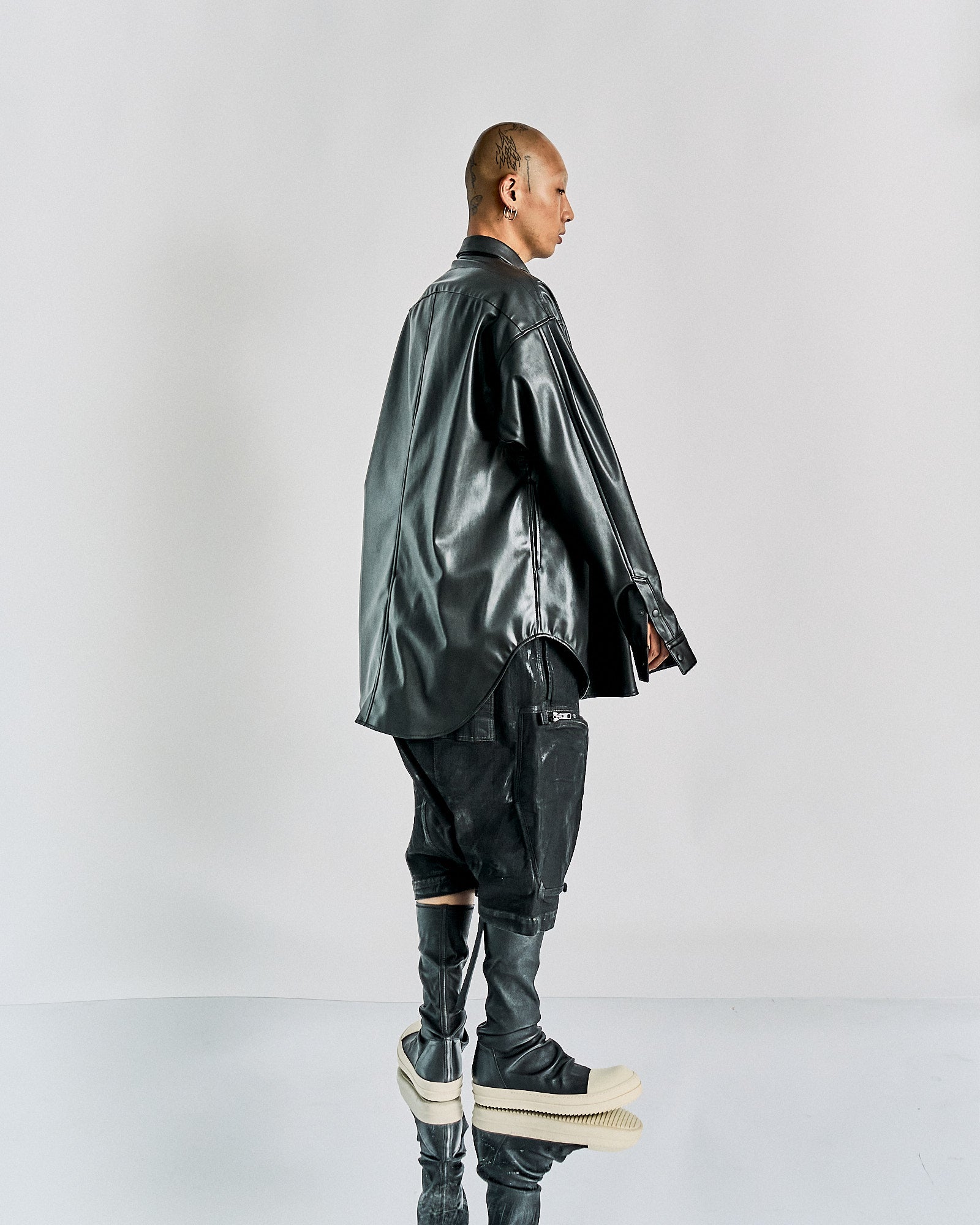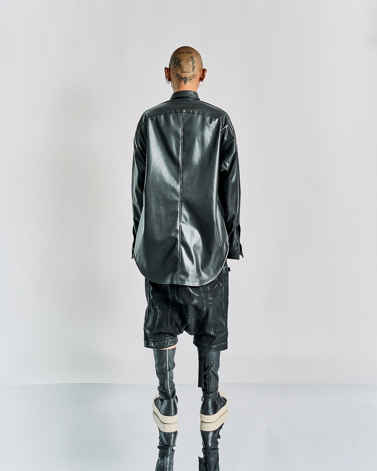 Boxy overshirt jacket in soft synthetic leather. Bold pleats through the body and sleeve provide a relaxed silhouette and comfortable fit. Features tonal press-stud closures, side pockets, full lining. Dry clean only
