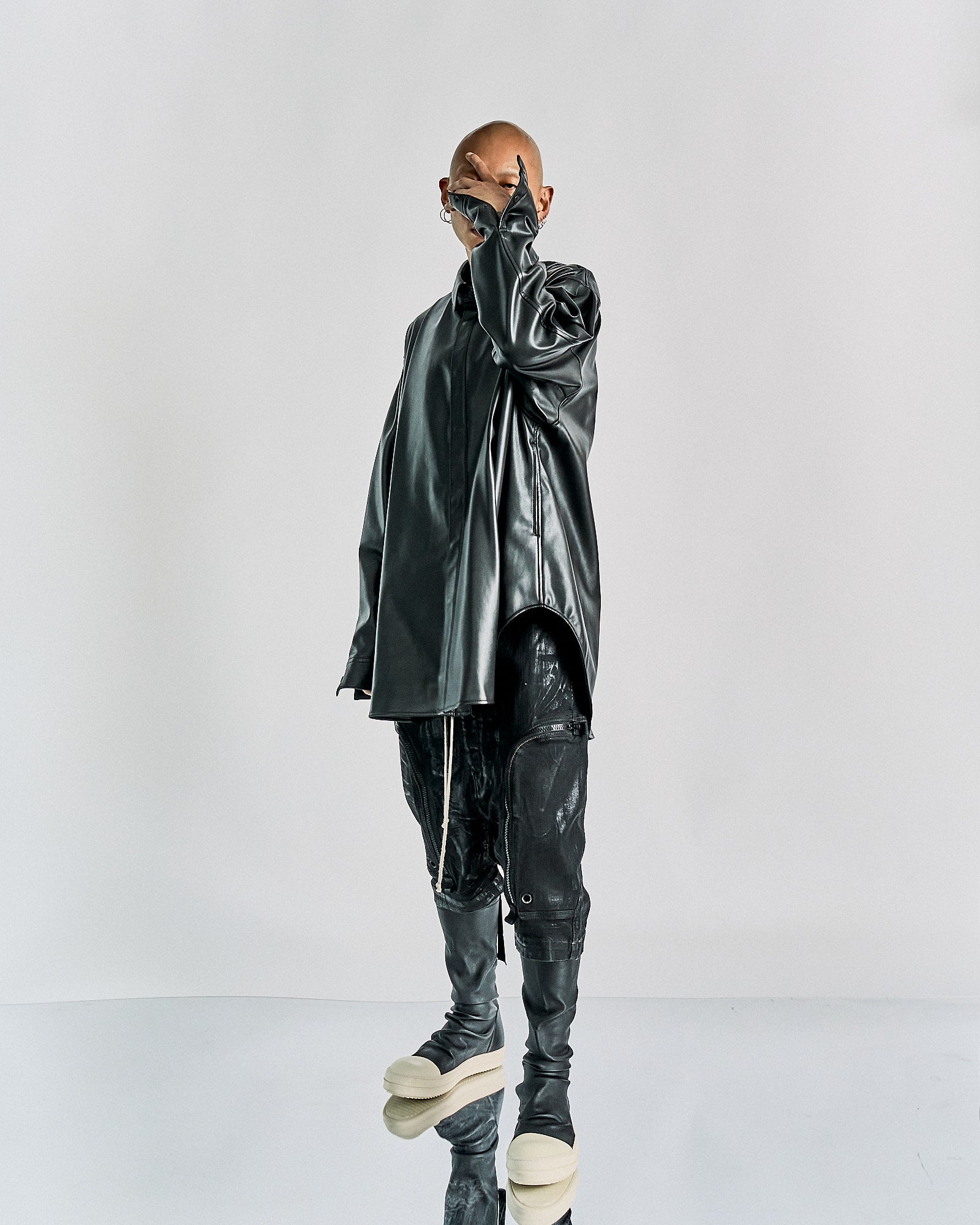 Materials _ Shell: Synthetic polyurethane leather. Lining: Cupro. Sleeve lining: 55% Cupro, 45% Cotton
