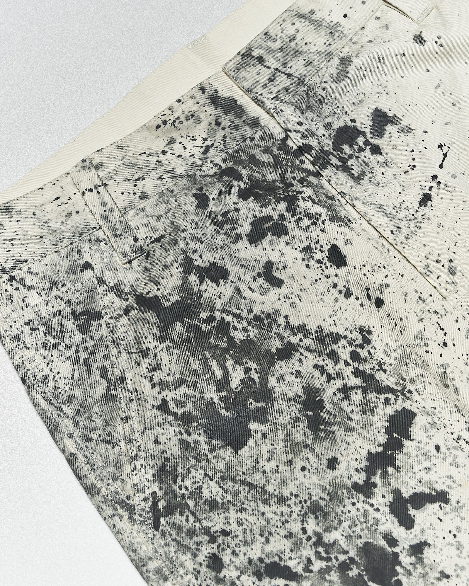 Slim paint-splattered trouser with hidden zip fly and button closure. Two side pockets, two back pockets, belt loops. Dry clean only.