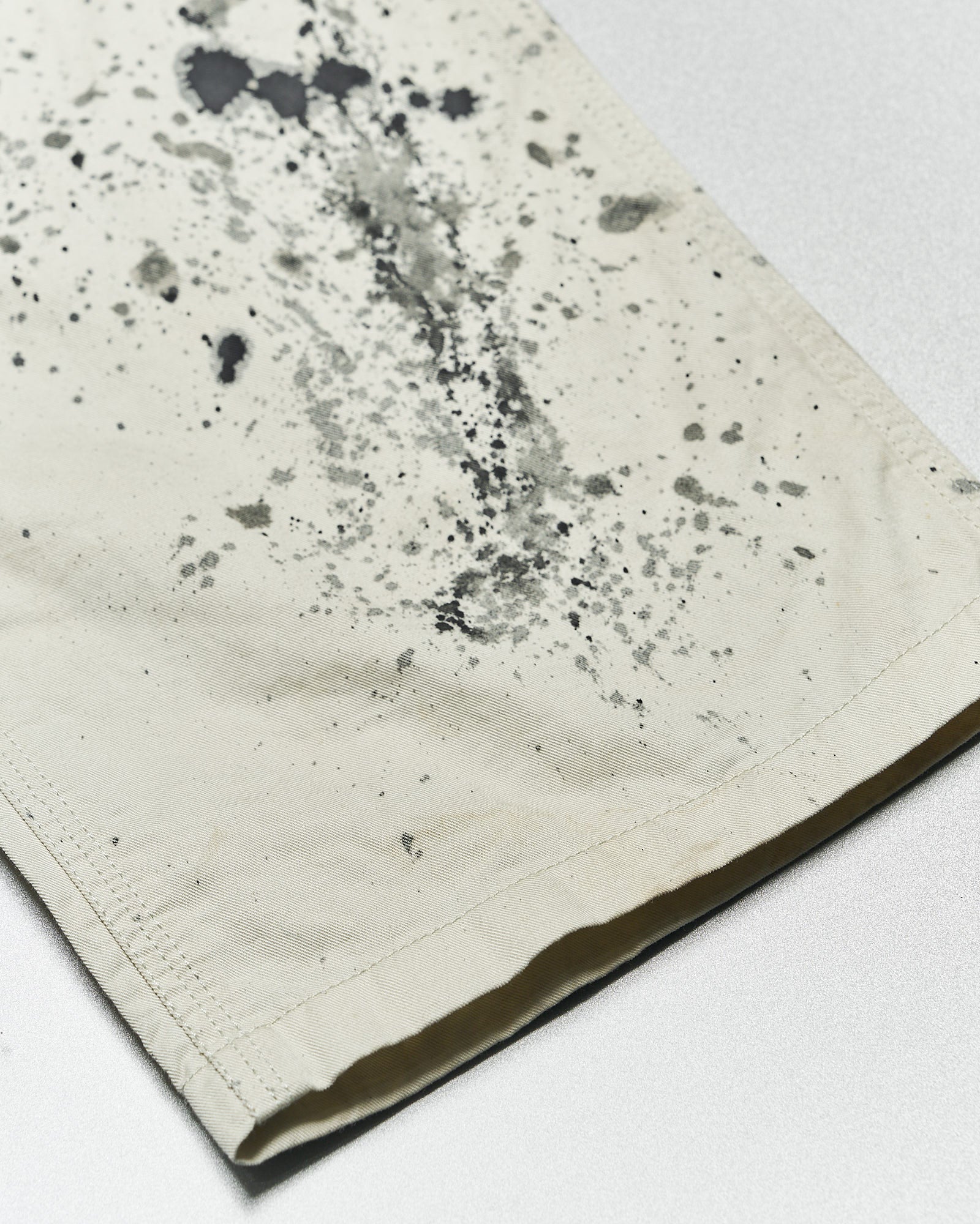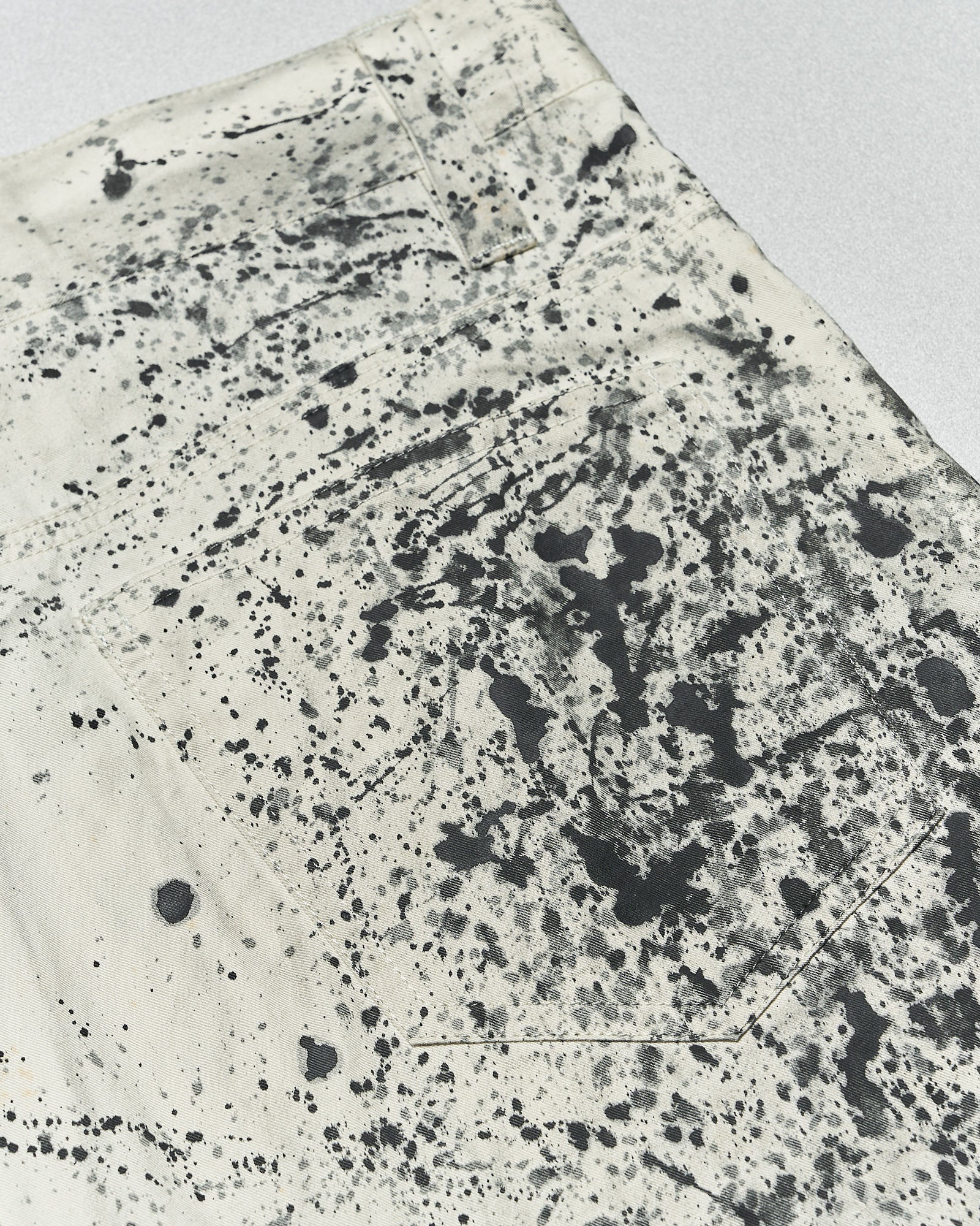 Condition notes _ Small brown stains on left leg which blend into the ink splatters, minor hem discolouration.